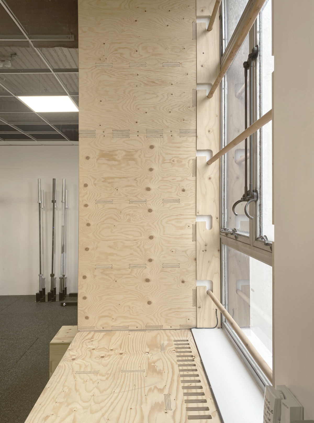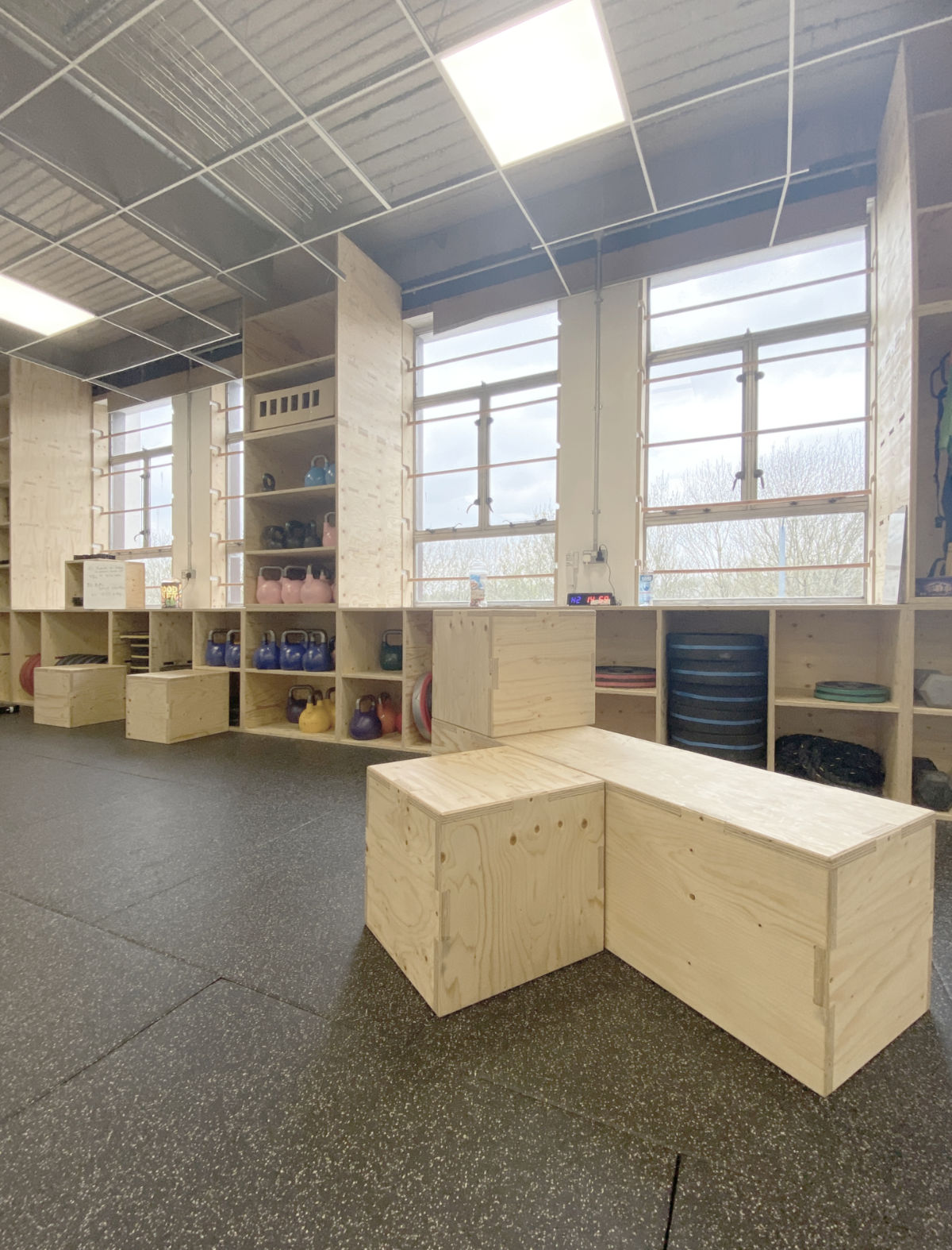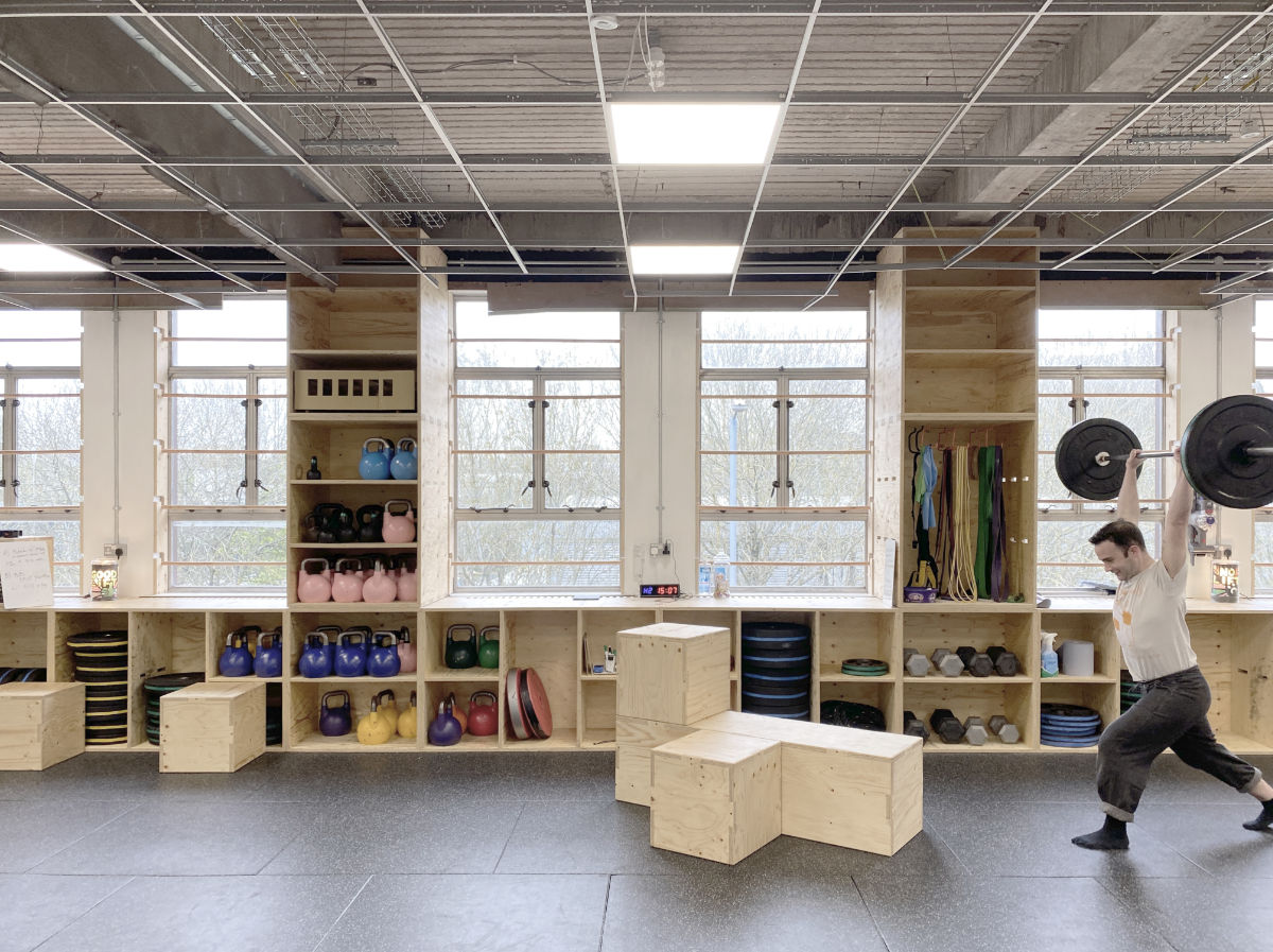 The Bristol Co-operative Gym have now completed the fit out of their new home on the third floor of St Anne’s House in Bristol and are enjoying the benefits of having a permanent, super-stylish home. Run strictly as a members co-operative and underpinned at all times by their founding aims of accessibility and inclusivity, the Gym offers a culture free from judgement and assumptions about identity and appearance. 2A1M Studio worked closely with the entire Co-operative to deliver an affordable, functional fit out based on legibility and adaptability and with a strong emphasis on providing opportunities for members to relax, chat and foster the unique culture and community at the heart of the gym. The former office space was rationalised and adapted, with existing assets such as the generous window façade and hidden shuttered concrete soffit revealed and promoted. The design provides deep textured reveals to the windows that identify the gym from outside. Unsightly services on the window elevation have been hidden inside an occupiable, deep storage wall, able to house the multitude of oddly shaped (and very heavy) equipment required for the free weight sessions.