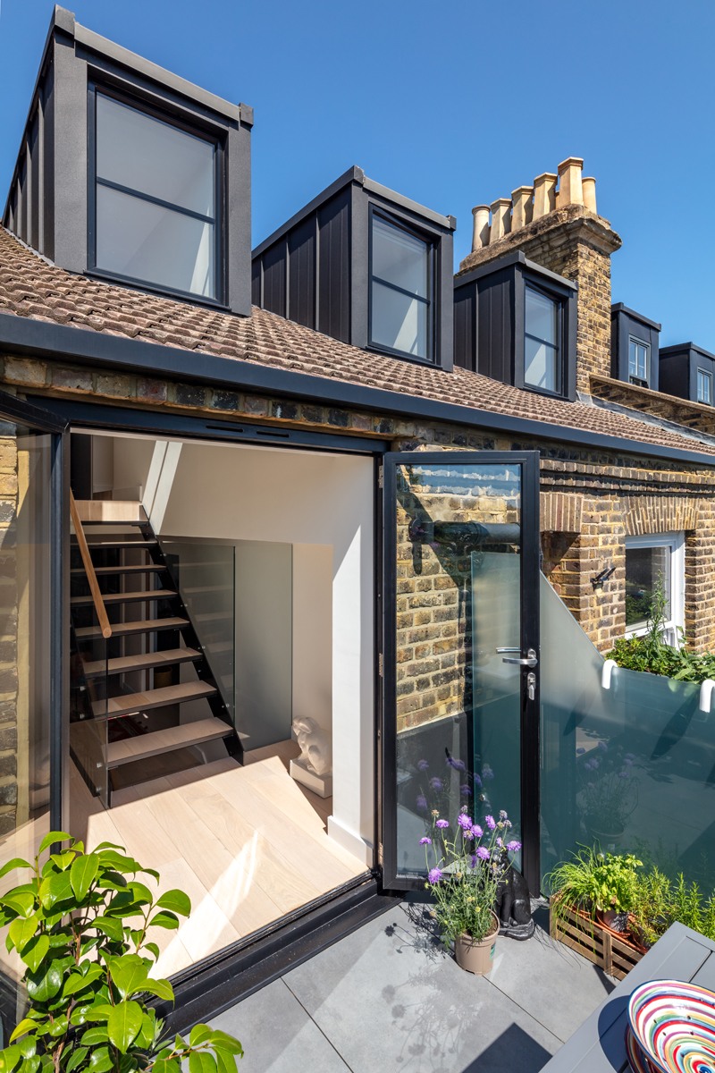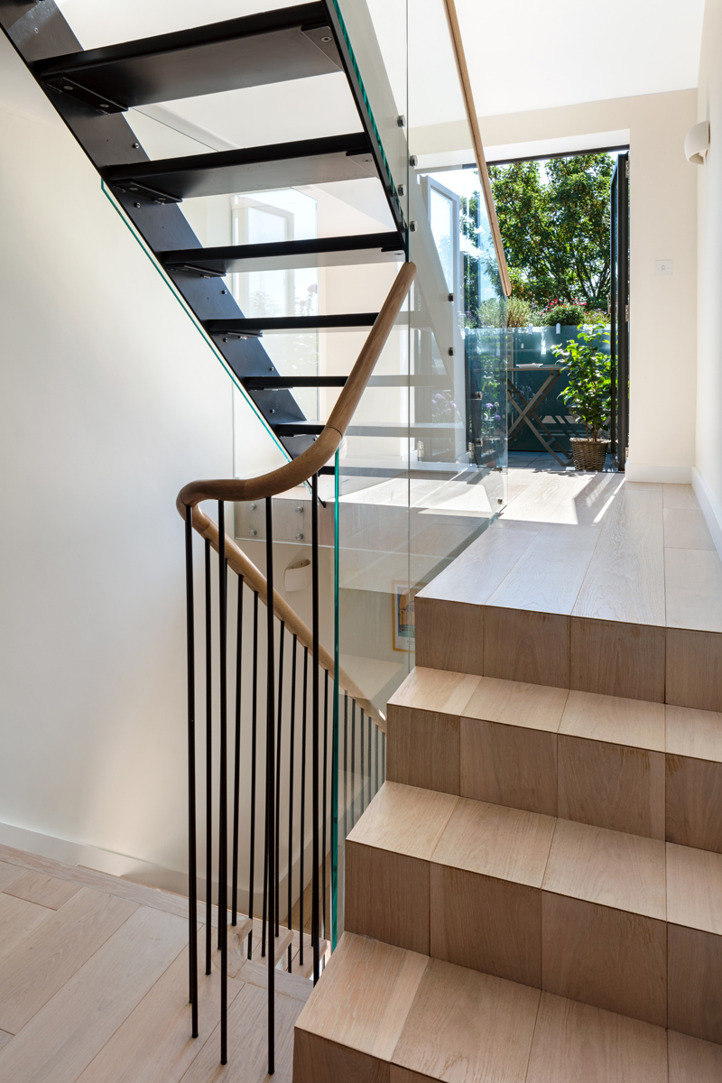 The complete modernisation of a Clapham Common apartment by creating an open-plan space, adding a loft master suite, and a roof terrace. The design focuses on connecting levels, maximising natural light, and respecting conservation area guidelines from the local authority Lambeth. The existing small cellular spaces where replanned to create a bright new open-plan family room. The apartment was extended into the loft and create a new master bedroom suite. A new roof terrace adds some much-needed private outdoor space. The stairs were central to the design, with a half-level introduced to maximise the connection to the new roof terrace. This layout enhanced natural light in the apartment's centre and better connects the living spaces together. The stairs transition from traditional metal balustrades to open tread steel with a glazed balustrade, distinguishing the old from the new.