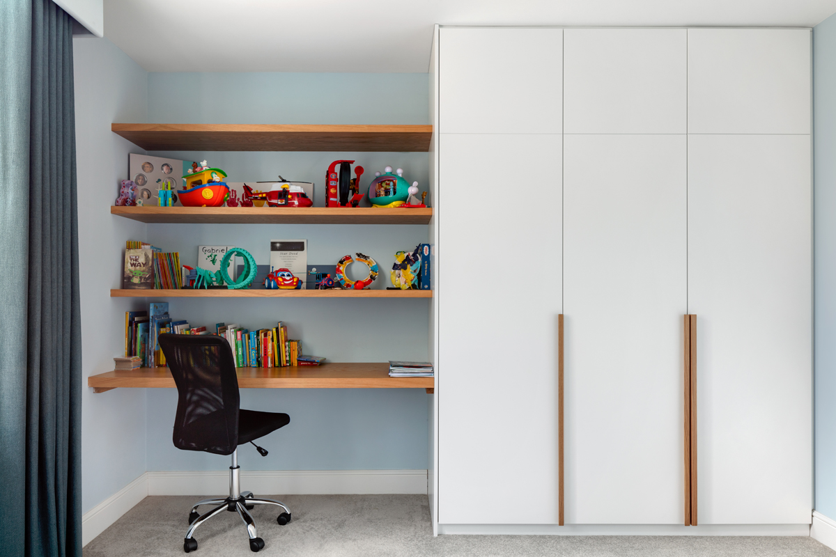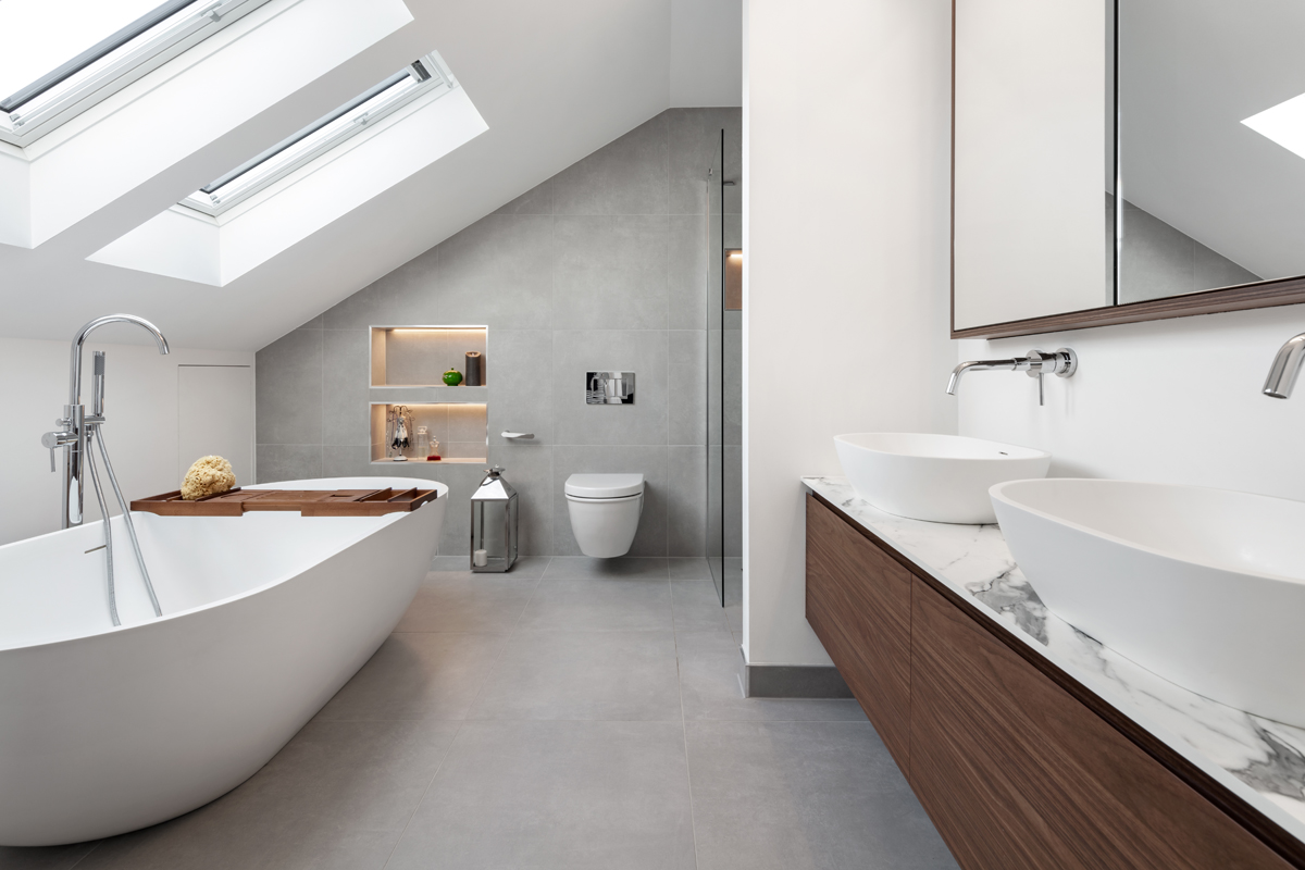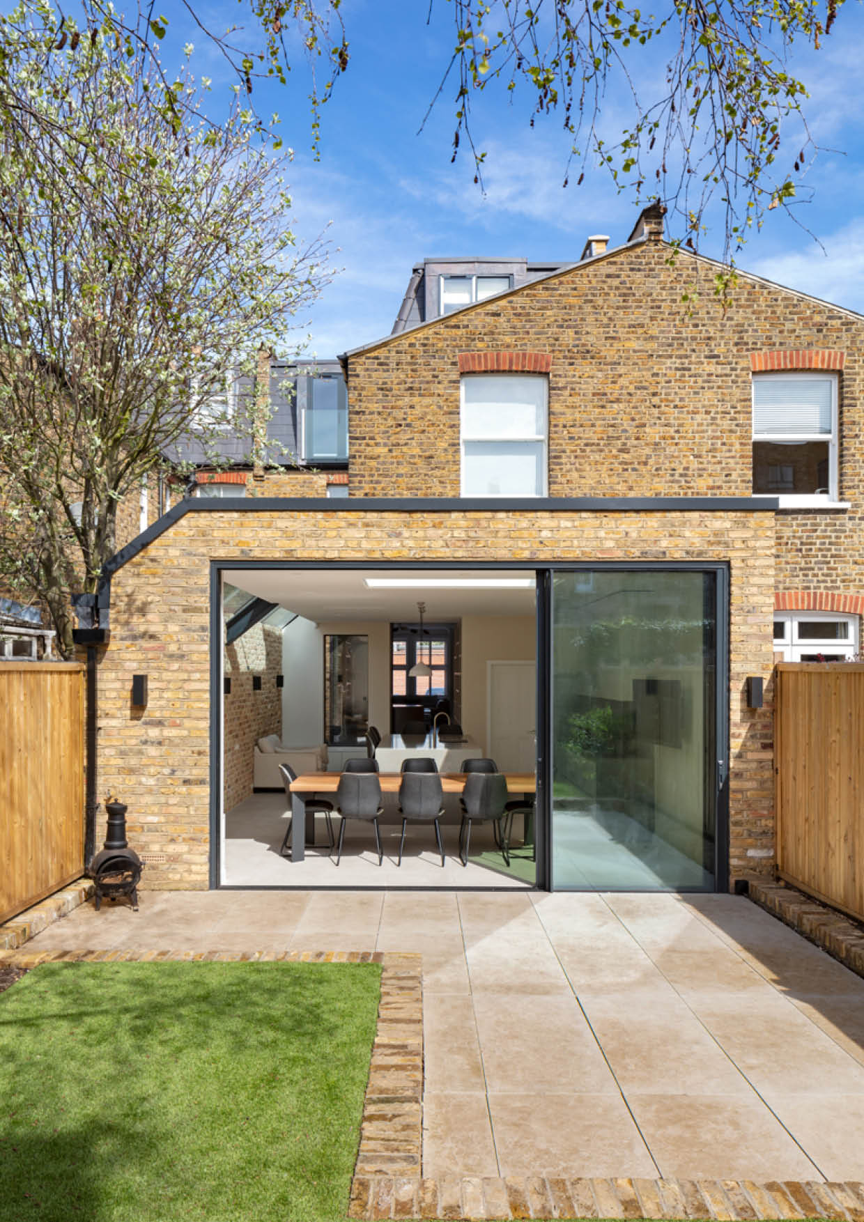 A modern family home in Wimbledon with a ground floor extension, loft conversion, and full internal refurbishment. The derelict property was bought by a young family of five, who needed space for entertaining, relaxation, and for the children to play freely. An open-plan ground floor was essential to accommodate their busy lifestyle and enjoy quality family time. The design features include a large rear and side return extension, with an open-plan kitchen and island perfect for entertaining. The dining area opens to the garden and a courtyard with bench seating, creating seamless indoor-outdoor living. A central courtyard with full-height glazing, floods the front of the house with natural light. The rest of the ground floor is zoned, with a comfortable front living room for relaxation, and a casual dining area for the kids to work or play. Relocating the staircase was the key architectural move and allowed for a more flexible space-saving layout. The loft extension creates a master suite with a bedroom, bespoke wardrobes, and a luxurious en-suite. The en-suite features marble and walnut finishes, with a freestanding bath positioned under the roof lights.