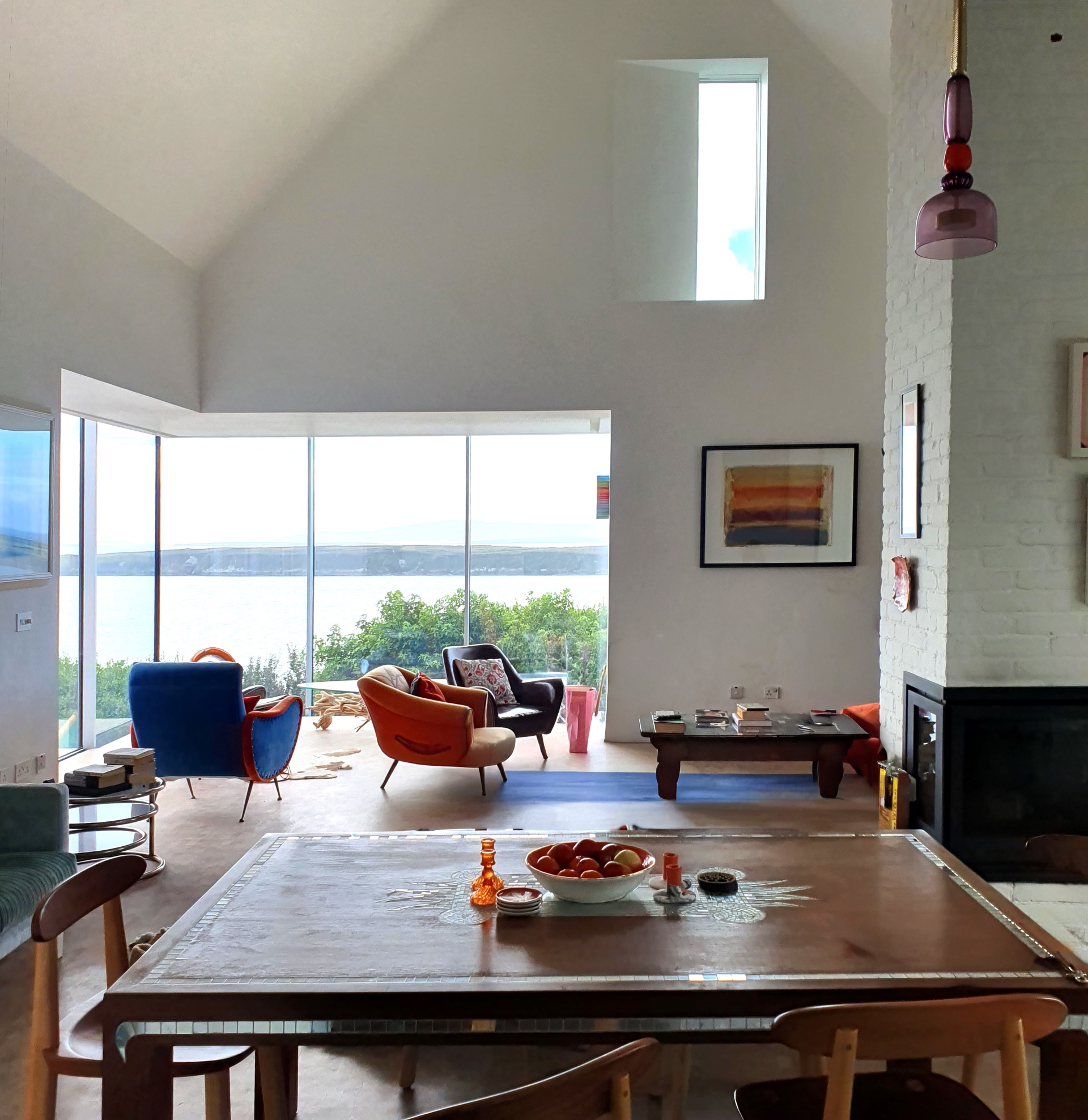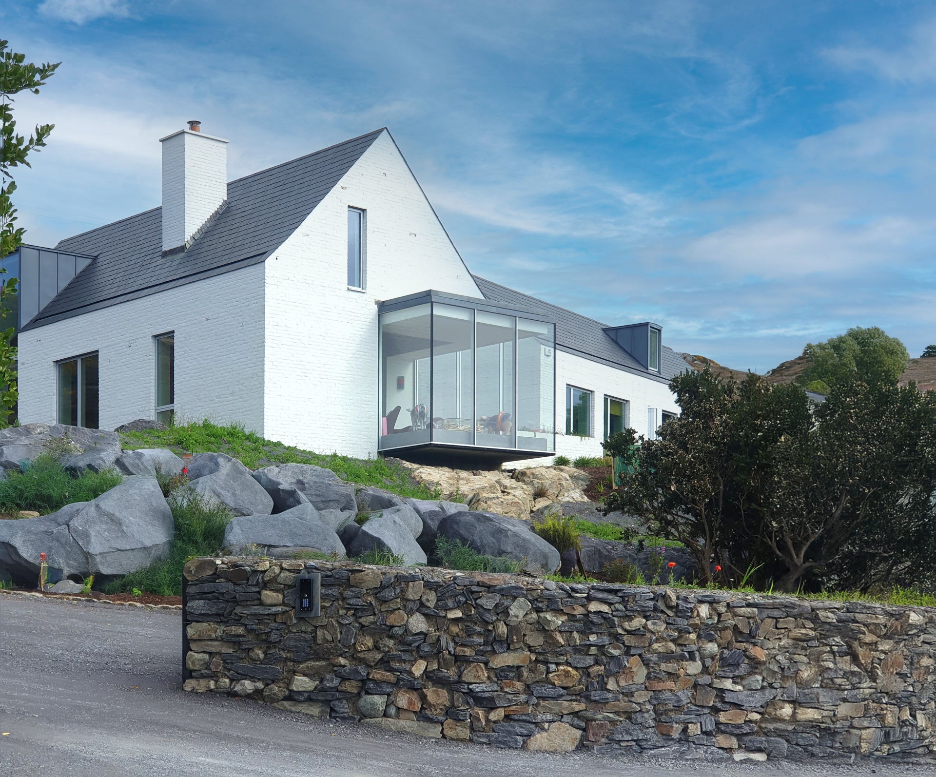 The 1.4-hectare site on a south-facing hillside enjoys panoramic views of the Irish Sea coastline from its elevated position above the access road. The Atlantic House comprises a three-bedroom house of 2,500 ft2, including an upstairs library and master study, both contained within the volume of the internal open roof space. The footprint of the house responds to its orientation, creating courtyards sheltered from prevailing winds and fitting into the existing contours of the site by balancing cut and fill on the very steep site. The house consists of two gabled buildings with slate roofs and whitewashed brickwork. The larger building houses the living/dining room, kitchen and library while the smaller holds the three bedrooms. They are linked by a sinuous flat roofed volume that forms the circulation and service areas: entrance hall, plant room, guest WC, storage areas and an internal sun-room that opens onto an external south-facing terrace. Several corner windows are expressed within the façades. The master bedroom corner window opens to the east and south for morning light and views. The living space is completed by a 3-sided glazed box which has been located at the point on the site which offers a 270-degree view of the sea and offshore islands.