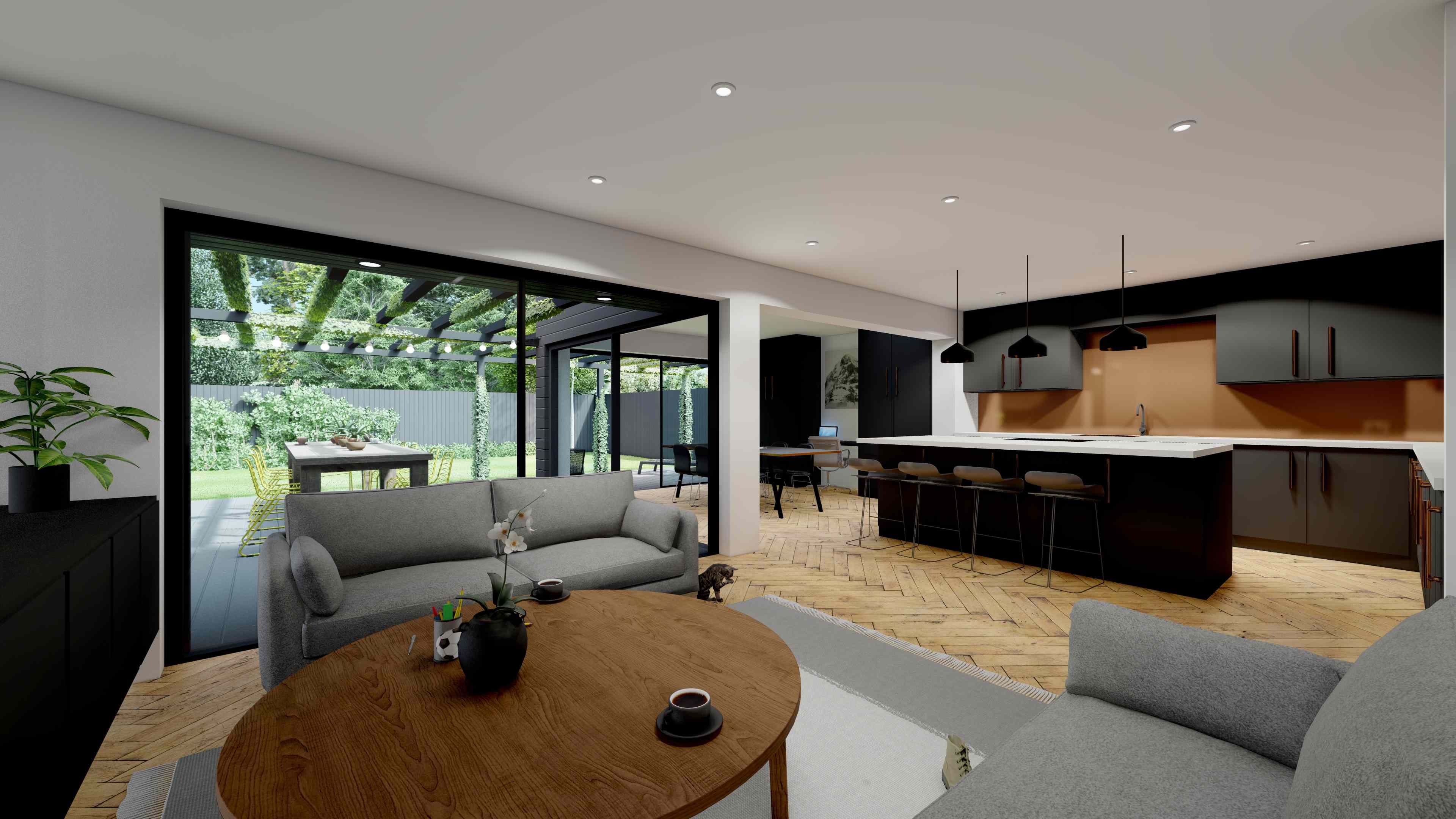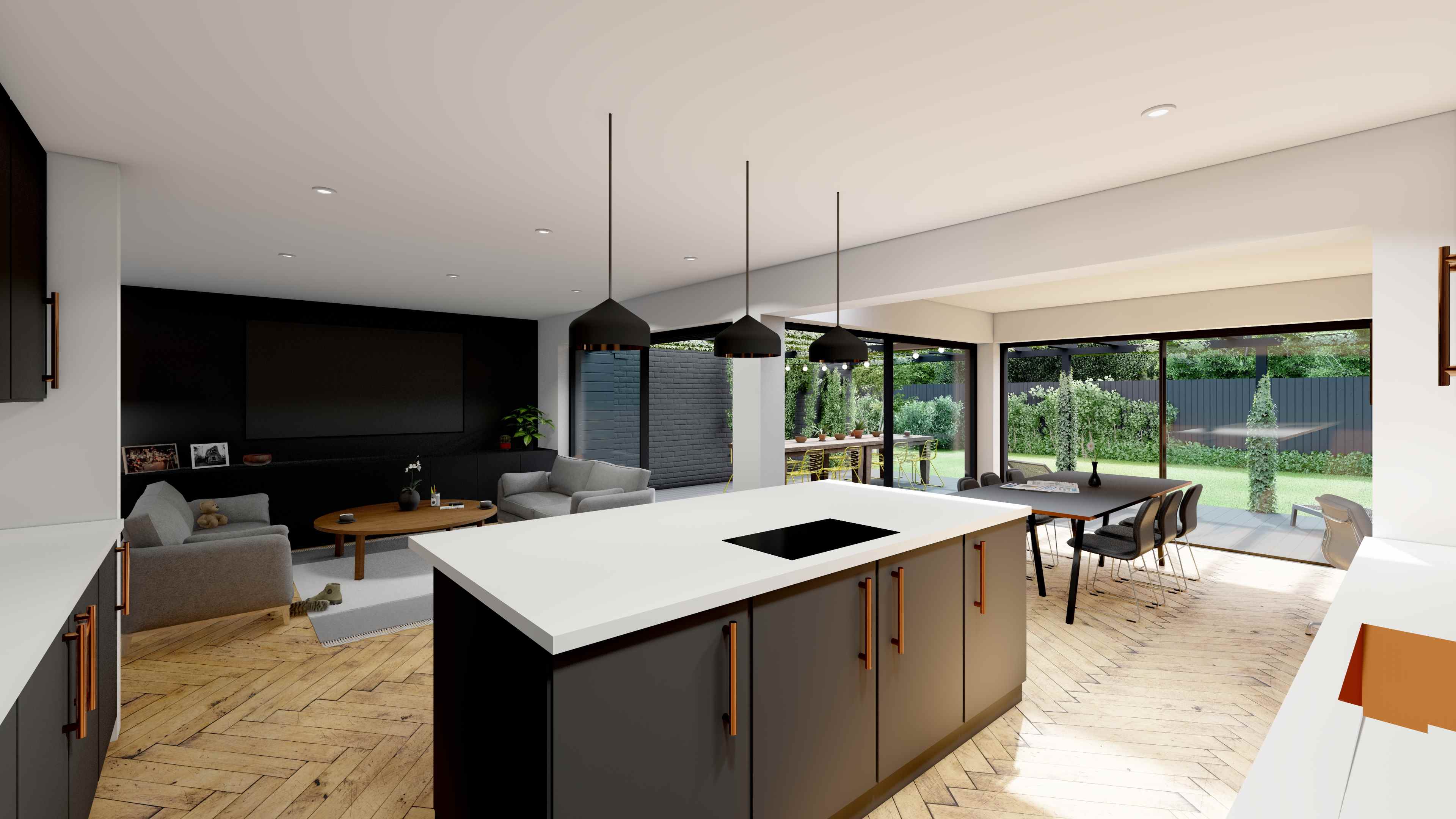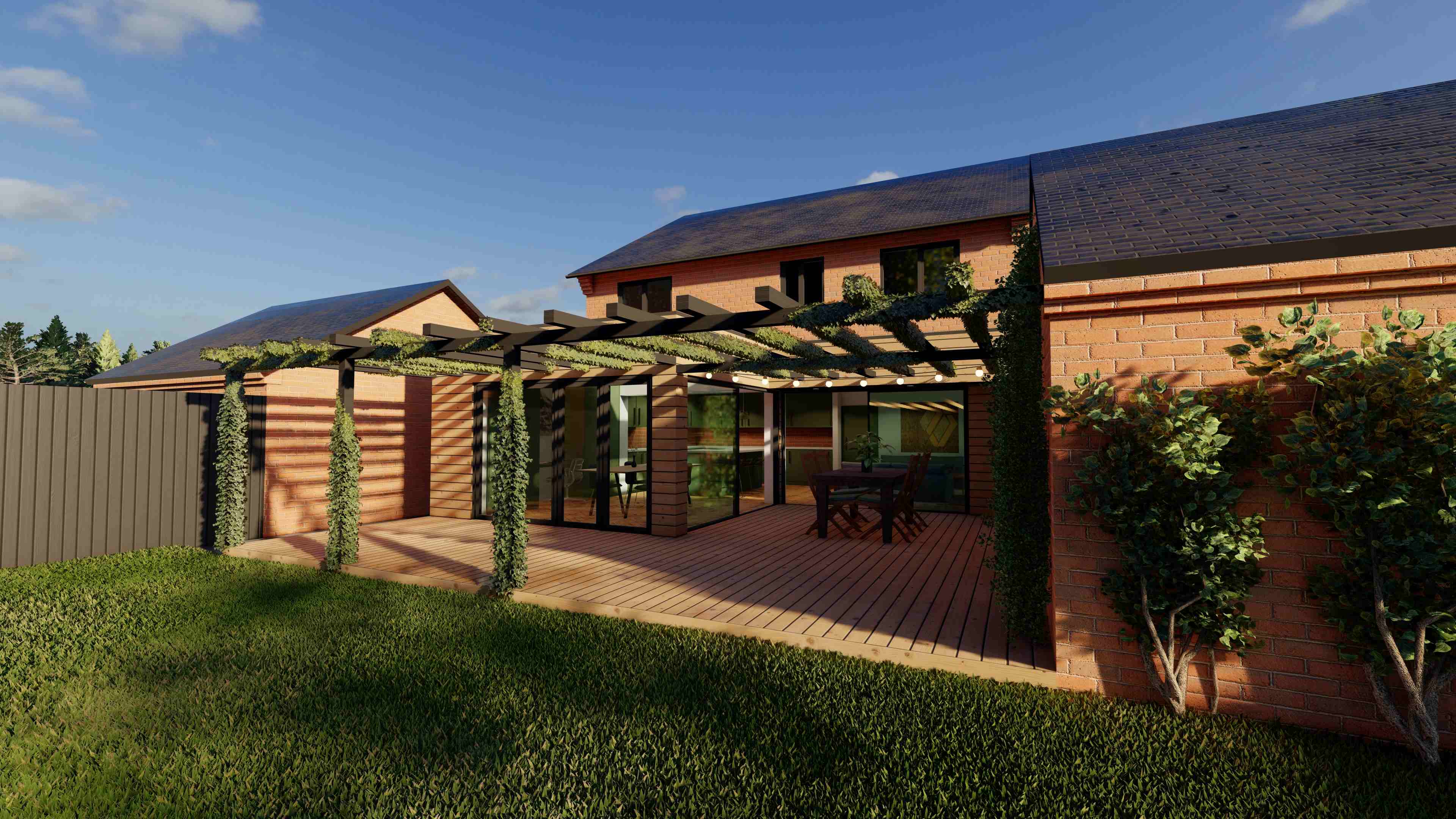 The challenge: A disjointed new build layout and an underused rear garden left the home feeling disconnected and uninspiring. The client initially envisaged a full-width extension to create more space and better flow—but budget constraints and planning considerations required a more creative solution. Our approach: We reconfigured the internal layout, relocating the kitchen and creating a light-filled open-plan living area. Instead of a full-width extension, we designed a smaller, cost-effective addition. A bespoke pergola was introduced to visually square off the rear elevation, creating the illusion of a full-width extension while framing an inviting outdoor dining space. The result: A cleverly reimagined home with fluid connections between inside and out—perfect for modern family living.