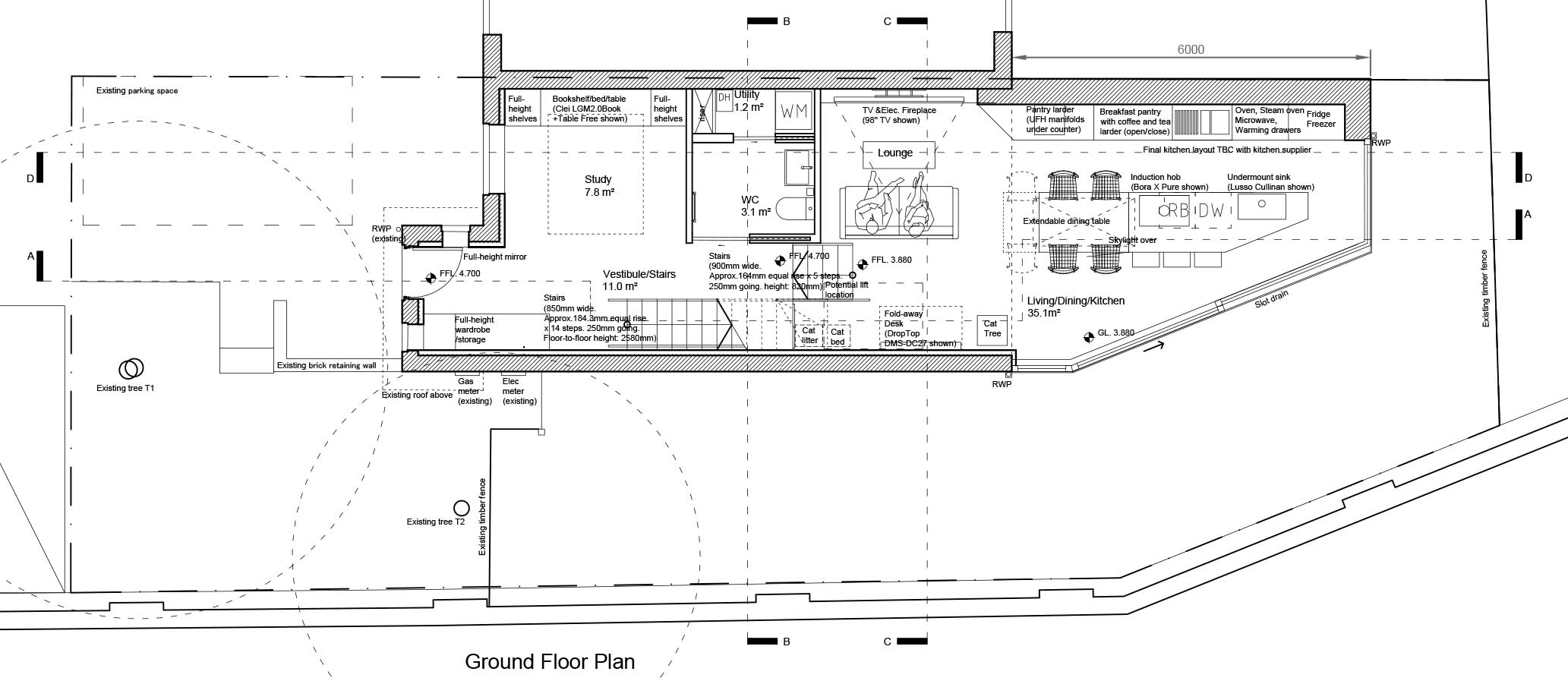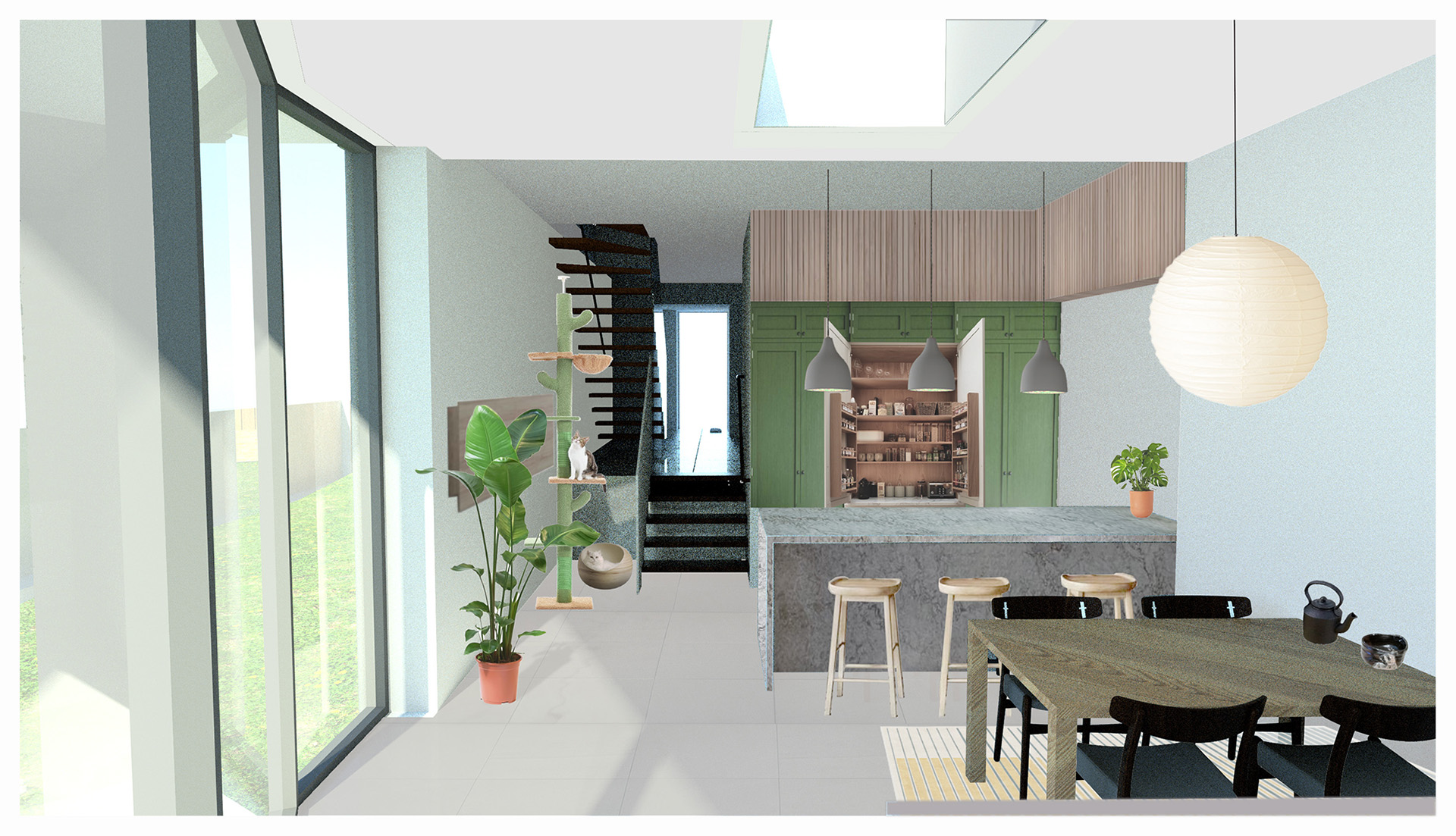 This project is a comprehensive extension and renovation of an end-of-terrace house in Limehouse, close to Canary Wharf. Our brief was to transform a modest property with low ceilings and limited daylight into a highly efficient, spacious and sustainable family home, designed to perform close to the Passivhaus EnerPHit Standard. The project began in early 2023 with a two-storey side extension and a 3-metre rear extension. Although planning permission was granted, the proposal was affected by an easement relating to a Transport for London retaining wall along the site boundary. After several months of negotiations, the design was redeveloped with a more compact footprint that avoids the easement while maintaining the ambition for a high-quality, low-energy home. We have now secured approval for a 6-metre rear extension through Prior Notification under permitted development rights and are progressing with the technical design. The extension forms a generous living/dining/kitchen space opening onto the south-facing garden through full-height sliding glazing. To create a sense of spaciousness with a higher ceiling, given the existing 2.3-metre ceiling height, part of the ground floor is lowered, creating a bright, tall and flexible heart of the home. The chamfered plan responds directly to the easement boundary, and the interior layout is arranged to maximise efficiency and intuitive flow within the constraints. Sustainability is embedded throughout. The scheme incorporates an air-source heat pump for heating and an MVHR system for ventilation based on Passivhaus principles. A green roof on the extension enhances biodiversity and reduces heat gain. The extension is highly insulated, and the existing fabric is upgraded with internal insulation. Triple glazing, carefully considered shading via retractable awnings, and south-facing solar access work together to ensure comfort across seasons. PV panels were also developed as part of the energy strategy, although these will be submitted separately for planning reasons. The project is expected to commence on site early next year.