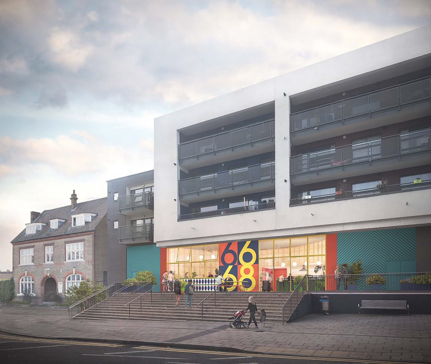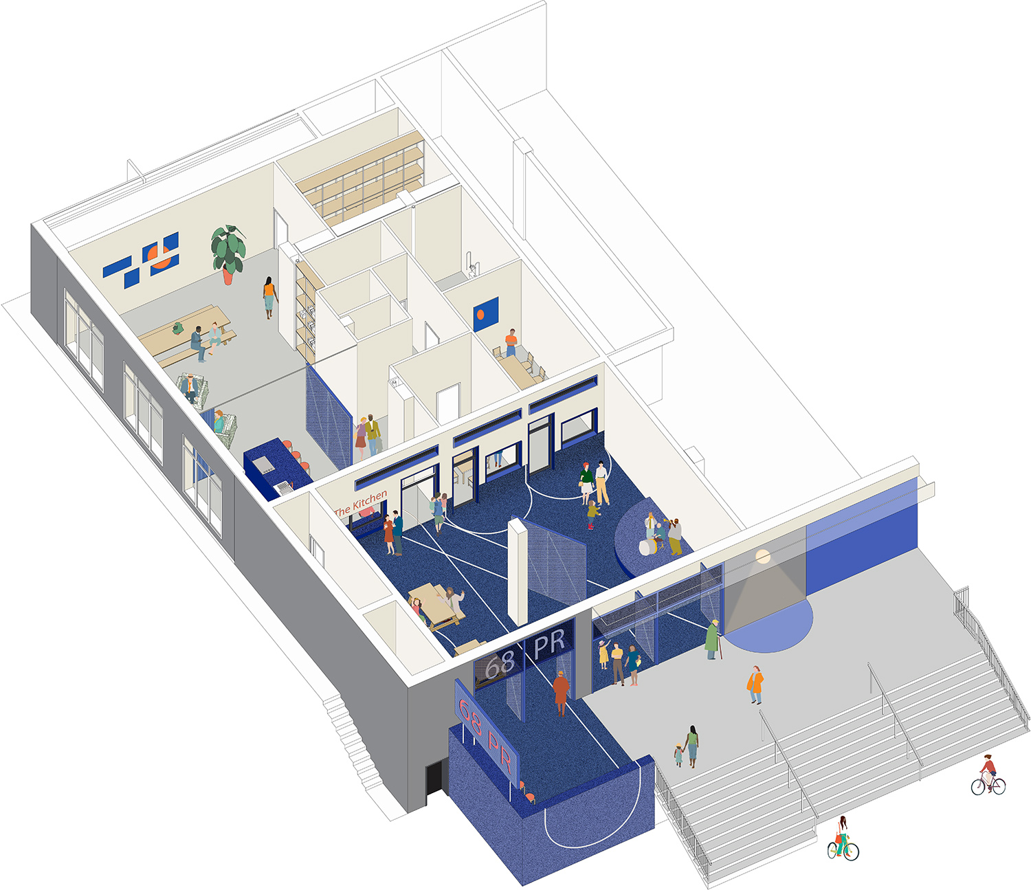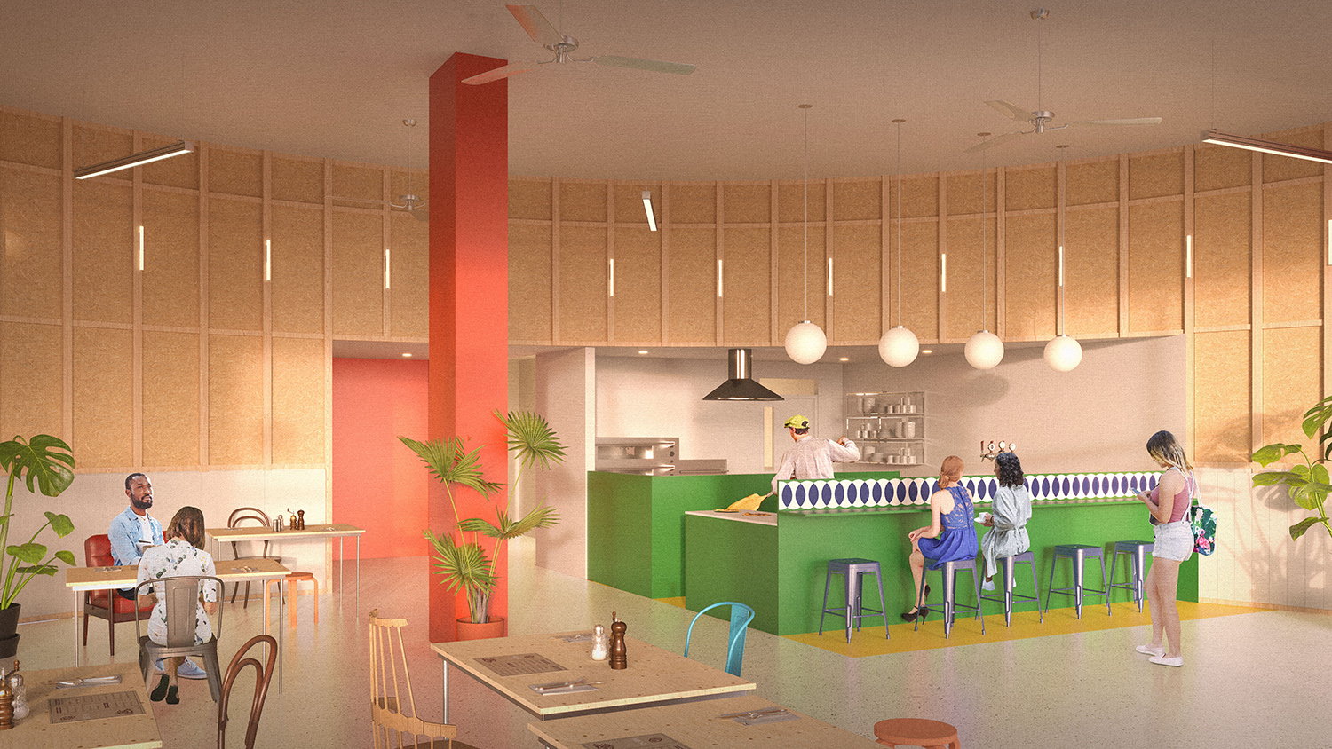 Transforming two vacant commercial units into an affordable, temporary community kitchen for Bexley Council, this lively shared dining space injects life into the wider area with shopfront-visible activity and vibrant colours, underpinned with sustainable, demountable and re-usable construction.
