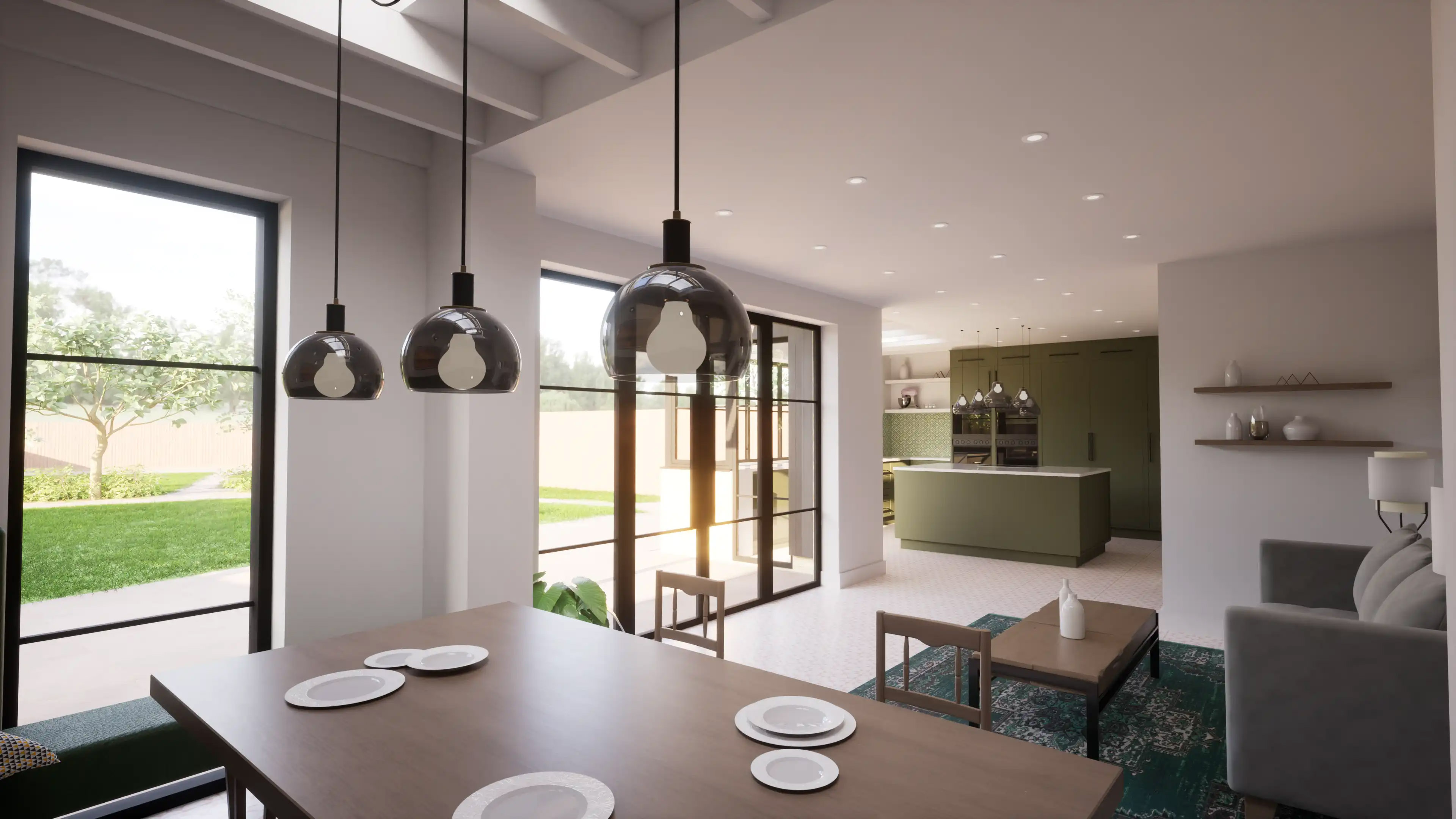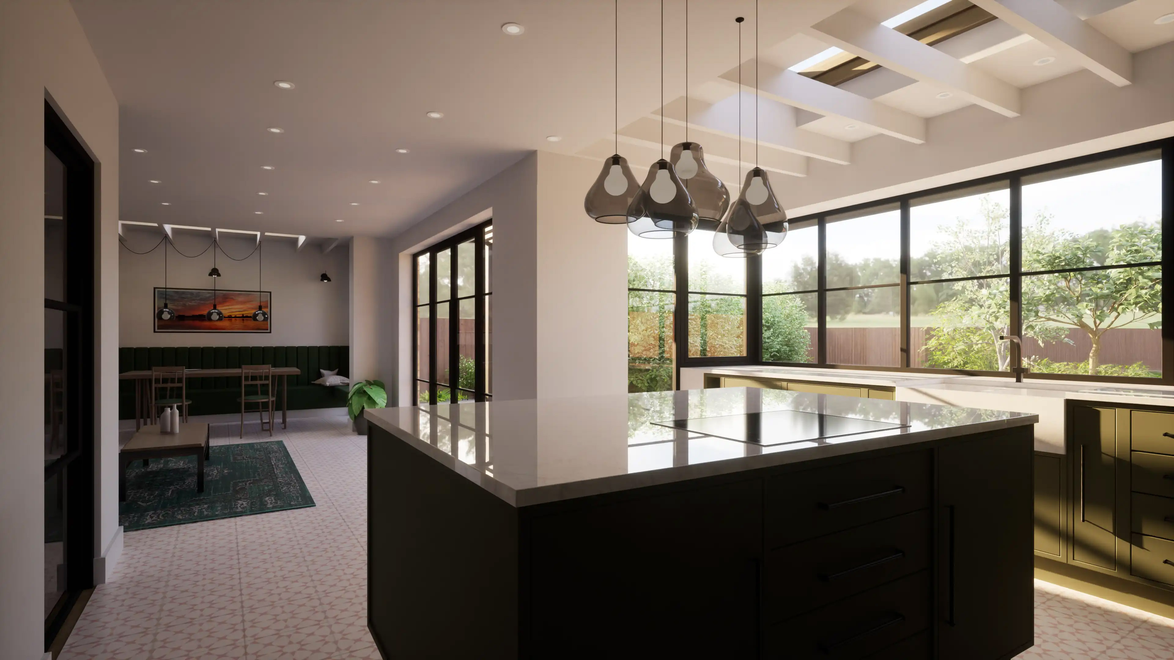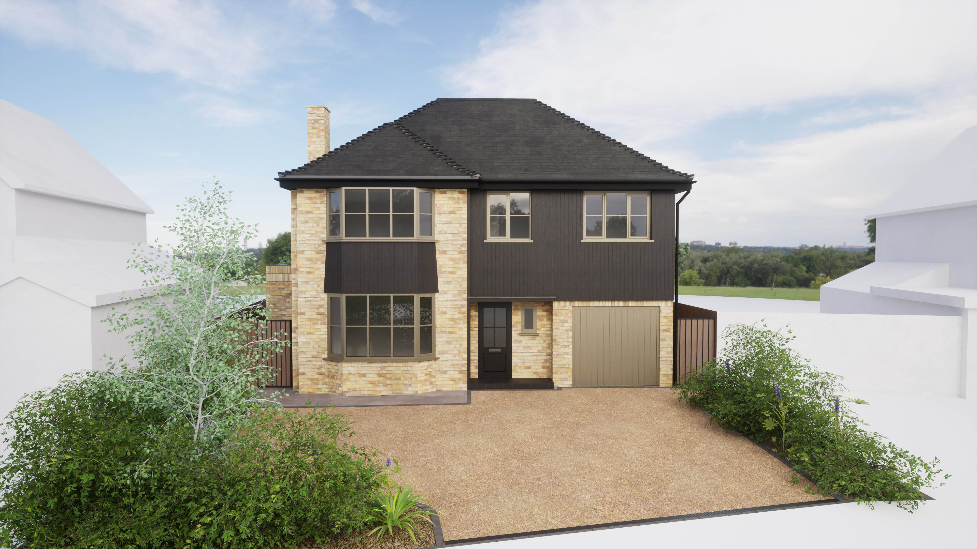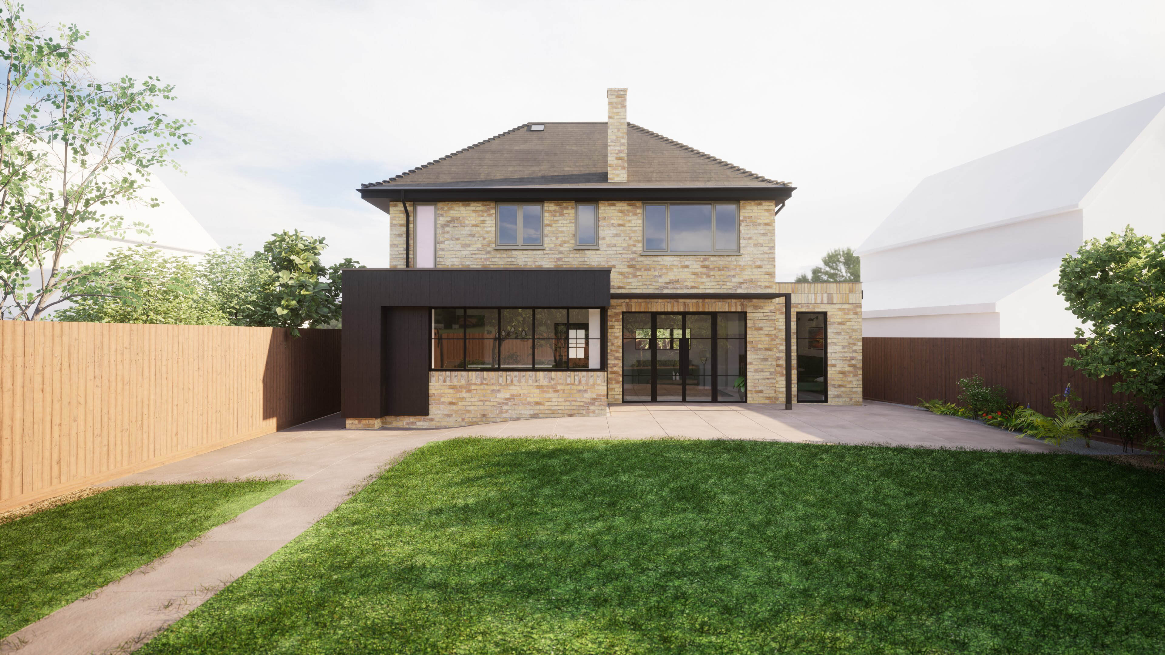 arch/FORM were approached by the client with an exciting design brief. They were seeking to create a new bedroom and en-suite, expand the existing bathroom, and opening up the rear of the home to create an open plan kitchen - living - dining arrangement. They were also looking to re-model the home and update each of the rooms to add their personality to the spaces. We worked with the client to develop their brief further and through discussion additional features included solar shading, modernising the glazing arrangements, an air source heat pump in tandem with MVHR (mechanical ventilation and heat recovery) and an updated, more private driveway were added to the scope. We achieved this be extending the front of the house over the existing garage to create the new bedroom and en-suite, making the most of the existing footprint. We then extended to the rear to create the additional space required for the clients desired kitchen specification. Design cues were taken from the client's desire for crittal style glazing in the open plan space which we married up with dark timber cladding. This was then introduced to the front elevation to make the extensions and renovation cohesive. The new rear extension opts for an exposed rafter design, adding character and visual interest to the ceiling, echoing the solar shading which sits on the rear patio. We then tied this through to an existing extension to the house, which was to be re-roofed to provide an increased level of insulation and remove the existing felt roof.