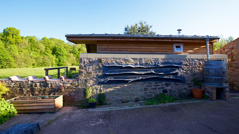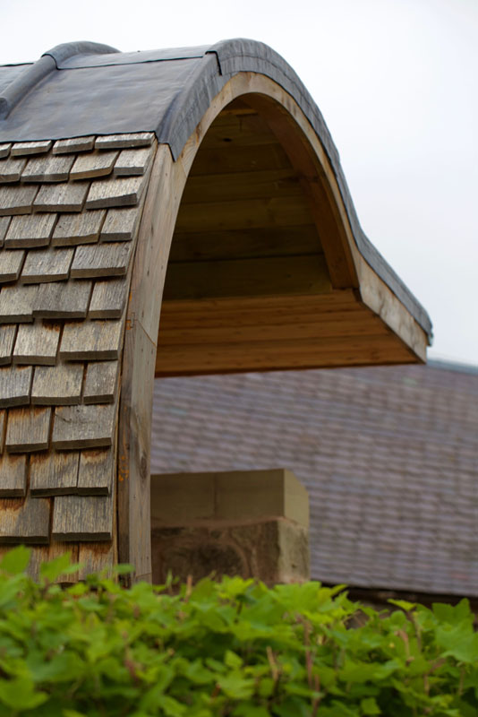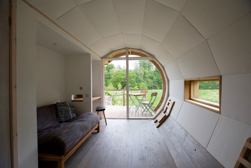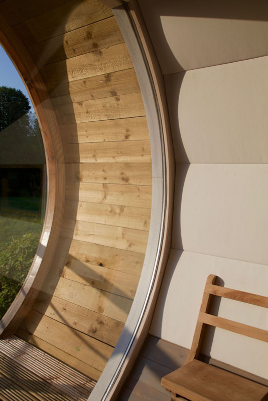A self contained guest room within the garden of a sculptor and a quilt maker. The form and materials of the building make references to the clients' work. The building sits adjacent an existing garden wall with its roof peeking above it. Next to this wall is the entrance, a tea making area, toilet, desk and recess for a bed. A curved, laminated timber structure forms the main body of the room. It is lined externally with timber shingles and internally with linen covered panels. One window, opposite the bed, looks into the garden. The south facing glazed end looks out to a covered seating area and to the fields beyond.