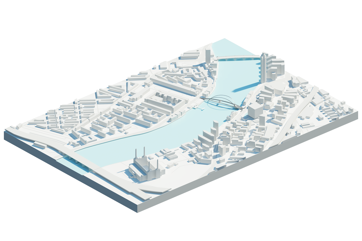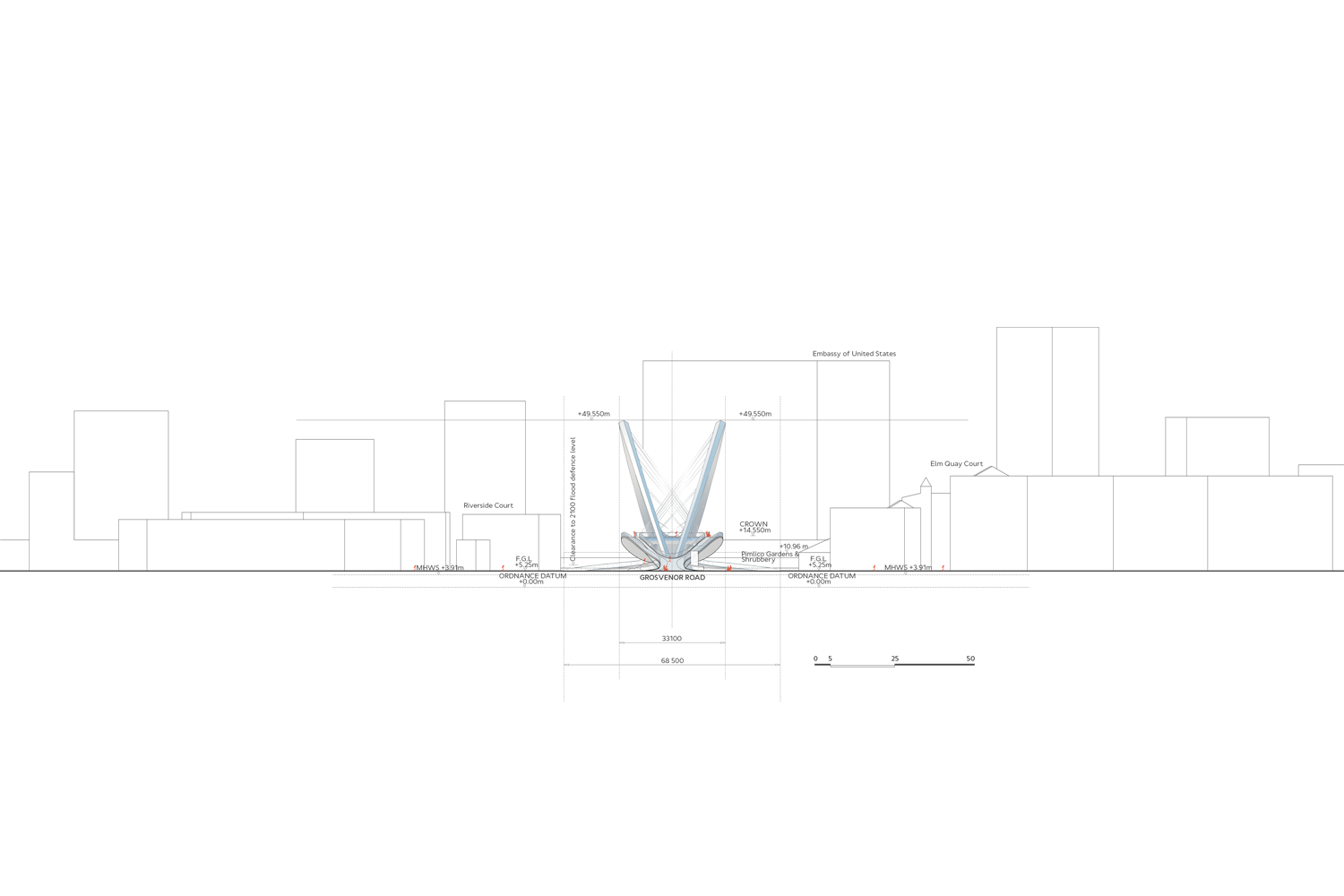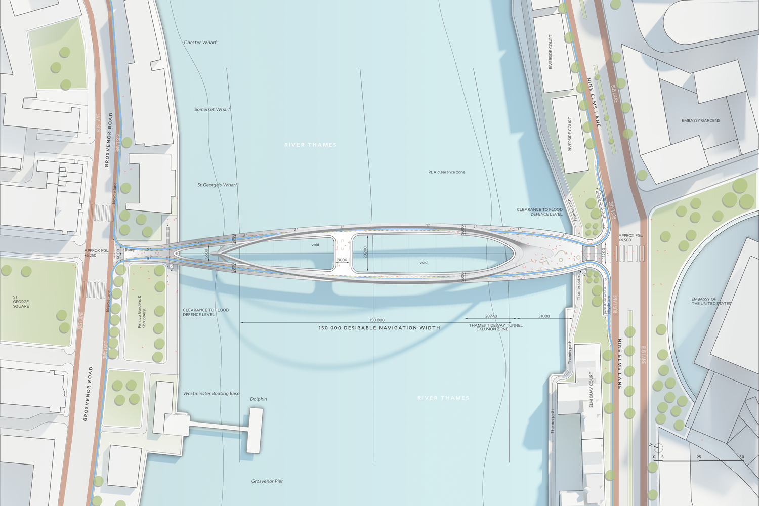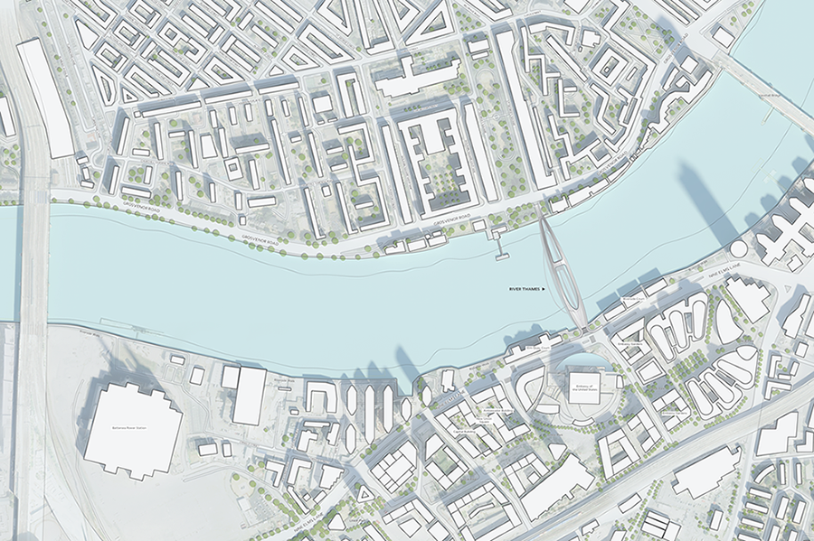 The Nine Elms - Pimlico Bridge: The Clip The new link between historic Pimlico and the cutting-edge development at Nine Elms should express the city’s ambitions for those neighbourhoods and for London as a whole. On the south side, a gateway that will define a modern development; on the north side, a seamless entrance to classic Pimlico and Victoria beyond. Over the river, two asymmetrical arches gracefully soar over a continuous loop – a striking geometry that refers to London’s other bridges while reproducing none of them. Dedicated cycling lanes mean that The Clip will become a vital artery for commuters. The separate pedestrian paths and public realm frame new perspectives on the city making it a place to linger, meet friends and enjoy the view. The vertical arches and the horizontal loop frame vistas east and west towards the London Eye and the revitalised Battersea Power Station. Separation of the walkways results in a different viewing experience, through the loop at passing boats and out towards the city. The design is sensitive both to the white stucco-fronted Regency architecture of Pimlico, and also to the sculptural and innovative ideas of the new Nine Elms. The cycle lanes are accessible through ramps, while there are segregated ramps and lifts for pedestrian and disabled users. The landing points touch lightly on either side forming a safe and seamless transition for all users. With its unobstructed views and spacious walkways The Clip will become an attraction for both Londoners and visitors.