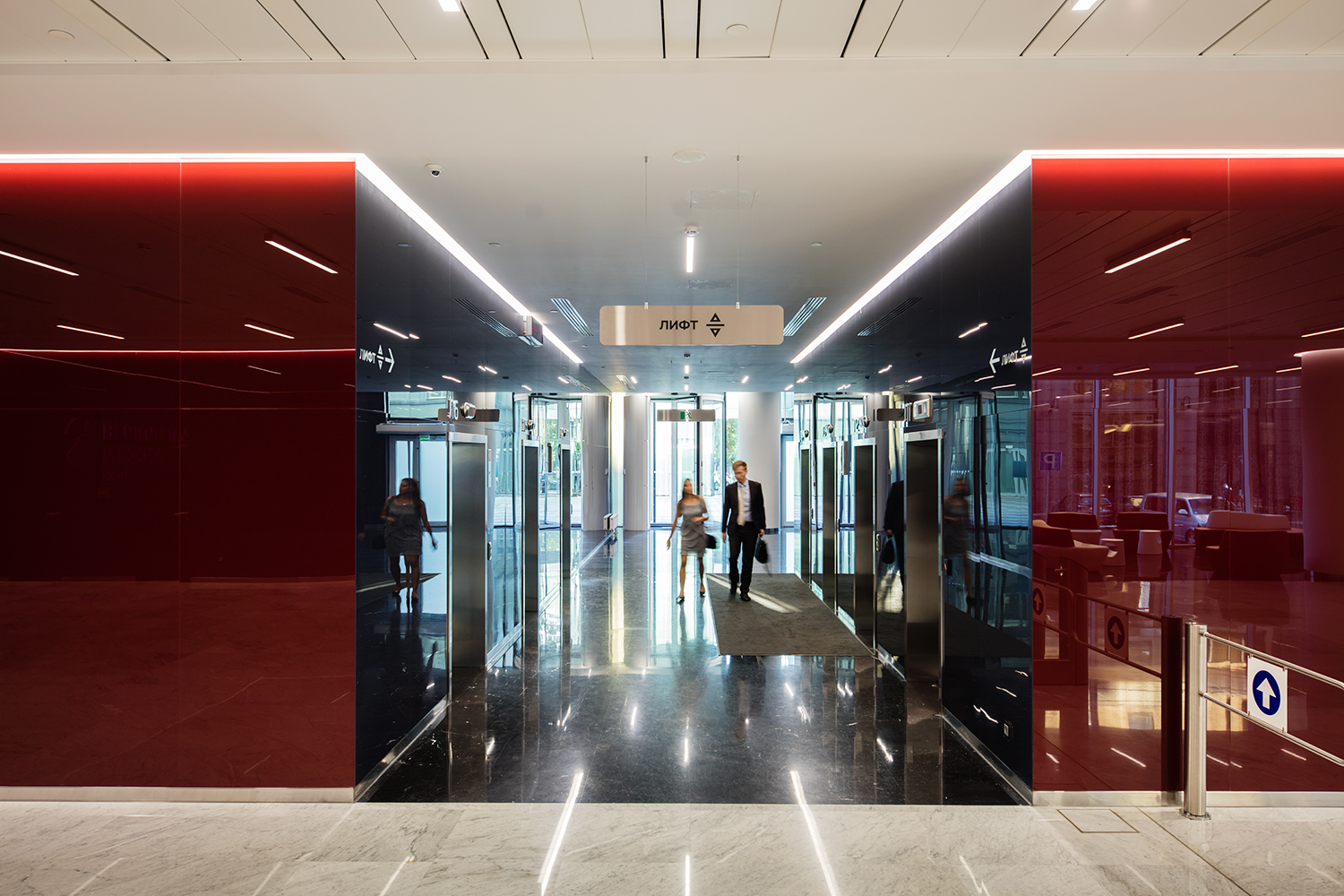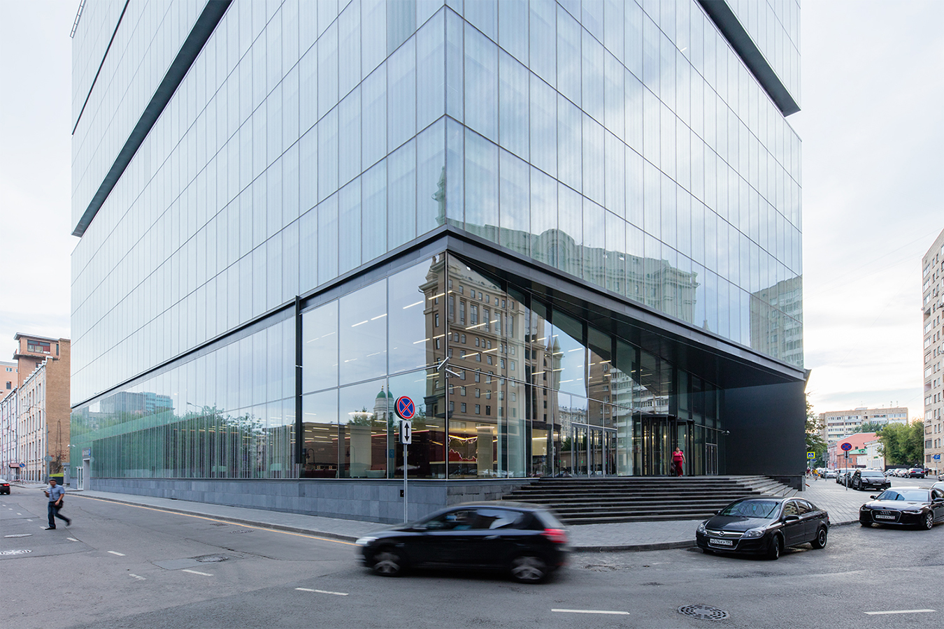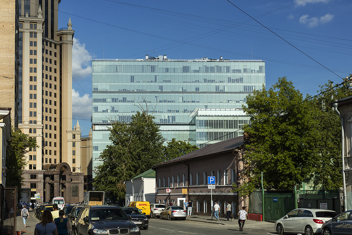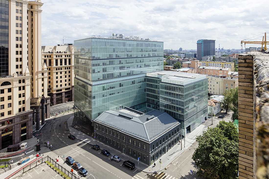 The practice was commissioned to build a corporate HQ for a prestigious national company in the heart of downtown Moscow. The 0.5 hectare site, which occupies an entire street block and encompasses an existing, 2 storey, historical building, is surrounded by stucco-fronted public buildings and residential blocks, near the important transport complex of Paveletskaya railway station. The norm for a building of this scale in this area would have been an ornate, neo-classical façade. AI achieved a landmark planning decision by gaining permission for a continuous glass façade, arguing that the fritting on the glass served as decoration. The white dot frit simulates raindrops, the pattern increasing in density with the height of building. This gives the facade a solid appearance and protects it from glare and excessive solar gain, reducing the need for internal cooling during the hot summer period. The project comprises two connected volumes – a new-build 14-storey, rectangular office building and a 7-storey hotel with multi-story, underground car park and hotel – arranged at right angles around the existing 2-storey building on the site. AI maximised the building footprint, stretching the ground floor plan to the site boundaries, while truncating the plans above second storey, so that the façade appears blade like from one of the key sightlines. To reduce the visual bulk, structural elements have been used to dissect the buildings, delineating the 2nd and 7th floors to reflect the heights of the historic building and hotel respectively. The buildings are connected by two glazed bridge walkways that give office users access to the hotel’s facilities.