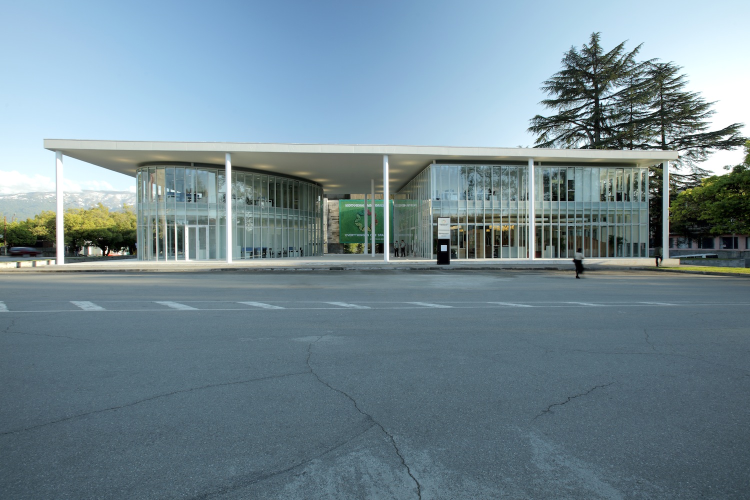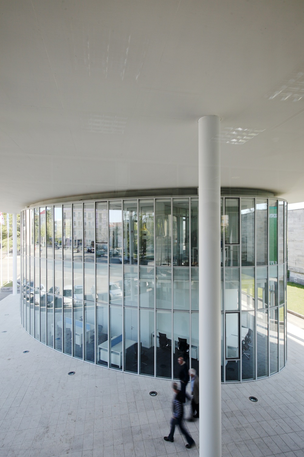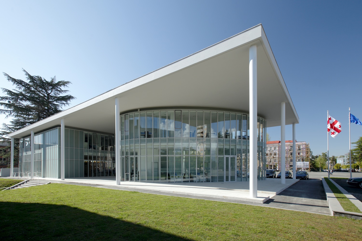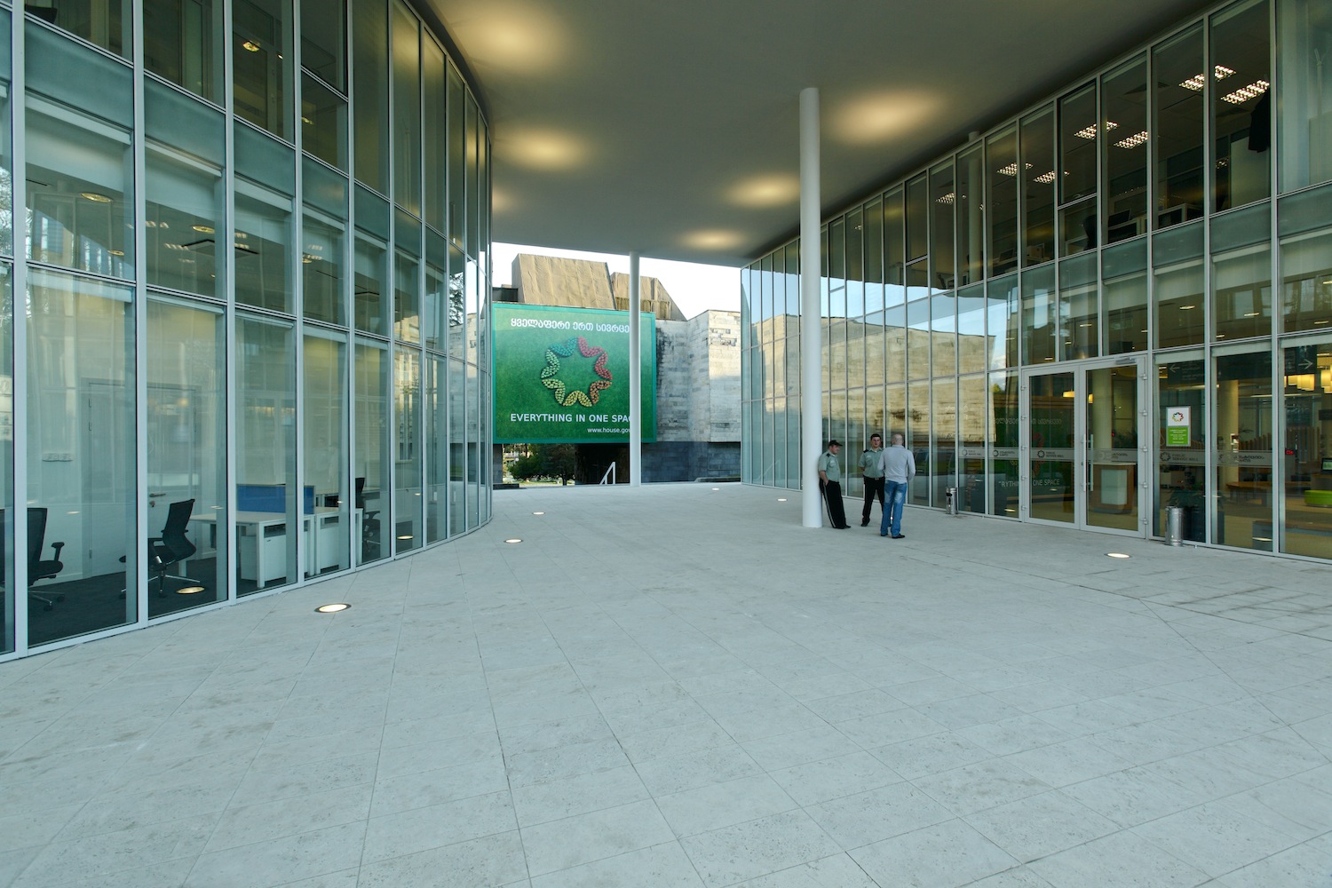 Architects of Invention were invited to submit a proposal by Georgia’s House of Justice. The brief included a design for a 1500m2 building to house 95 members of staff and a flow of 400 users a day, to serve Ozurgeti’s population of 500,000. Construction began in September 2011. The Ministry building brings together a number of services - the Civil Registry Agency, National Agency of Public Registry, National Archives of Georgia, National Bureau of Enforcement and Notary Chamber - under one roof, creating a new blueprint for a government building. Inspired by a classical Greek form, the Ministry is fronted with regular columns, but, rather than a rendered façade, the columns support a canopy beneath which are two independent and contrasting glass volumes. The size of the Public Hall defines the first volume, which is rectangular and also contains office space. The second volume is oval and set apart from the rectangular block to accommodate a covered entrance and public walkway between the buildings, connecting the square to one of Ozurgeti’s major boulevards. Each form is double-storied and linked by an underground corridor. The exteriors and interiors are uniform white, adding to a sense of luminosity. The choice of 100% transparent low emission glass creates brightness inside the building. This building is contextual, with a clear relationship to the city and its surroundings. It invites public interaction and its presence modernises the square with its existing residential buildings, a former local art museum and a 400-seat theatre.