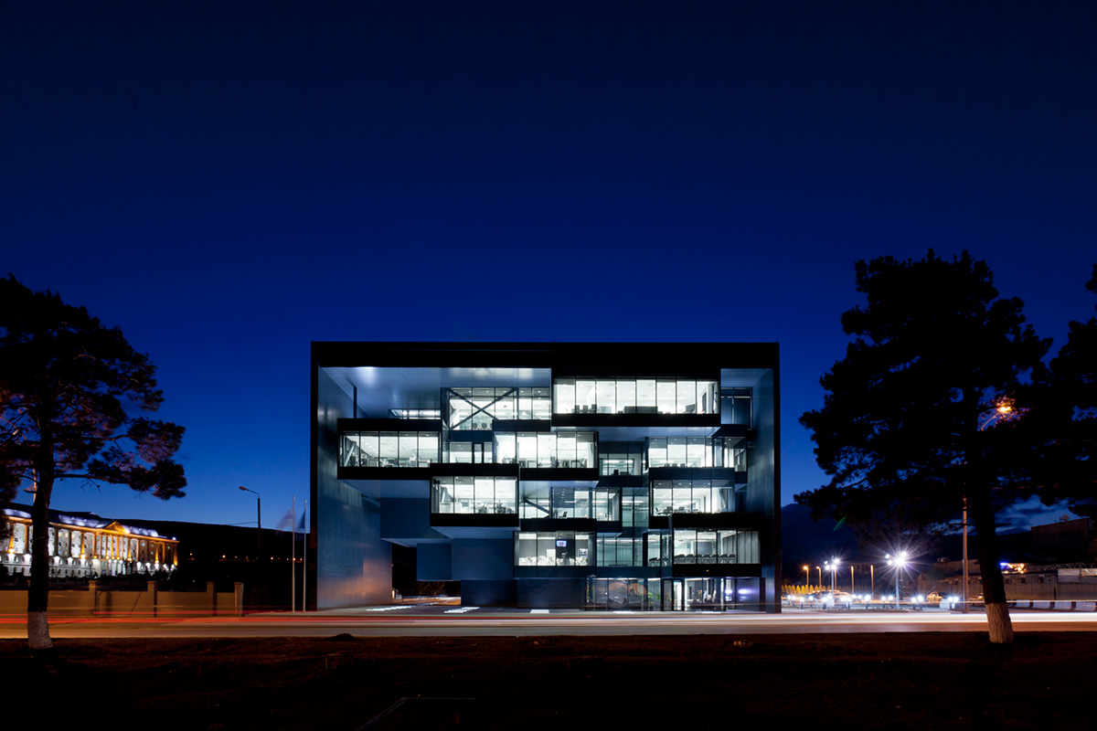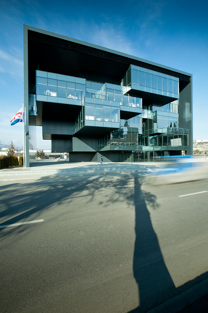 Architects of Invention submitted a proposal as part of an invited competition for a new build to the north west of the city, just on the outskirts of the city centre and close to the Tbilisi Court building. The building was completed in February 2012. The brief was to create workspace for 60 members of staff, a substantial lobby and car parking. Work began in May 2011 and the building was completed in early 2012. The building consists of a stalwart, stark black frame that has luminous, delicate volumes suspended within it. 70% of the building is freestanding away from the sides and the ground creating an impression of "floating" forms. The volumes make way for a passageway to one side of the building, creating a physical transparency of the building that is alluded to throughout the design. The suspended volumes are staggered so that they create terraces and balconies. The interior intelligently uses glass to create a feeling of transparency and light, in contrast to the dark impenetrable framework. The ground floor serves as the main access area with security check in and lobby. The top floor is dedicated to the Prosecutor's office, a meeting room, canteen and veranda for use by staff. A sky park, or roof garden, is used for conferences and celebrations. In contrast to the openness of the front facing facade, the back of the building is smooth and functional with few windows. The choice of materials and the form have been chosen to reflect the function of the building. The stark geometry of the black frame represents the uncompromising nature of the legal system. Inside the building, a clustered, mirrored volume endlessly throws reflections: The semantic message here is that the centre is unknowable - purely because it is an endless reflection and ordering of the world around it, says Architects of Invention director Nikoloz Japaridze. The structure mirrors the brain; the glass exterior mimics the lobar matter which processes exterior realities, while the hypothalamus is the centre of the nervous system controlling temperature, hunger, thirst and fatigue.