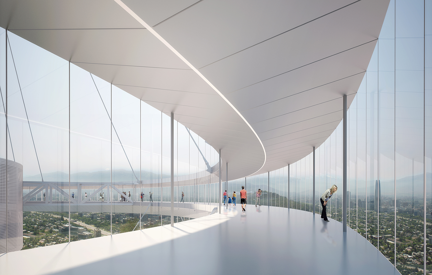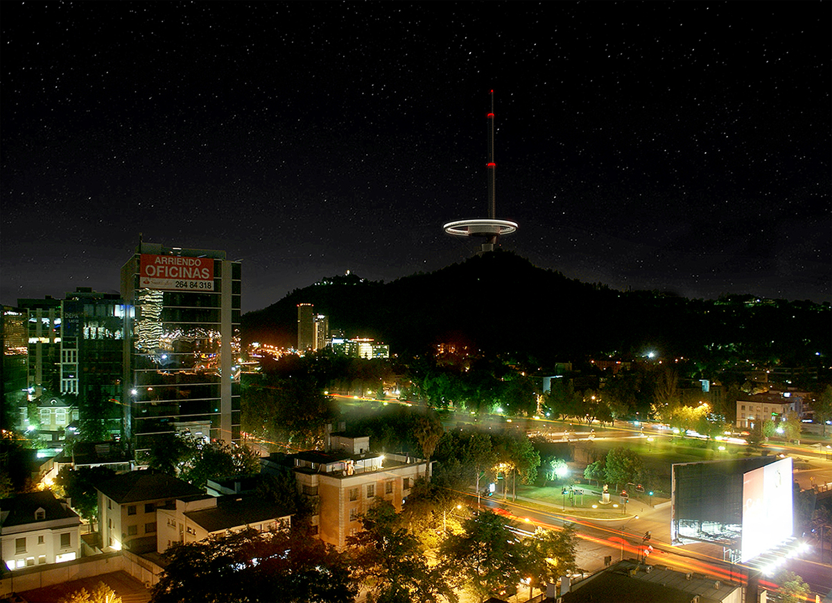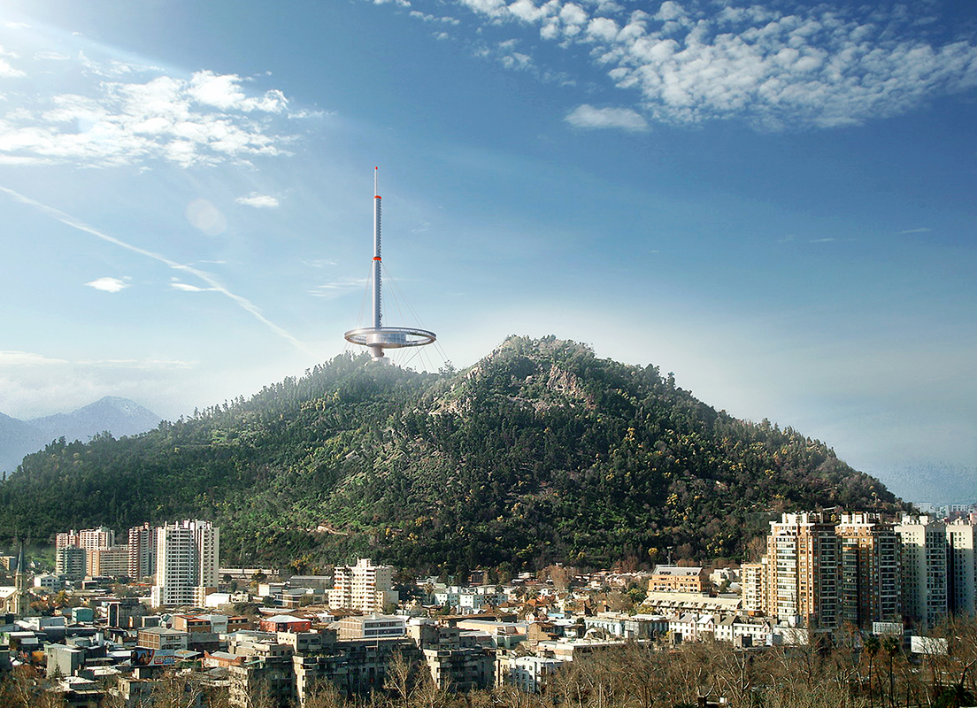 The concept of this tower suggests the volcano and optical phenomena such as the halo and the sun pillar. The ideas originate with the early modernists such as Rodchenko, Tatlin, Yakov Chernikhov and Malevich. Chile has an enormous amount of active volcanoes and this tower evokes that seismic dynamism with its smoke-plume vertical extension that seems to twist and rise. Likewise, the light emitted at night by the viewing platform is reminiscent of the wide glow from an active eruption. The evocation here is more about spreading than upward movement, such as a volcano does as it emits its fiery contents. The relationship of the tower to the statue of Saint Mary is important also in that the horizontal emphasis does not represent a dominating presence but rather a shared mountainous space. The mountain’s gentle slopes are resonant with the viewing platform’s disposition that erases a hierarchy along the skyline to Saint Mary. The viewing platform also suggests an optical halo – which seems to float in the sky, suspended only by cables. At night, the halo-like shape hovers above the mountain peak with only a series of red lights shining above it. The halo has always been considered as a feature that highlights and inspires awe, in phenomena as far-reaching as weather patterns, photography, painting, the physical sciences and religion. This tower, with its strong and simple design is unlike any other tower in the world (see our scale comparison page for images of towers that correspond to it). This presents a potential for iconicity in a global metropolis such as Santiago. The design also emphasises the structural ingenuity required for such a structure – and which is very important in a seismic zone 9. Furthermore, the displacements of form and dynamism of the design make this tower very suitable for one of the toughest urban seismic territories on earth. The form also suggests diversity and unity at the same time. The shifting shapes along the vertical axis create a sort of tension, akin to Chile’s own cultural tension between its Incan and Mapuche cultural roots and later European connections. But the circle of the viewing platform is a uniting form too, cancelling the connotations of conquest and domination that vertical towers can suggest. The vertical projection demonstrates tension and dynamism and the lower halo-form intimates inclusivity and circumspection. While a halo suggests sanctity in religion, it is essentially dualistic, also heavily represented in optical sciences. It generally refers to the phenomenon of light circular dispersal which of course refers us directly to the function of the structure as a center of signal emission. The circular form also echoes Chile’s beloved rodeo and such a prominent ring-shape on the city's skyline may suggest the Olympic logo, commending Santiago as a future host city for the sporting event. The tower: The tower is organised as a vertical displacement of the programme emphasising its horizontality rather than verticality. Its homogenous materiality refers to its sculptural nature rather than simply suggesting its functional form - it combines the motivations of both as a landmark form and a functional communication tower. Each programme is easily recognised by its shifted mass, allowing recognition of each point of utility. The significance of its form is dominated by a large 80-meter diameter ring hovering above the mountain peak. At night, the illuminated ring acts as a halo around the mountain peak, mitigating its functional significance with a subtle presence in the night-time panorama. Structural Philosophy: The proposed structural form pushes the boundaries of structural engineering by creating a hybrid reinforced concrete/steel tube with an array of steel and Kevlar guys to brace the slender tower. The off-center trussed ring creates an outdoor viewing platform whilst also creating an opportunity for small changes in guy direction to the ground level allowing the guys to be arranged so that certain cables are always in tension in a seismic event to provide resistance to the main tower core. The site: The communication tower’s predominant form is oriented to the North-West on the axis of Zoologico Nacional de Chile, Santuario de la Inmaculada Concepcion and –Square. There are five pedestrian and vehicle routes to the site (see below). The main car park space is located on South-East slope, around 100 meters below the main entrance offering a serpentine walkway up to the tower. The base of the mountain top is levelled following the contours of the mountain. The created surface is filled with a water reservoir. Access to the building is through a bridge over the reservoir.