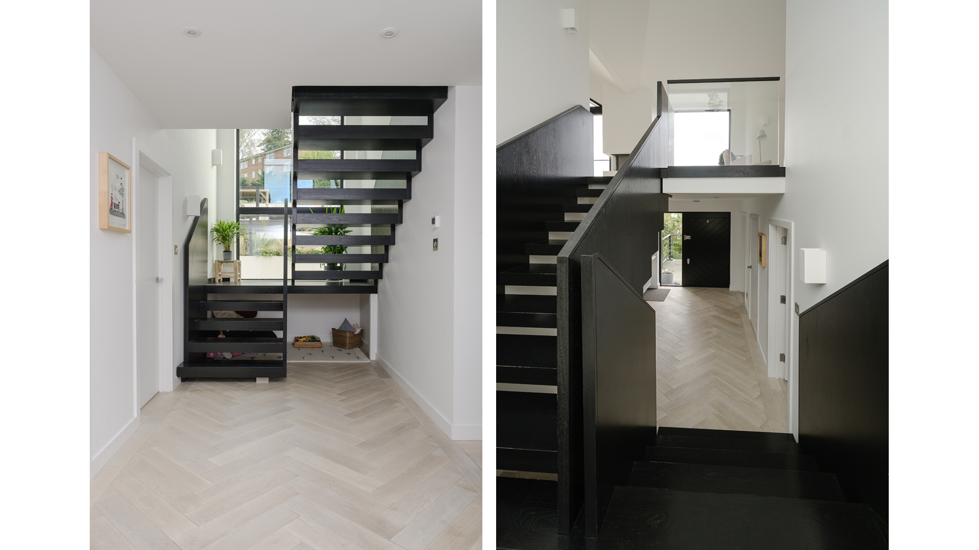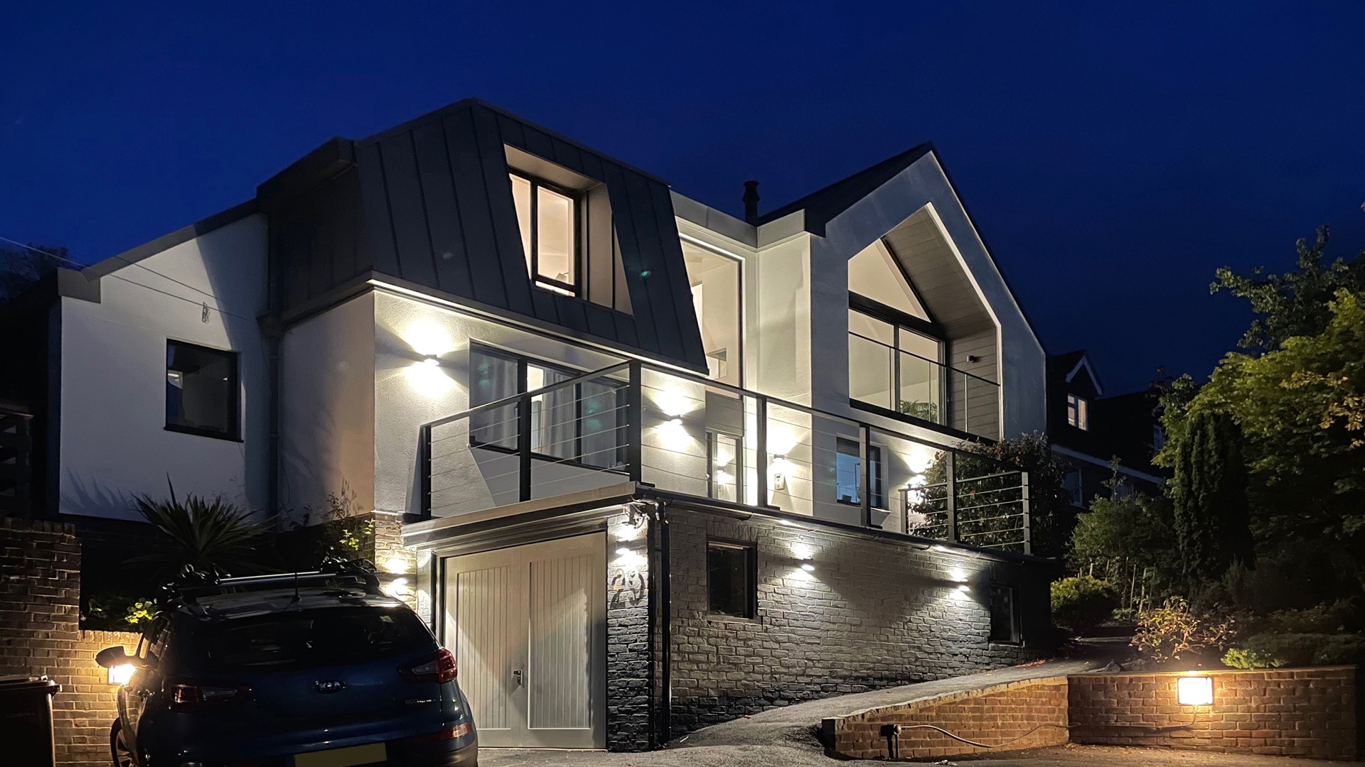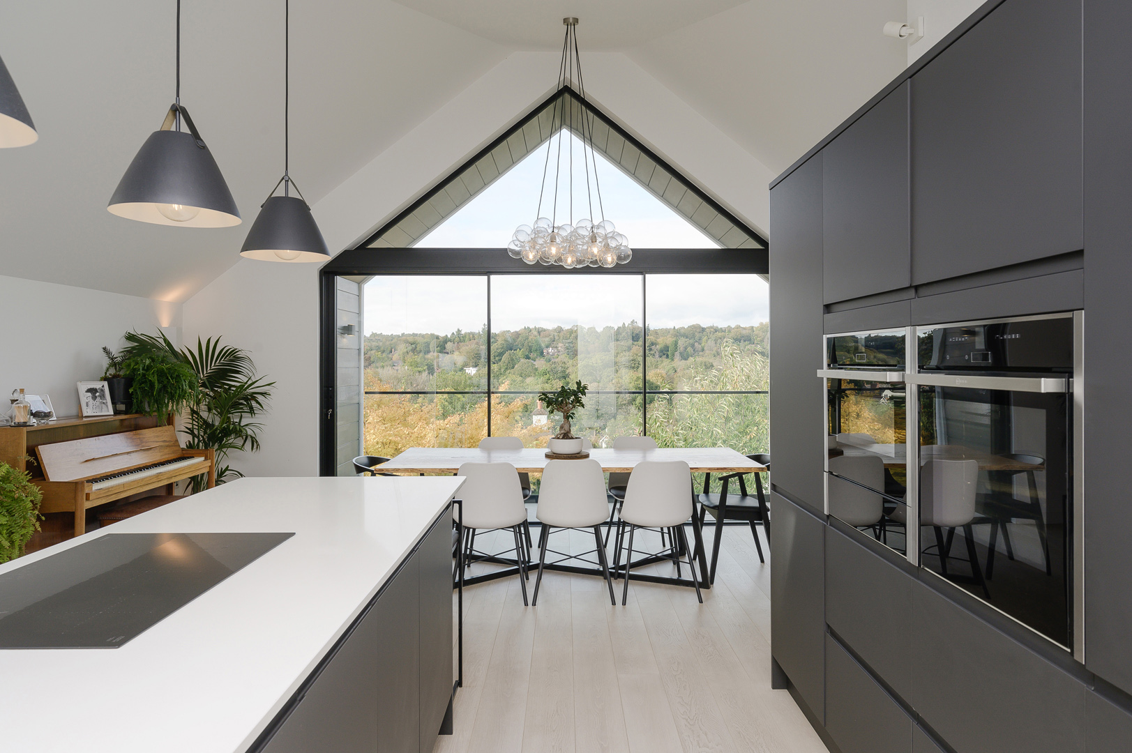 This converted family home is located in the heart of Haslemere, Surrey. Our design created a new first floor extension across the entire bungalow footprint, partially built into the roof with a holistic design approach for the entire house. The reconfiguration of the existing ground floor allowed for the relocation of all principle living spaces onto the top floor as an upside-down house layout. This, in turn, allowed for the double aspect open-plan kitchen, dining and living accommodation to benefit from a level southerly garden access via a bridge link. The extension’s superstructure was built using a prefabricated, structurally insulated panel system (SIPs), which radically reduced the construction period and delivered high levels of thermal performance. A complete refurbishment of the existing building fabric and services reduced the existing carbon footprint of the property by half, despite it nearly doubling in size.