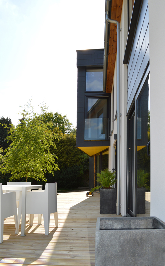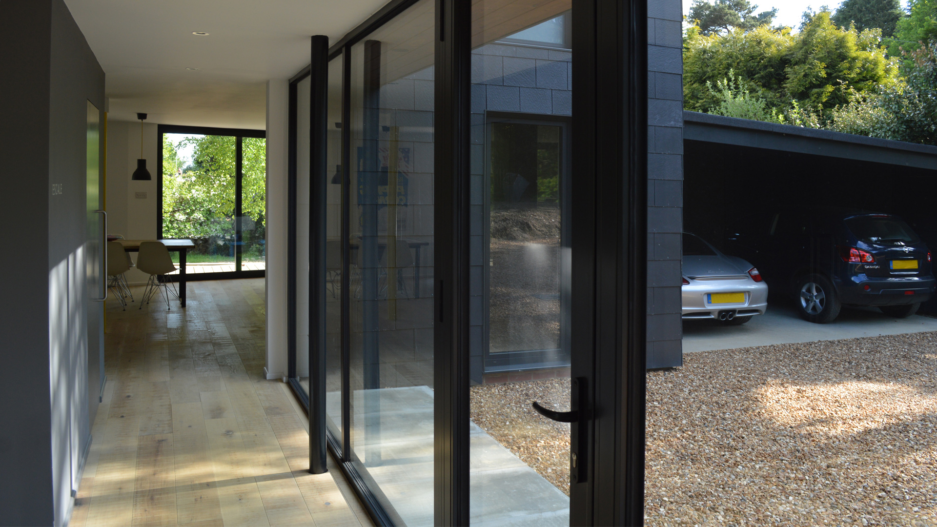This project showcases the complete renovation and extension of a 1960’s single family dwelling in Haslemere, Surrey. An original car port was reinvented as an open plan entrance hall, with the new extensions housing an open plan kitchen & dining area, master bedroom suite and replacement car port. The new extensions feature artificial shingle cladding that provides a visual separation to the render finished renovation of the existing. All new building elements have been positioned in order to redefine the entrance and setting of the property whilst maximising the southerly aspect of the site. The reconfigured internal layout, thermal improvements to the entire existing building fabric and a new heating system completed the refurbishment.