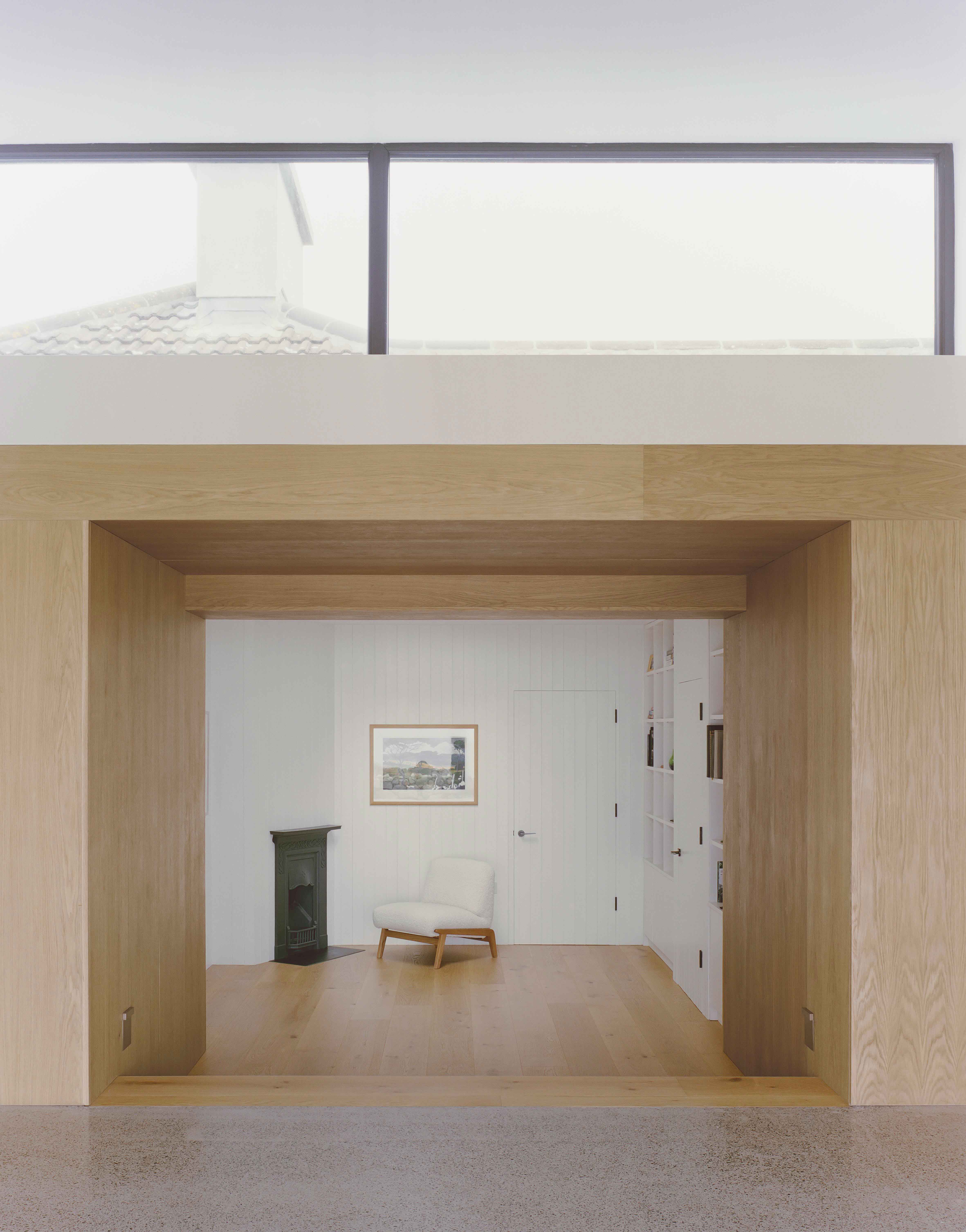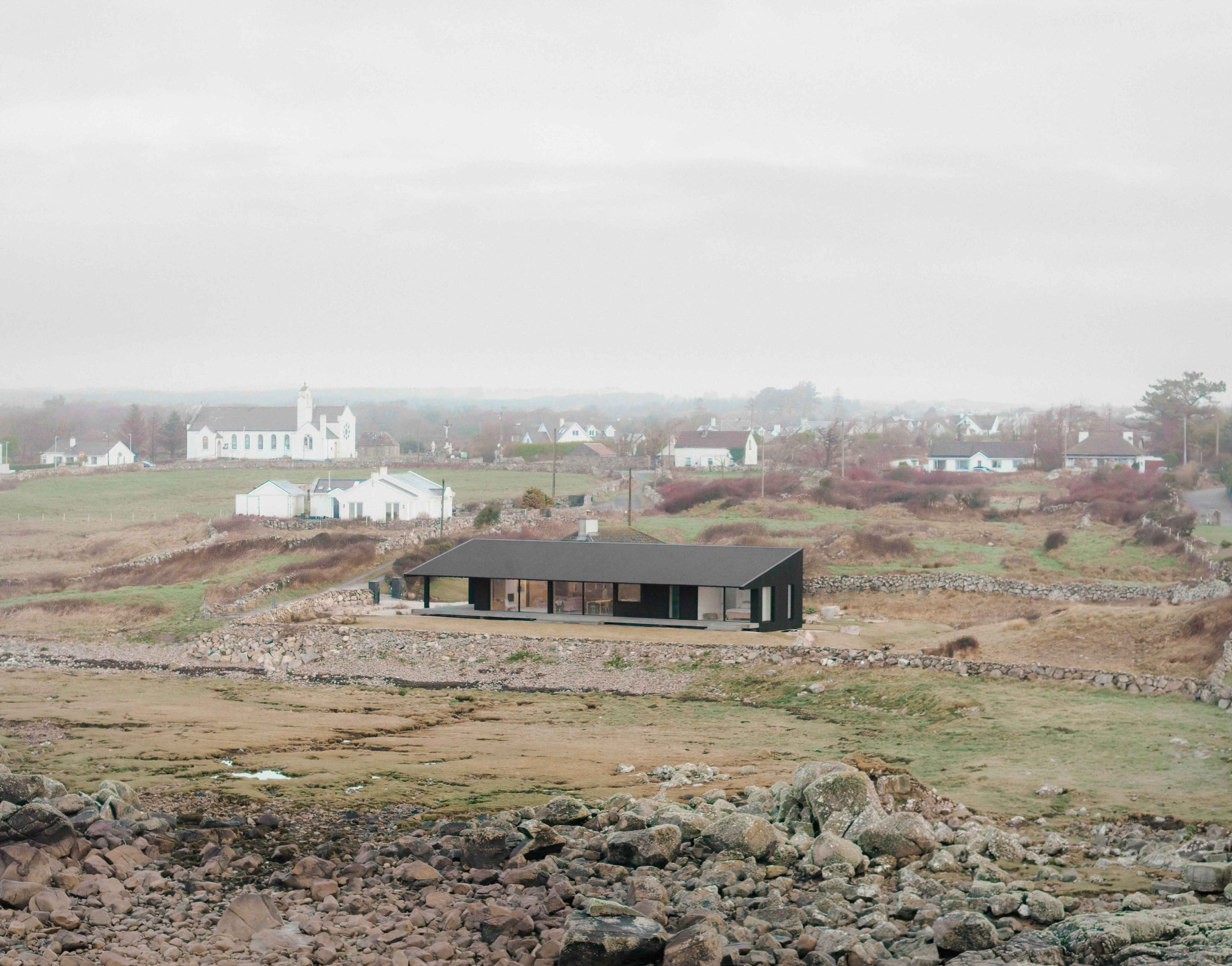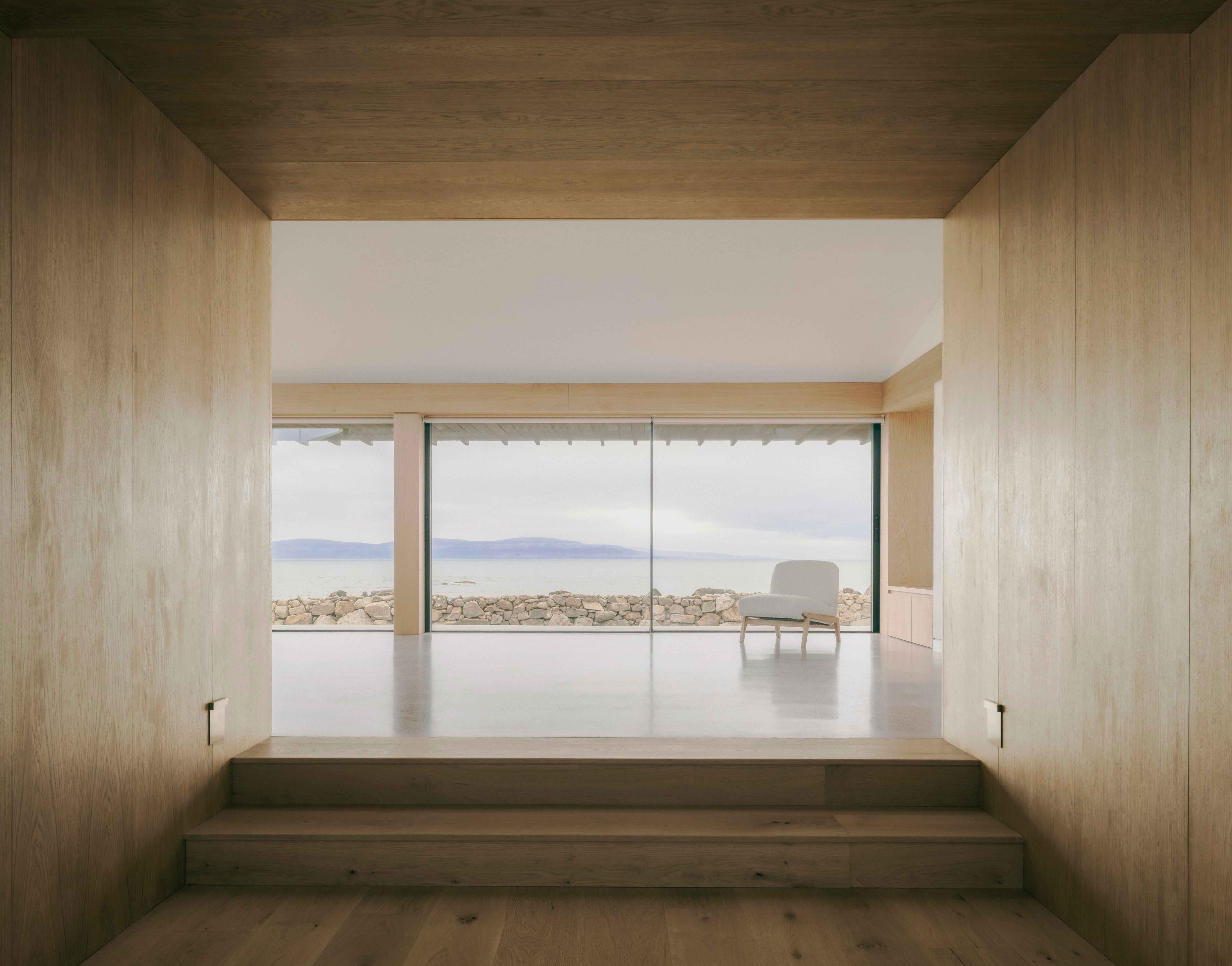 On the Bay This project consists of the extension and refurbishment of a shoreline cottage facing south across Galway Bay towards The Burren and County Clare. The site is bounded by an existing dry stone wall built from large granite rocks, and the foreshore between the house and the sea is populated with large rock formations, shallow pools and seagrass. The site very exposed so the new house had to be designed to be able to withstand the brunt of heavy weather coming in from the Atlantic. The clients wanted to extend the cottage in a way that would make the most of the view across the bay. As such, the extension was designed as a simple, low pavilion placed directly between the cottage and the sea. The elongated building form and sharp roof edge give the building a low horizontal emphasis helping the building to blend into the background when seen from the shoreline. The pavilion is lifted several steps above the floor level of the existing house and appears to hover above the ground. A wide timber-lined link connects the library space in the cottage to the new extension. This new link frames a panoramic view to the sea and is an enjoyable surprise to encounter when moving through from the old part of the house. A raised terrace with a fireplace is set to the side of the extension to allow the inner spaces to have a clear and direct connection to the sea. The roof of the extension projects out beyond the concrete terrace, shading the south-facing windows. Rainwater falls off the roof directly into the ground below enabling the eaves to appear as a crisp line, avoiding the need for gutters and downpipes. The concrete terrace that lines the seaward face of the house is set at seat height providing a welcome place to enjoy the view. The living spaces of the extension are bright due to north-facing clerestory windows which run along the length of the building. Walls are lined in oak veneer giving a warm appearance to the space. The living spaces of the new pavilion flow easily into the living spaces of the cottage ensuring that the two buildings work together comfortably. Completed 2024