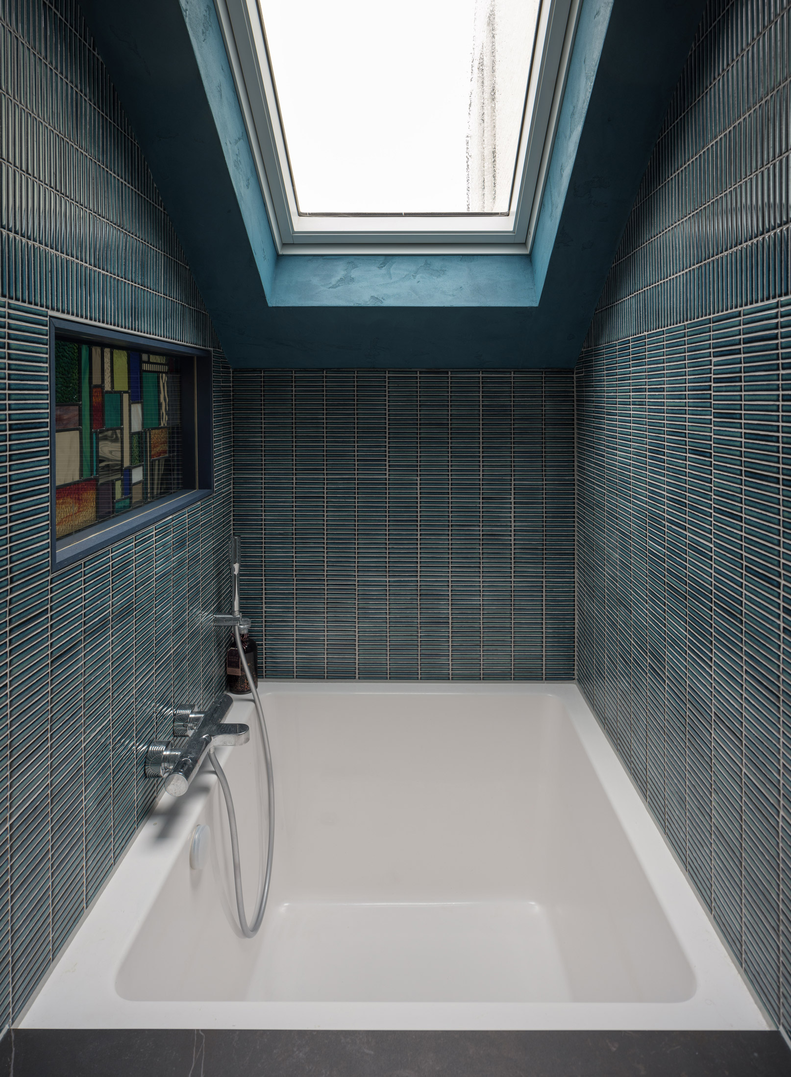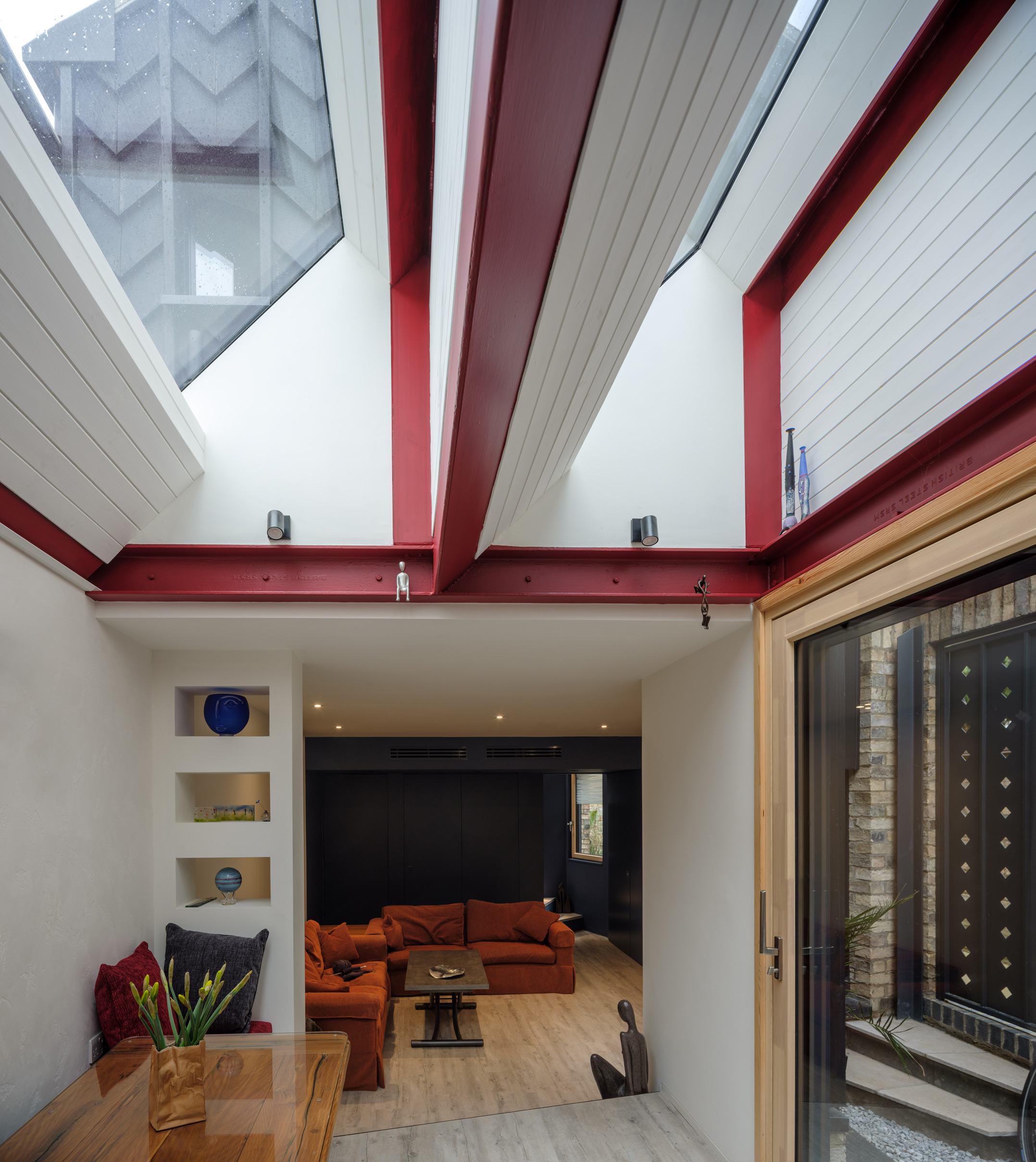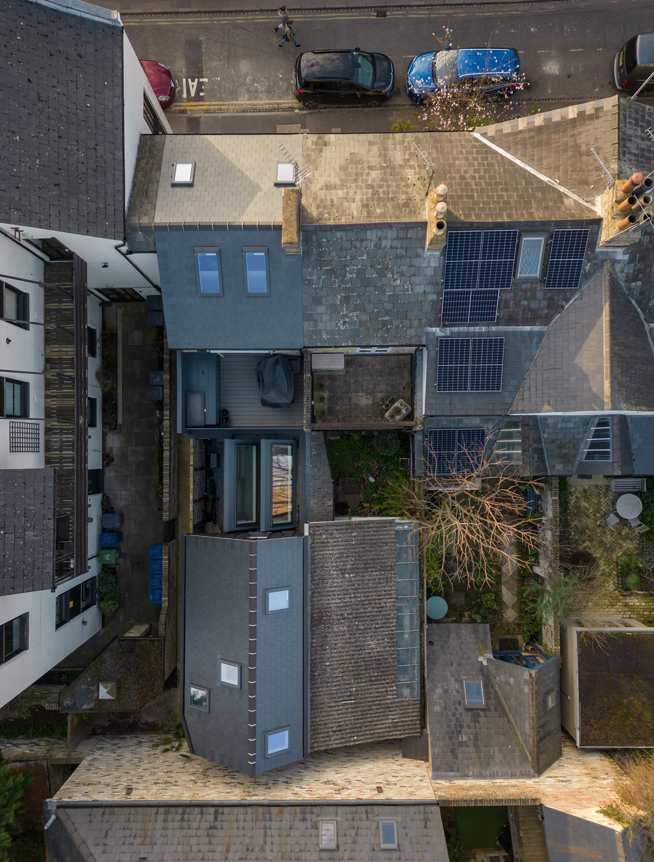 The original building was the studio and home of stone sculptor Keith Bailey, well known in the Cambridge area for his stone carving, lettering and collaborative efforts with Scottish artist Ian Hamilton Finlay. The new highly insulated house slots into the terrace, the metal gate making reference to the garage doors of the stone workshop, which slides across the street facade. Five metres by thirty, the accommodation has been carefully packed onto the compact plot. The clients were looking to downsize whilst also providing a private place for their daughter to live when studying in the city. In order to achieve this, A separate apartment sits above the entrance facing onto the street, whilst the rest of the house extends underneath and through to a pitched volume clad in charred timber at the rear.