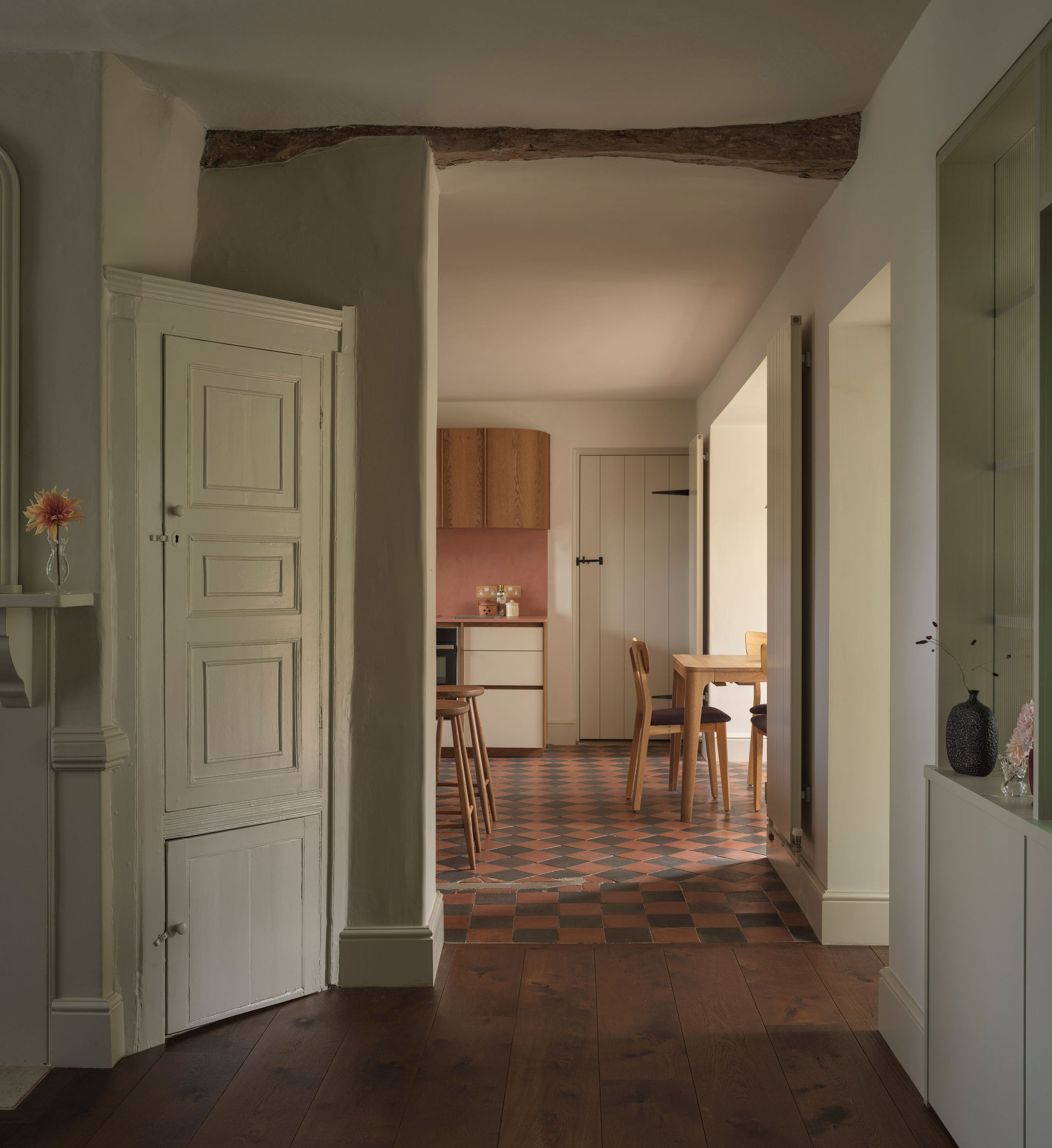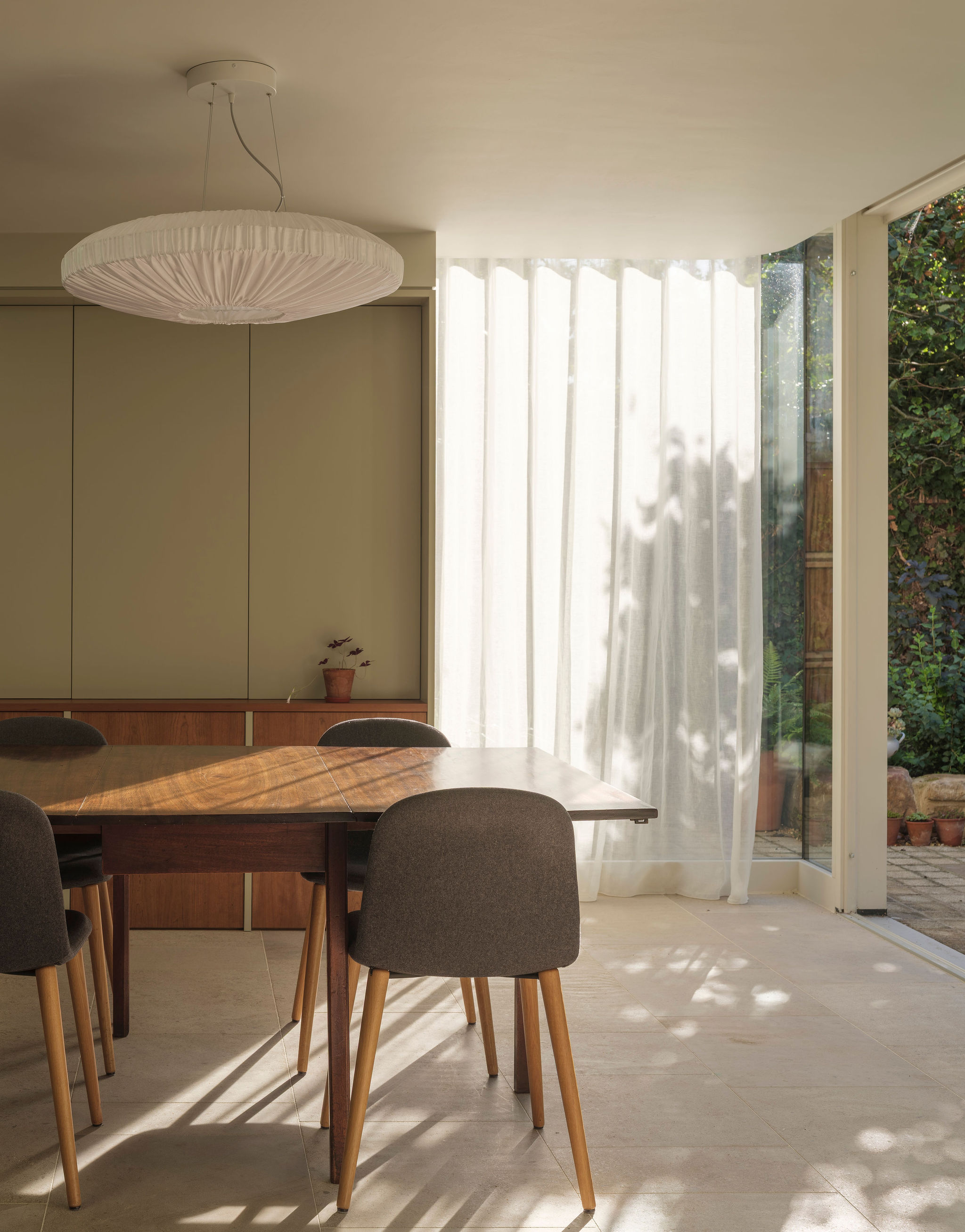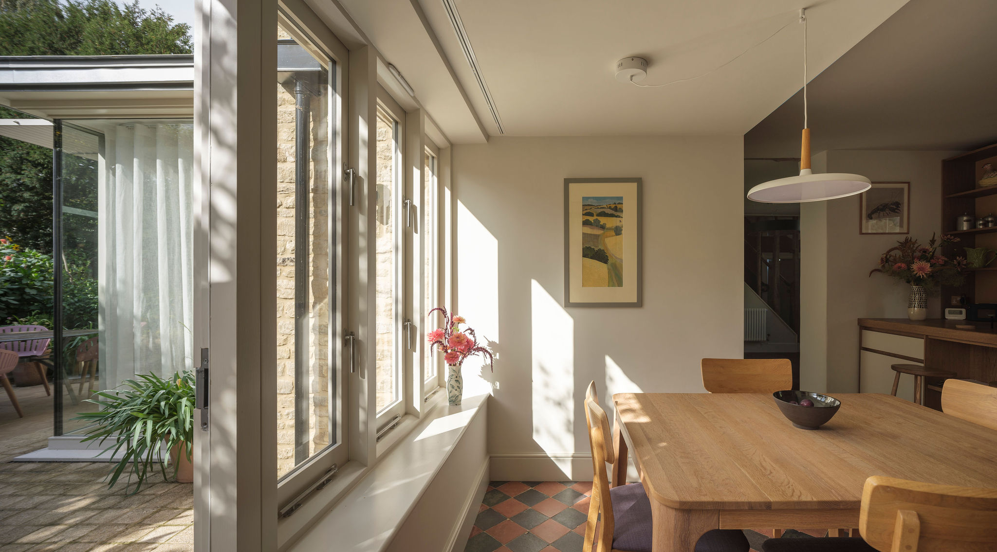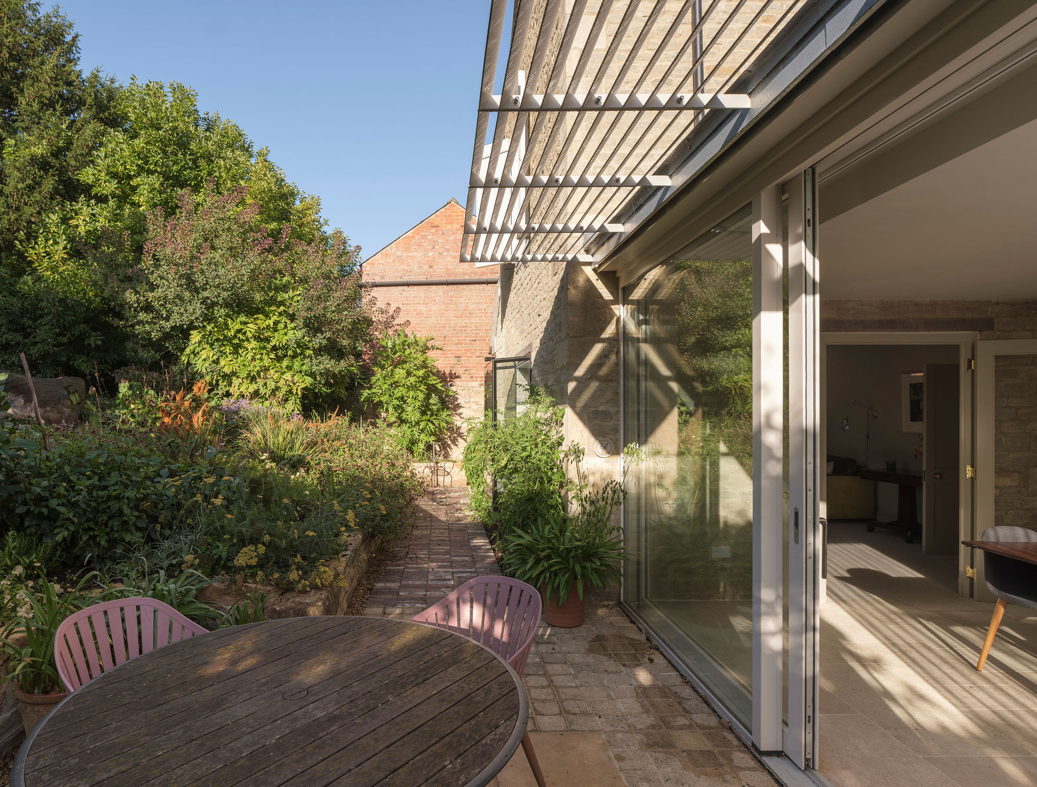 Located in a rural village in Northamptonshire, the existing property is formed from two adjoining 18th century cottages constructed from local stone. A glazed extension on the South facade opens up the ground floor inviting the garden into the house. Both keen gardeners, the clients wanted the garden visible as it evolves throughout the seasons. The glazing, soffit and curtain rails have been carefully detailed to ensure a seamless view of the outside. The original stained glass back door has been re-purposed to form a new piece of fitted joinery. The house has undergone significant thermal upgrades during the construction of the new extension. The original sash windows have been replaced by replica heritage framed double glazing which has dramatically improved thermal efficiency and air tightness.