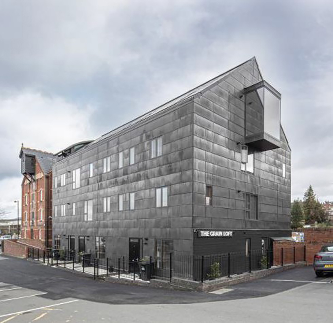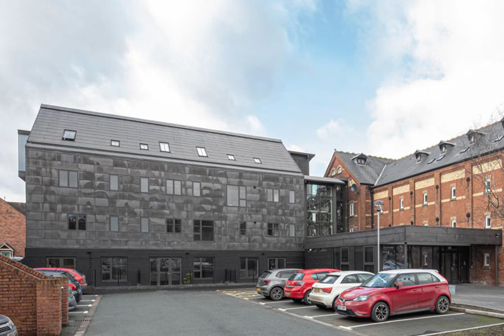 11 new build supported residential units for vulnerable young people in Ludlow conservation area. Includes an additional 13 units in the refurbished existing building, together with commercial workspace and community cafe. The form of the new build element echoes that of the existing building and the dark, copper clad exterior provides a backdrop to highlight the red brick of the historic grain loft.