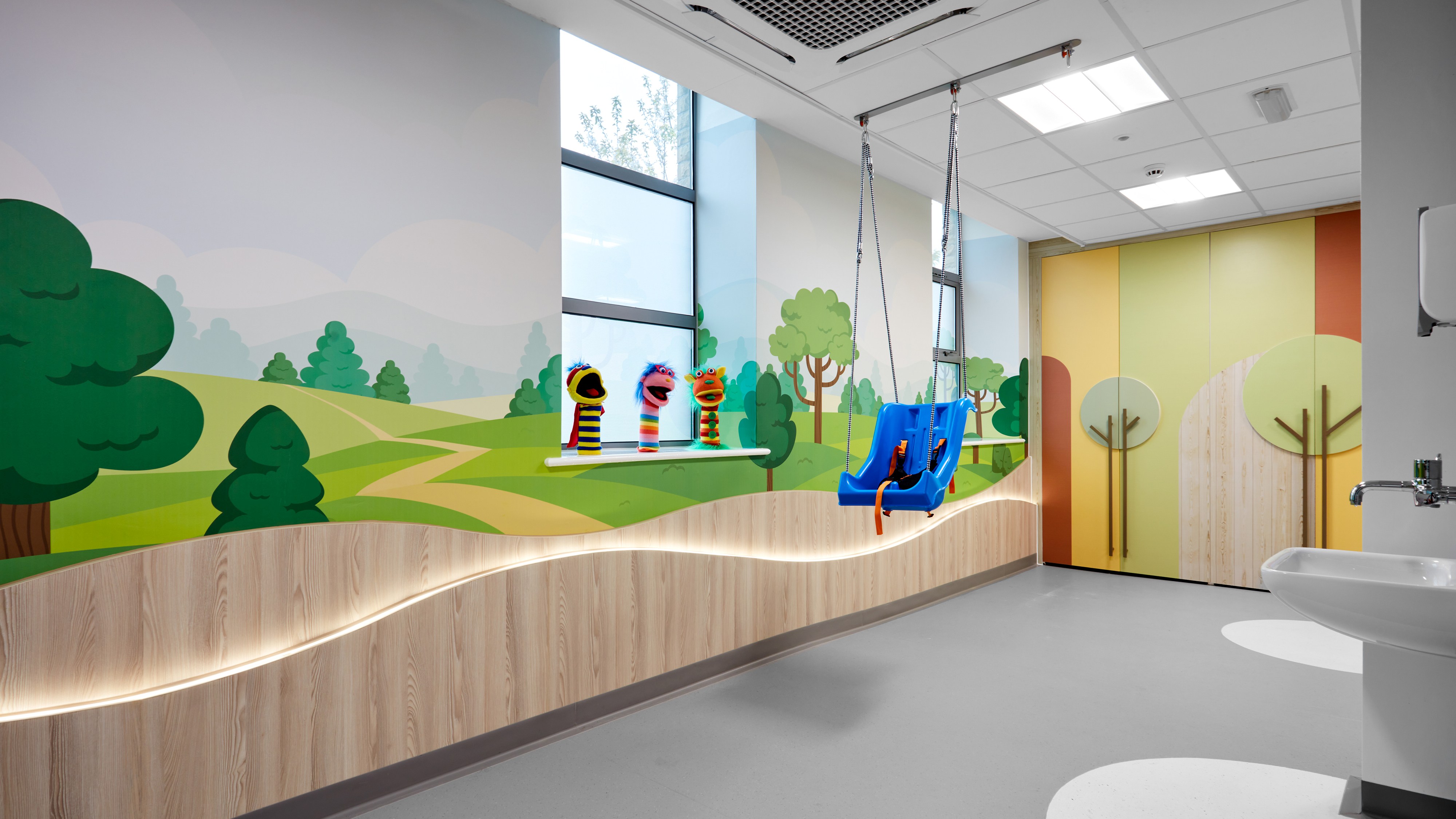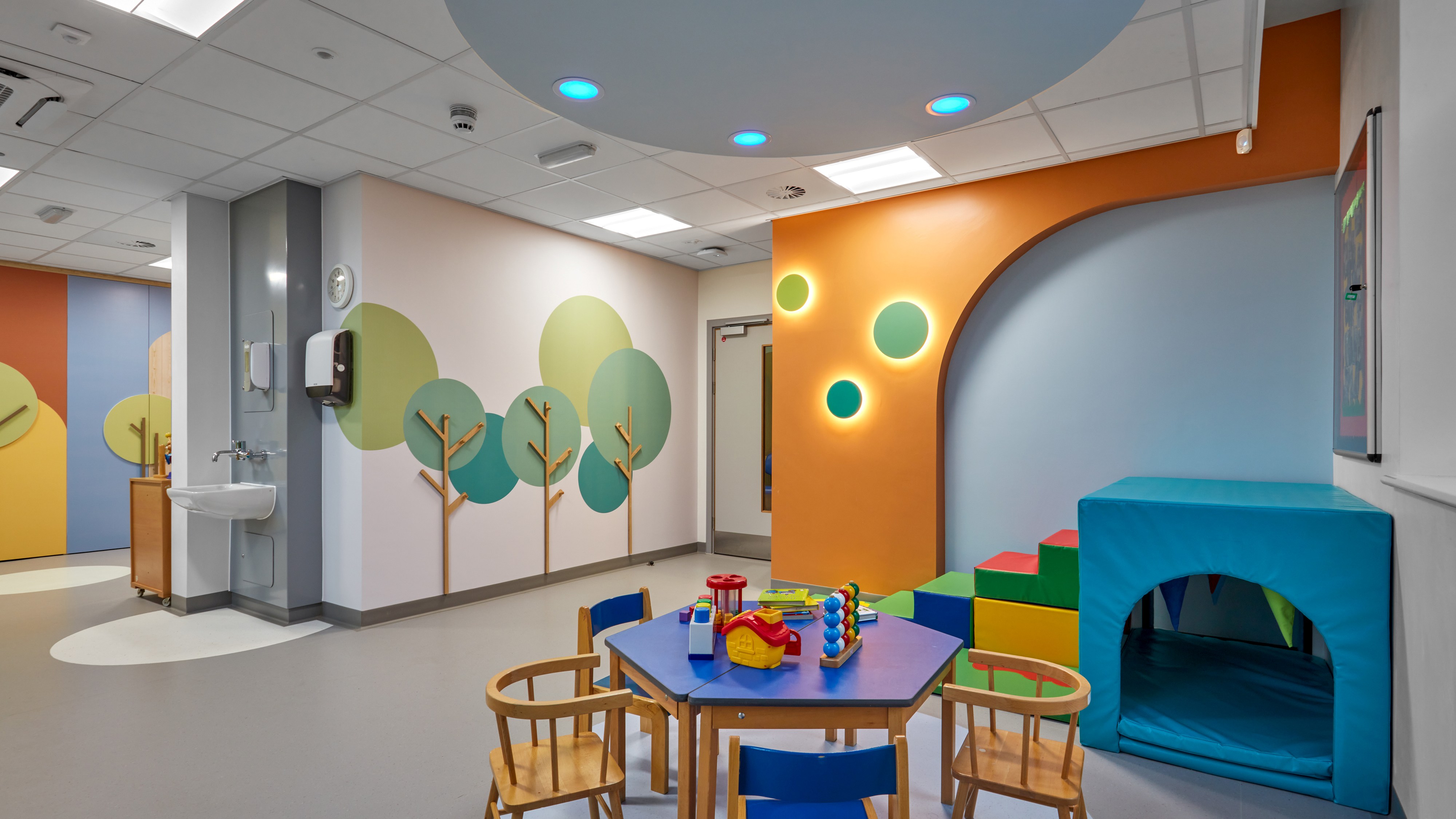 The Rainbow Child Development Centre in Elland, delivered for Calderdale and Huddersfield NHS Foundation Trust, represents a major relocation and transformation project, providing purpose-built facilities for children and families in the community. The scheme has been recognised nationally, receiving Refurbishment Project of the Year at the IHEEM Healthcare Estates Awards 2023 and shortlisted at the FX Design Awards 2023 and Healthcare Design Awards 2023. AFL Architects led the architectural and interior design of the new centre, reimagining Clock House, a former mill and office building, into a welcoming clinical environment. Working closely with the Trust and stakeholders, the design team created a central hub that brings together a wide range of services in a single, accessible location. Facilities include colourful treatment and clinic rooms, a sensory room with advanced technology, and a compliant Changing Place toilet. Dedicated staff areas incorporate flexible office space, hot desking, meeting rooms and breakout facilities. For families, a playroom and outdoor play area with specialist flooring and canopy create safe, engaging spaces for children. Sustainability and social value were embedded throughout the project. Local contractors and materials were used wherever possible, including bespoke artwork from a local artist whose nature-inspired graphics enrich the reception and playroom areas. The result is a supportive and uplifting setting that combines clinical excellence with a positive experience for children and families, while also providing a high-quality working environment for staff.