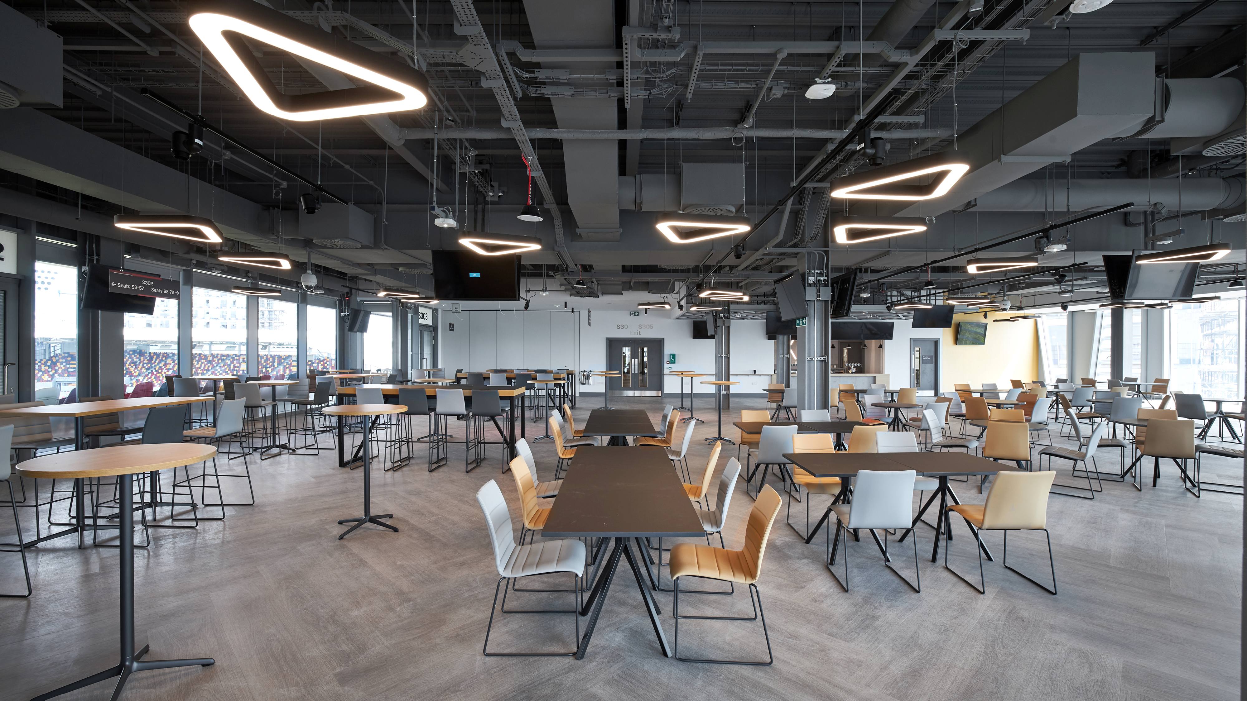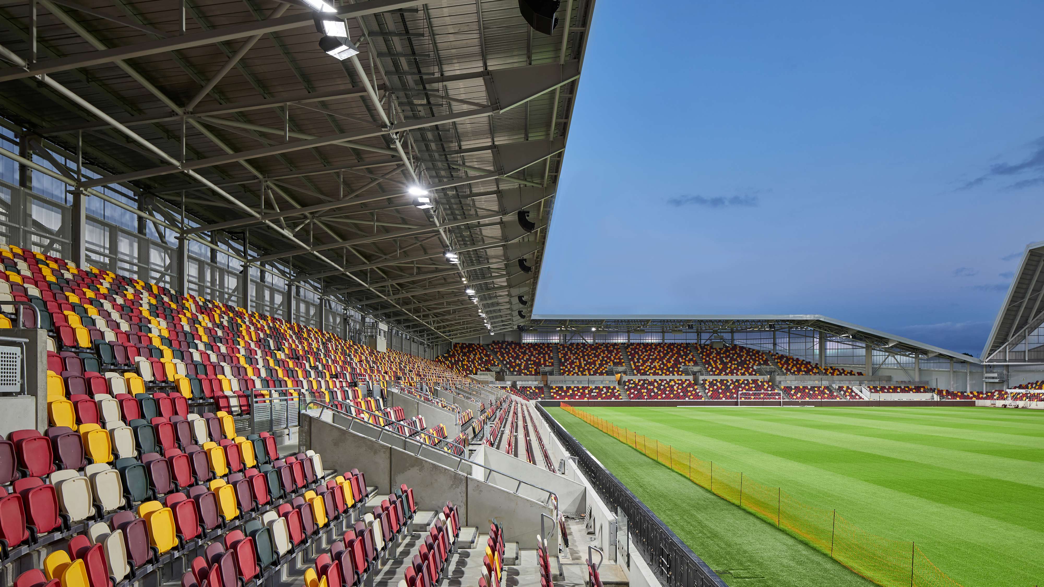 At a capacity of 17,250, Gtech Community Stadium is the joint home of Brentford FC and London Irish RFC. Forming the centrepiece of a wider mixed-use masterplan, the development delivers a new model for community stadia, combining elite sport, residential growth, and urban regeneration. Working closely with the club from concept through to delivery, AFL Architects provided architectural and interior design services for a venue that balances ambition with authenticity. Designed in tandem with a robust business plan, the stadium provides Premier League and UEFA-compliant facilities, first-class hospitality and an enhanced supporter experience, while remaining true to the spirit of Brentford FC. The stadium was conceived as a future-facing, medium-capacity venue with the flexibility to host football and rugby, as well as major events such as the UEFA Women’s European Championship. Its business model aligns commercial performance with community value, ensuring long-term sustainability for both clubs. Hospitality design was guided by in-depth market analysis and financial modelling. Each lounge, suite and concourse was tailored to specific audience demographics, with views, finishes and capacity ratios carefully benchmarked to optimise experience and revenue. This approach resulted in hospitality packages selling out months before completion. Architecturally, the stadium responds to a uniquely constrained site bordered by the M4 and two active railway lines. The triangular form maximises capacity and sightlines within this tight urban context, while its integrated residential developments contribute to a vibrant, mixed-use neighbourhood. The stadium’s distinctive bowl form creates a strong visual identity, while leaving room for future expansion. AFL led extensive stakeholder coordination, including close engagement with Network Rail to assemble and deliver the complex masterplan. The design accommodates dual branding through adaptable lighting and neutral but distinctive interiors. The hexagonal motif woven throughout the scheme references both Brentford’s ‘Bees’ identity and the geometric precision of the stadium’s structure. Seat colouration has been designed to produce a full, dynamic appearance even at reduced capacity, enhancing visual impact during broadcasted matches and live events. Now a defining landmark in Brentford’s regeneration story, the Gtech Community Stadium stands as a forward-looking venue rooted in local identity, a home that reflects the clubs’ shared ambition and connects deeply with their supporters.