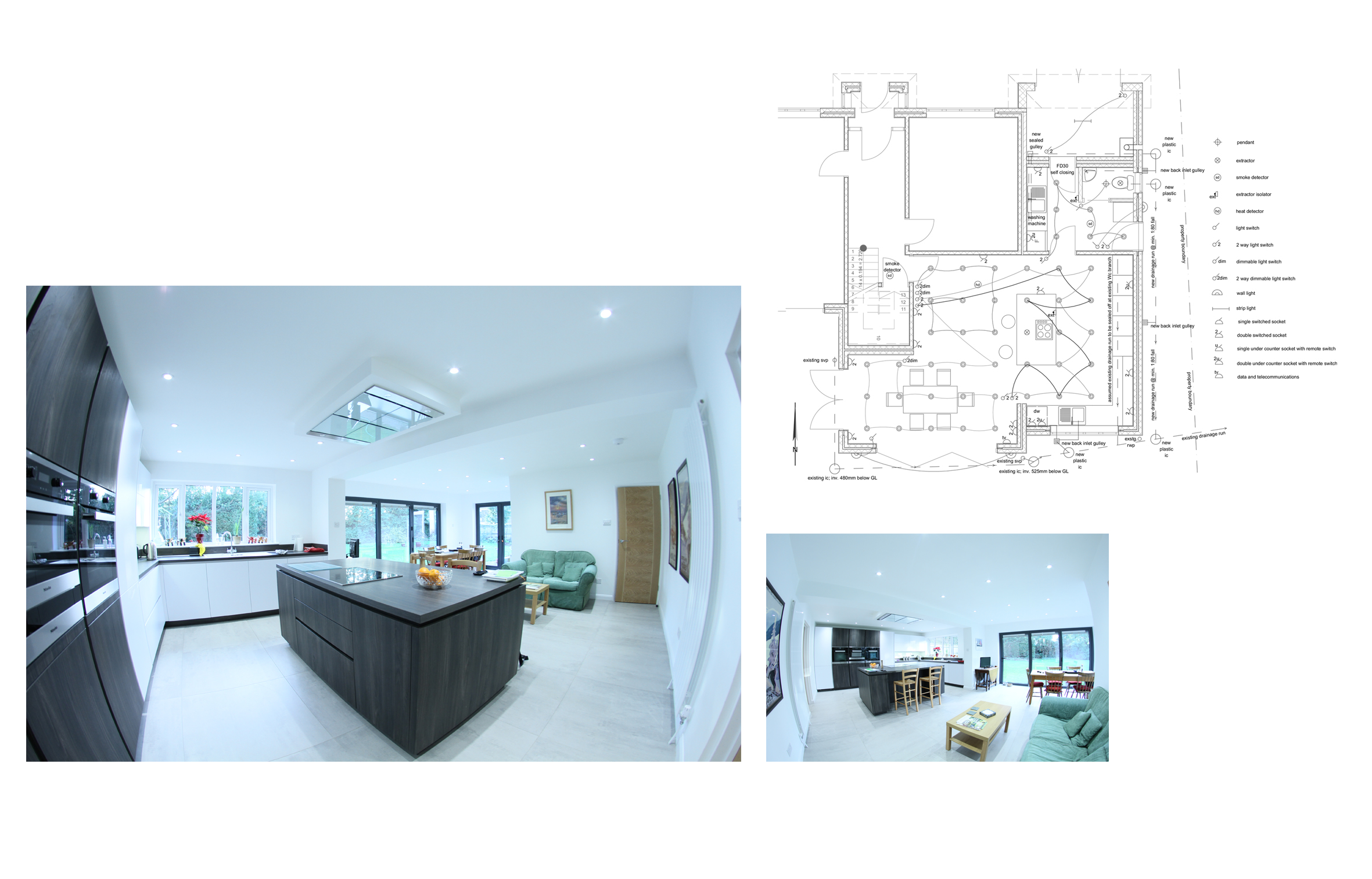 The Client brief was to create a family orientated space with good visual links between the existing Dining Room and Kitchen, and to maintain a Utility Room and hopefully include a Wc. AWA suggested reversing the original layout of the house so that the Kitchen, with higher level window sill would be moved away form the best views of the garden, which could then be fully enjoyed from the new open plan arrangement and enlarged fenestration apertures. All modelled in 3D for better exploration of the available options. A building information model [BIM] was created to show the Client the effects of the open plan arrangement.