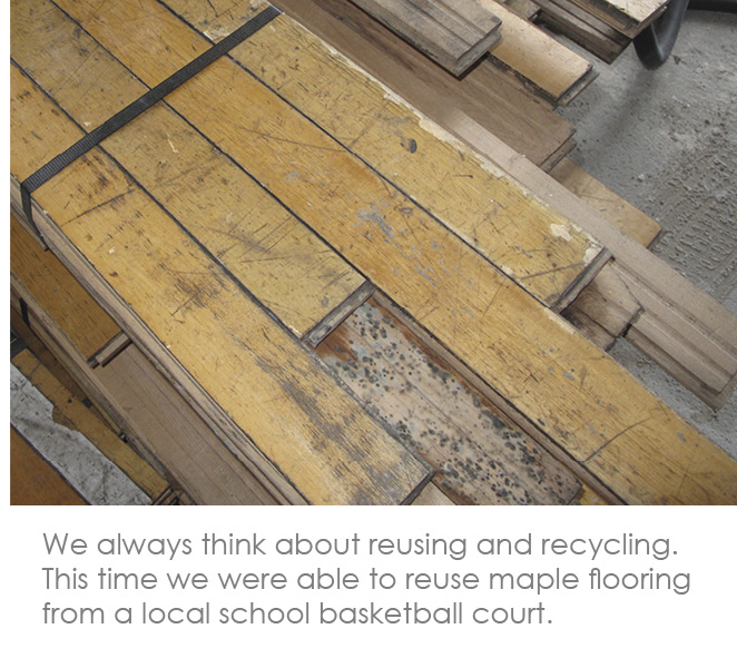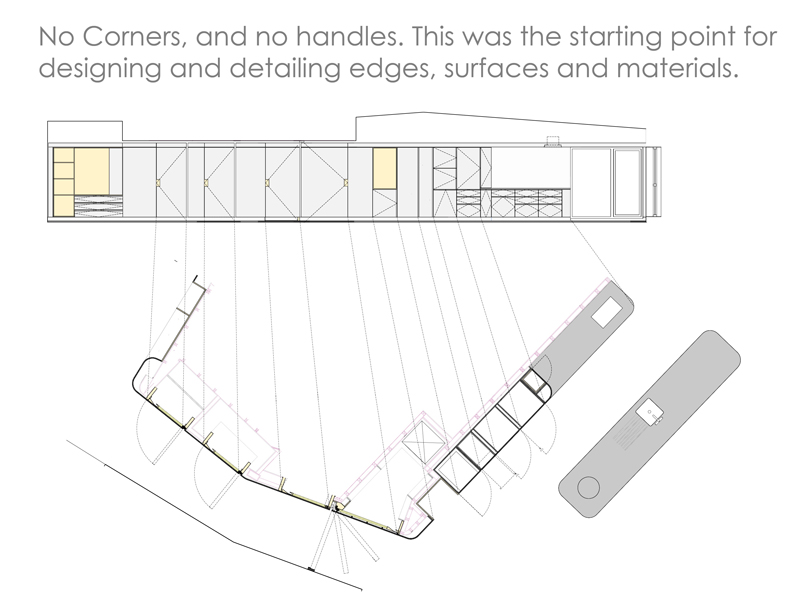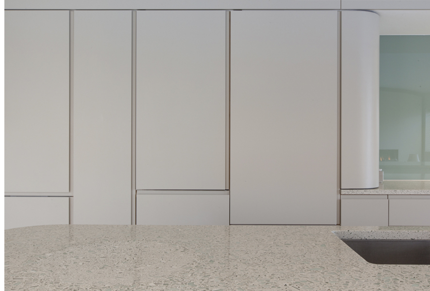 This project completely reconfigured a penthouse apartment according to a simple client request - that the new layout should have no corners or handles. To meet this request, the layout was designed around one continuous joinery spine through the apartment. The spine was fabricated to integrate a series of full height doors to rooms and stores behind with flush recessed maple lined handles, and integrates a fully bespoke kitchen. It also includes a 'magic door which can close off the condor but also be fully concealed as one of the panels of the spine. One of the key ideas in the project was where possible to specify recycled materials. We found a maple floor from a basketball court in Hackney which was being lifted and used this as the flooring throughout the whole space. This gave an important material quality throughout the space that could not have been achieved with a new floor. We also used recycled gloss bottles to as part of a cast worktop in the kitchen.