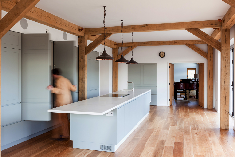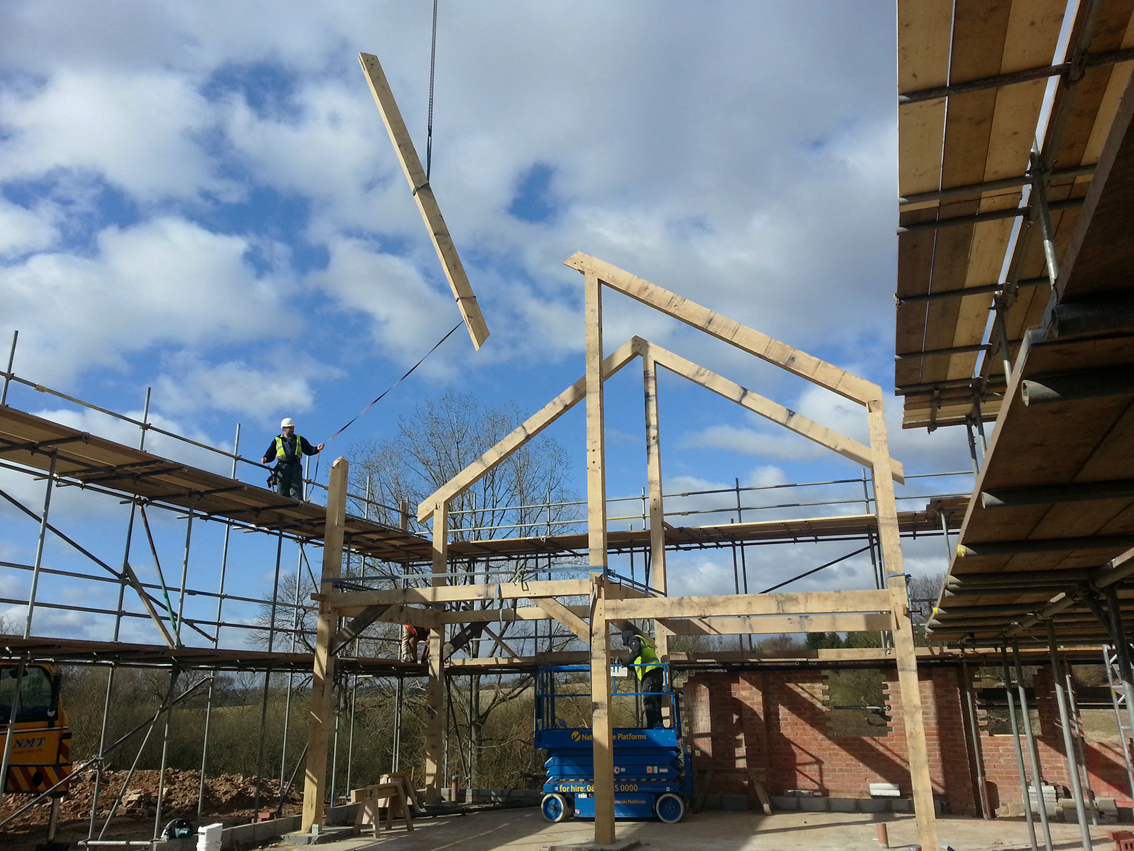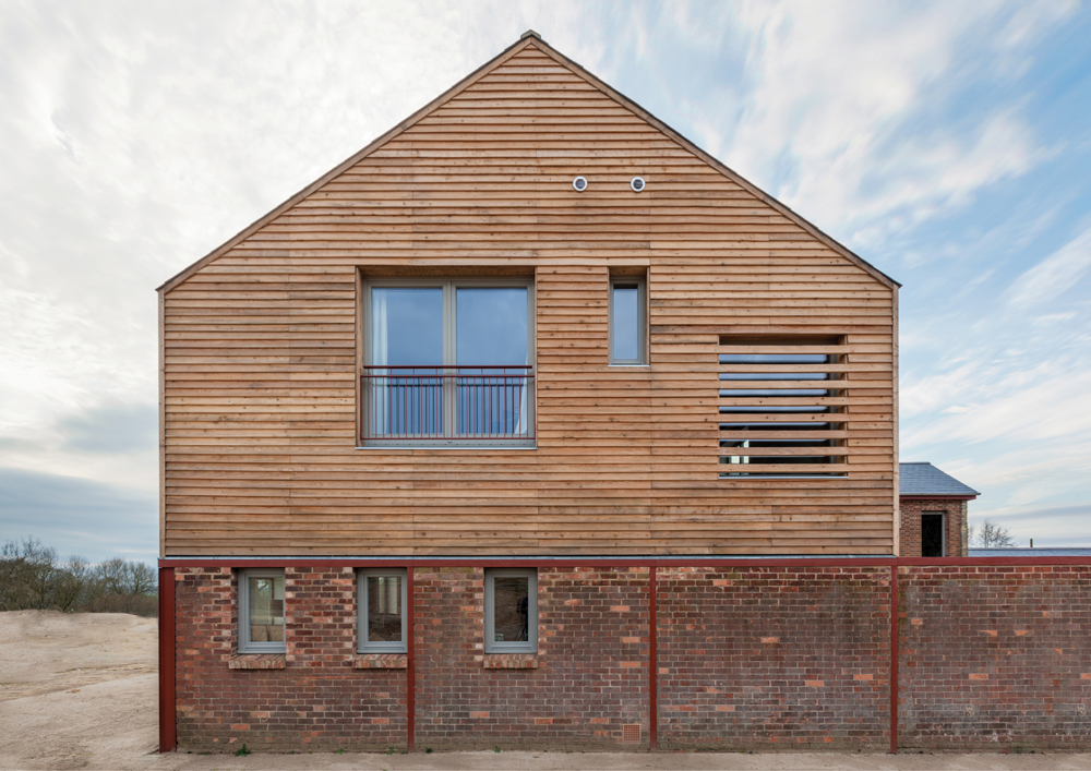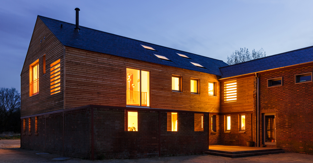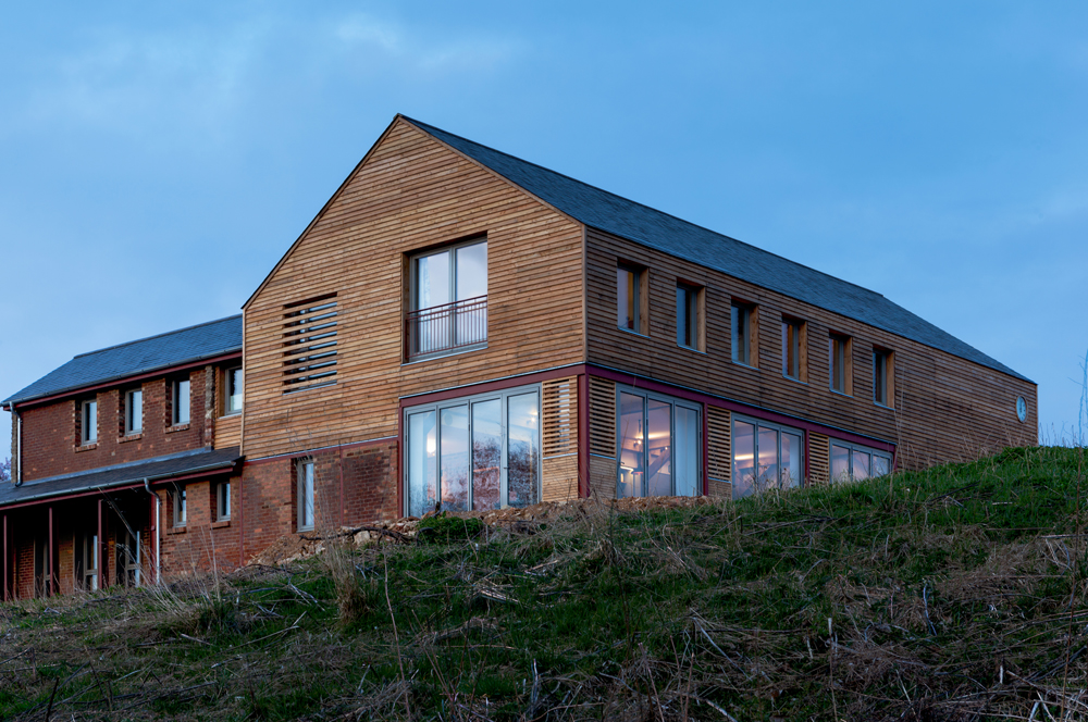 A young couple decided to settled in a rural area, and to start their building project around the walls of an old cow shed. Interested in a holistic approach to architecture, their brief was that the house should fit harmoniously in its context, use locally harvested materials where possible, and be an exemplar in terms of environmental performance. The finished house reuses original materials while achieving annual carbon emissions of 9.1kgC02/annum, equivalent to an Energy Rating of 89, through the high efficiency envelope and ground source heating systems. The design in organised around a structural timber frame, offset with the retained lower walls of the original shed. As environmental performance was fundamental, to avoid infiltration, arising out of frame movement over time, the shell of the house is fully external to the frame, providing structural stiffness to the frame (thereby reducing the requirement for extensive bracing internally), and providing a highly insulated, air-tight envelope. In other words, - the frame gives strength, the envelope gives stiffness. The new house is glazed to the south for passive gains to the living / dining area, and accessed from the north away from prevailing winds. The foot print of the house occupies two thirds of the original barn, the remaining third left as a sheltered courtyard to the north. The building is clad in British Larch, and any of the materials used in the original cow barn were reused, including 90% of the steel frame and much of the original brick. The same palette of materials are used internally as externally.