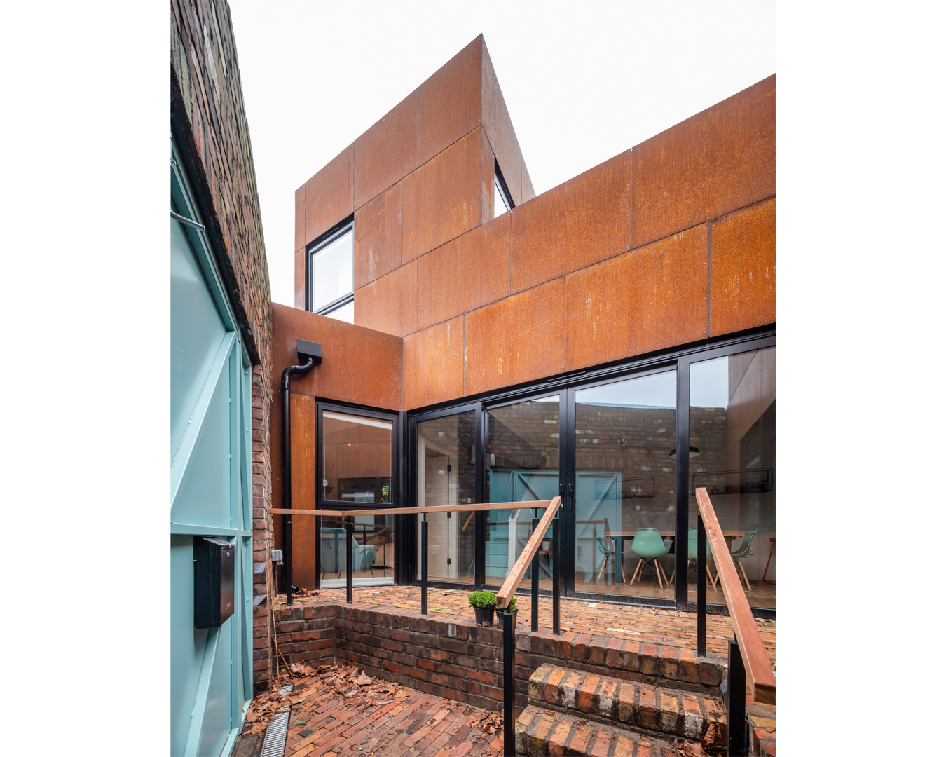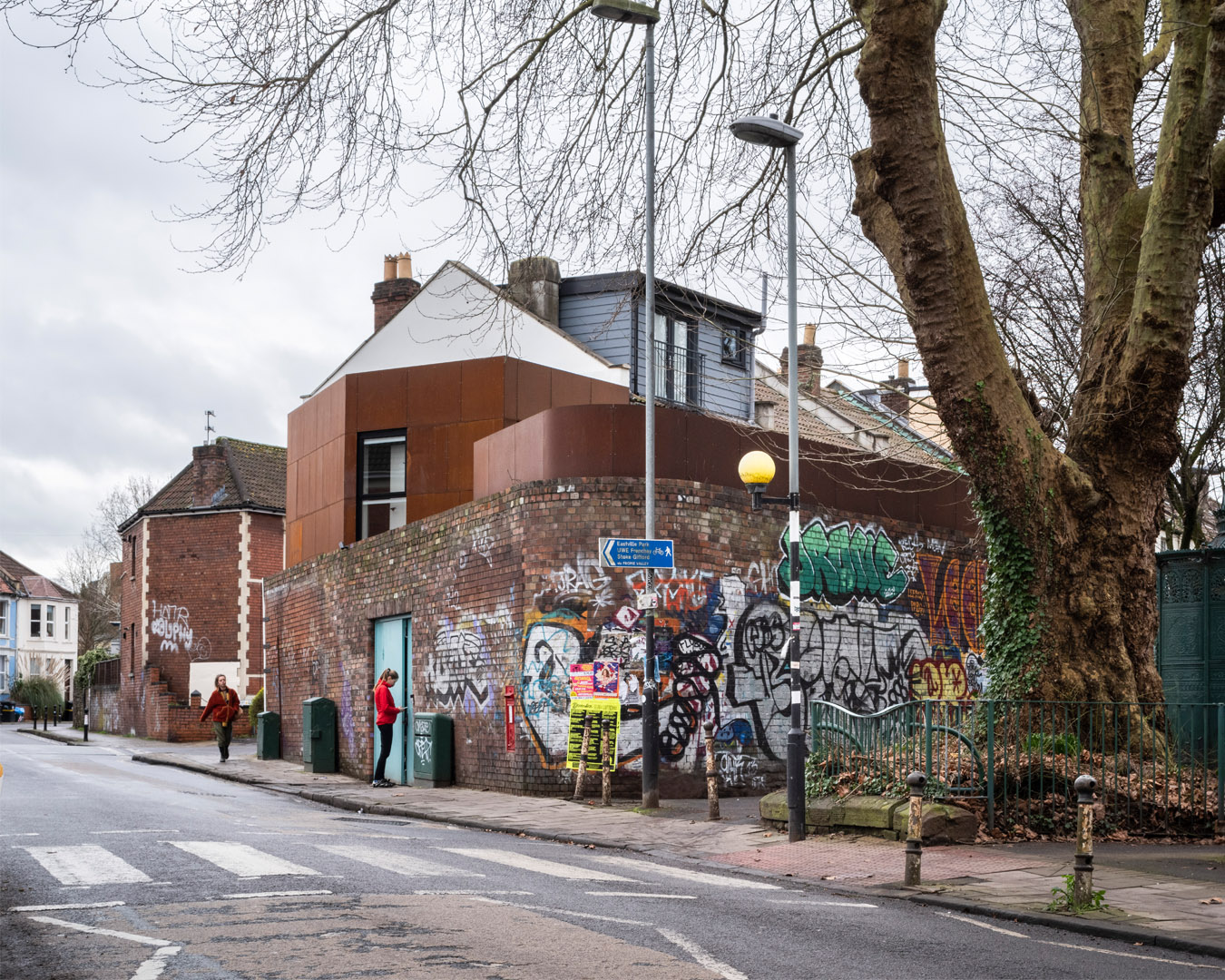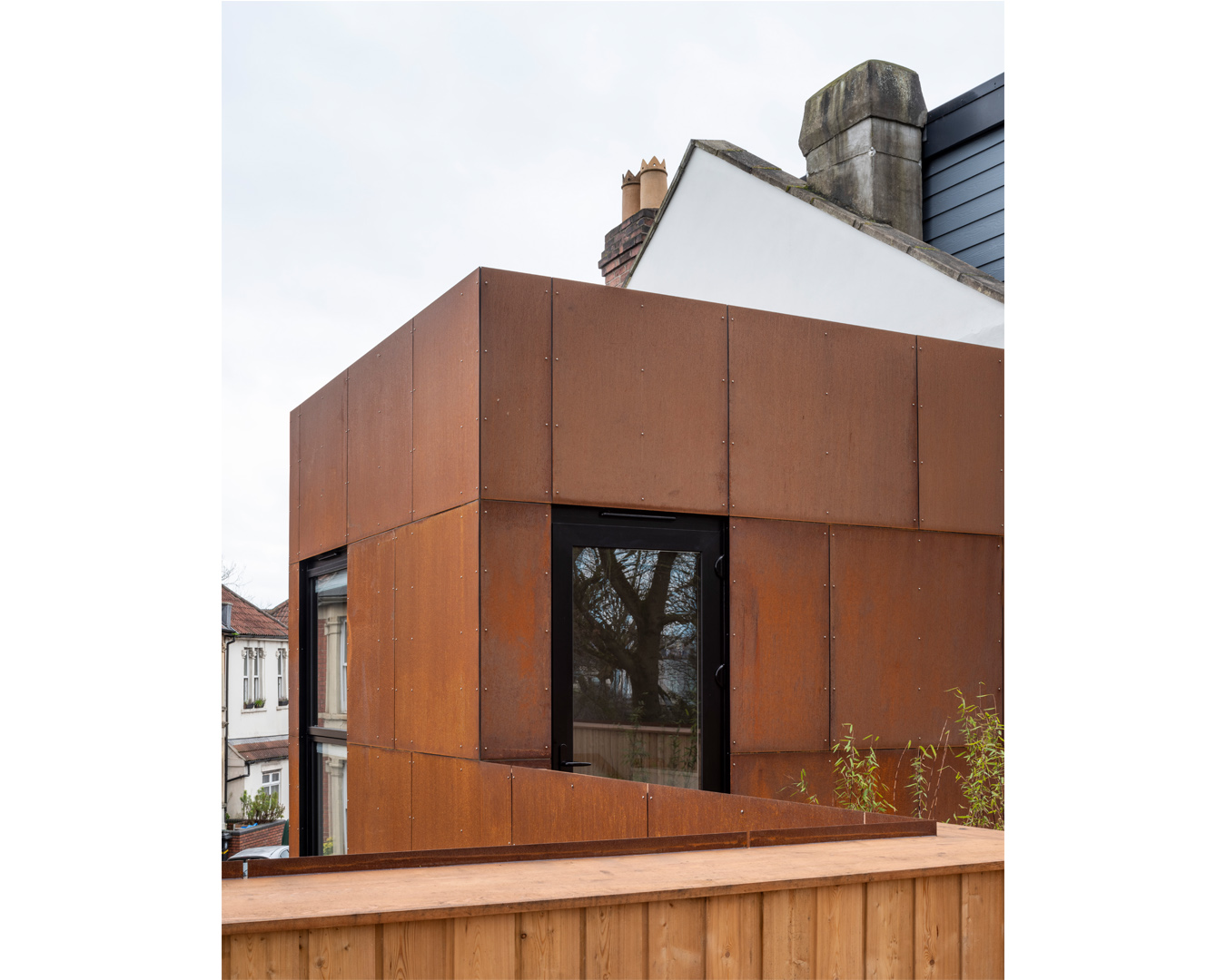 We provided full architectural services for this bespoke one off house project in Bristol for a private client. The unusual, challenging triangular site was contained within an existing brick wall which we carefully retained and restored as part of the project. A new, lightweight, sustainable timber frame house was inserted into the existing wall, adjacent to a huge Plane tree and local park within a Flood Risk Area. The design features a courtyard entrance, with glazing on all sides of this quiet space, set back from a busy local road. The project fills the small site, and proposed a roof terrace garden at first floor level which looks over the surrounding area and neighbouring park. The flexible layout provides 2/3 bedrooms, with an accessible ground floor layout enabling the client to largely occupy just the ground floor due to mobility issues. The house is clad in a bespoke Corten weathering steel skin that envelopes the building and provides it with a subtle contemporary appearance within an area of Edwardian terraced housing.