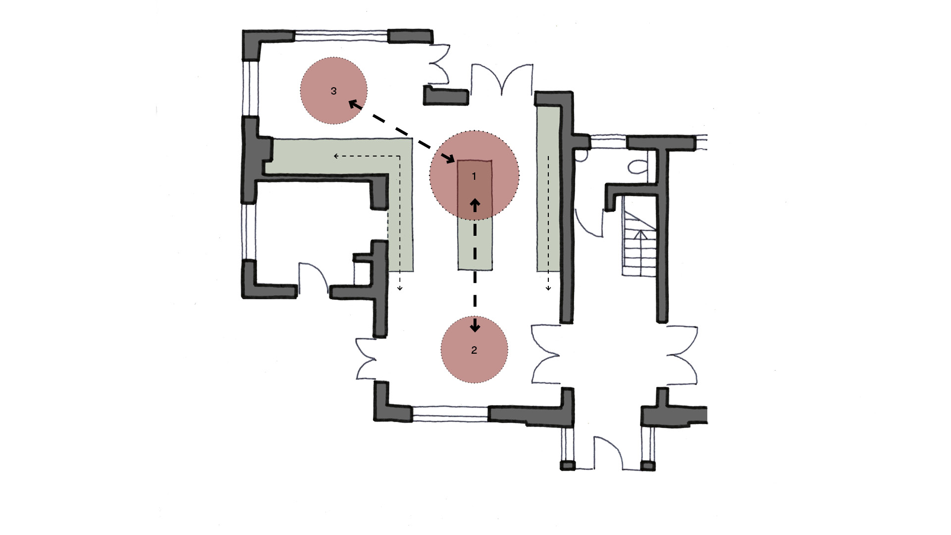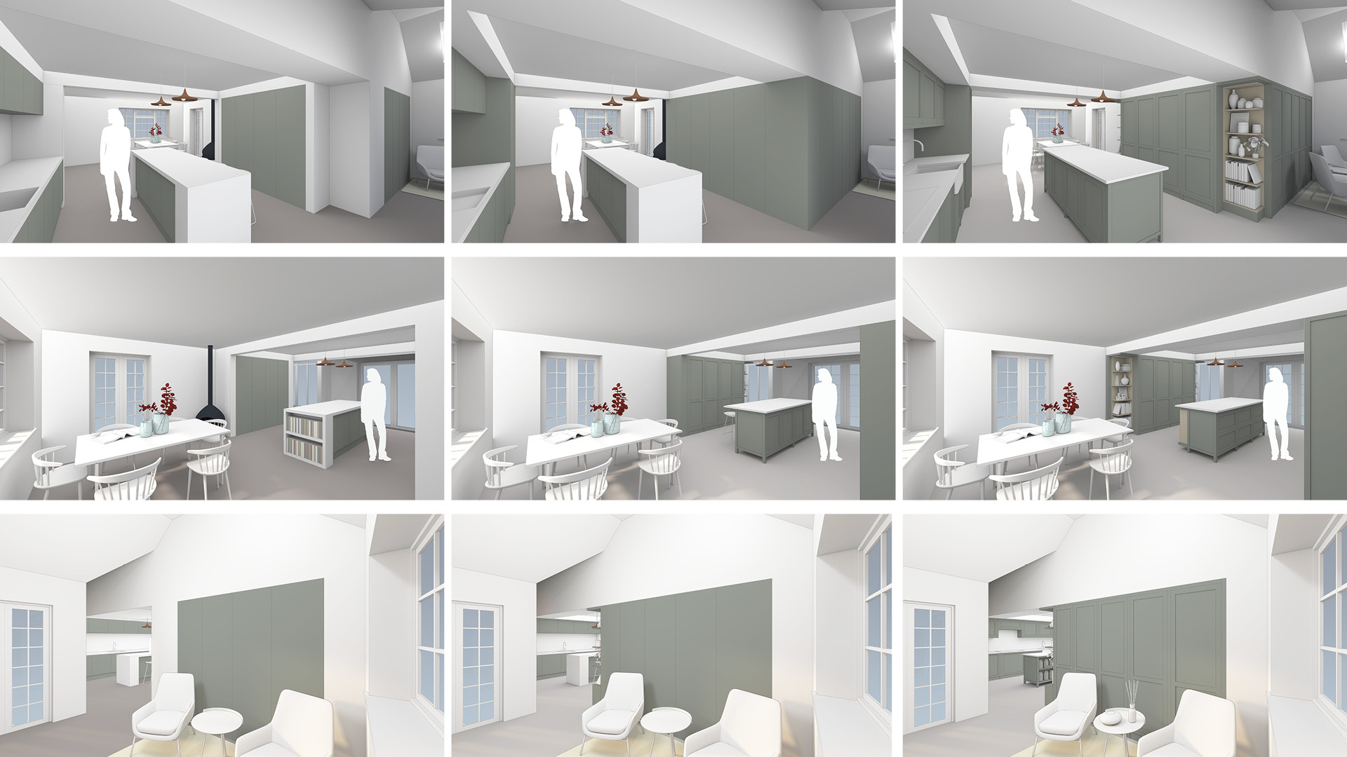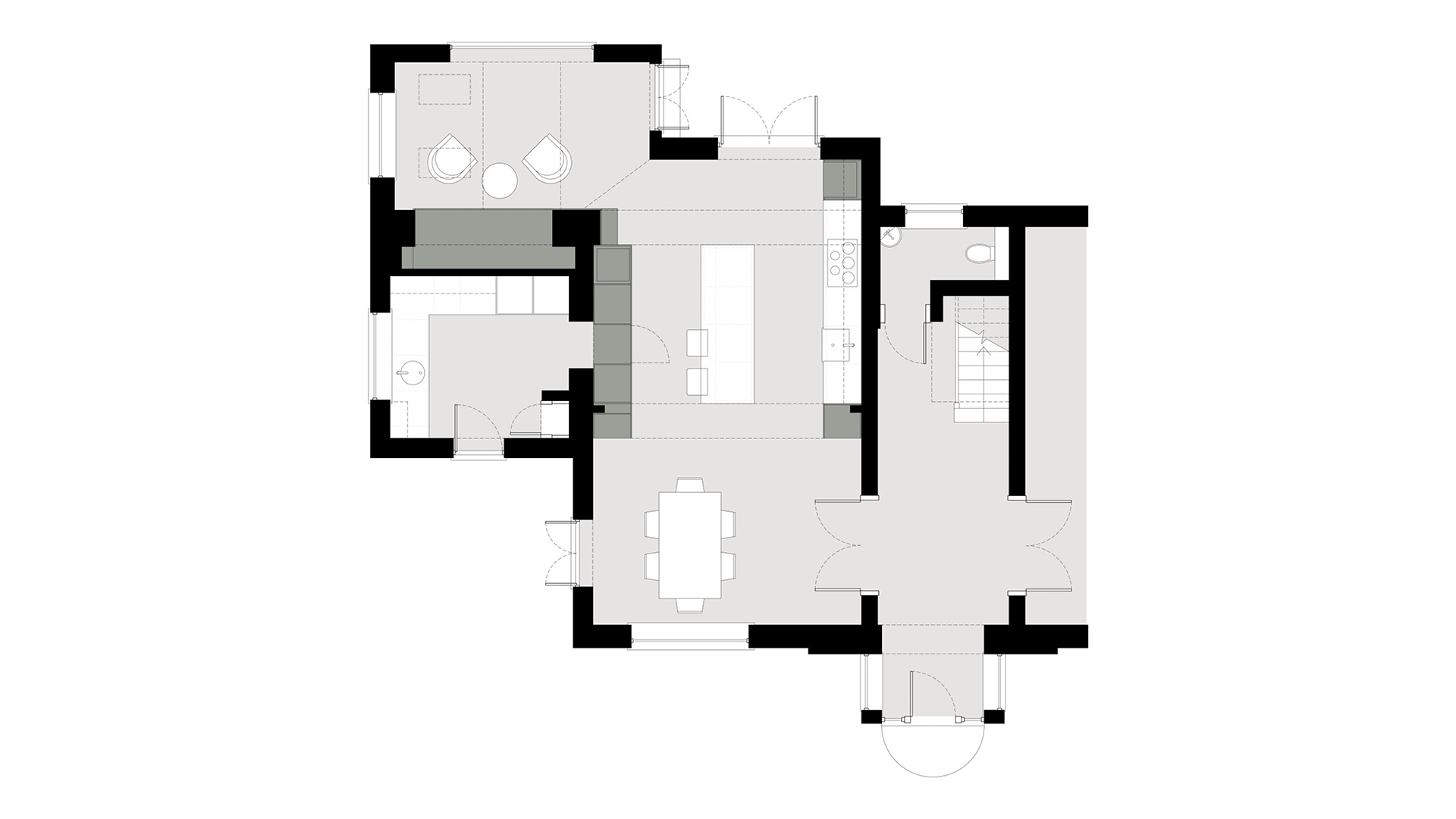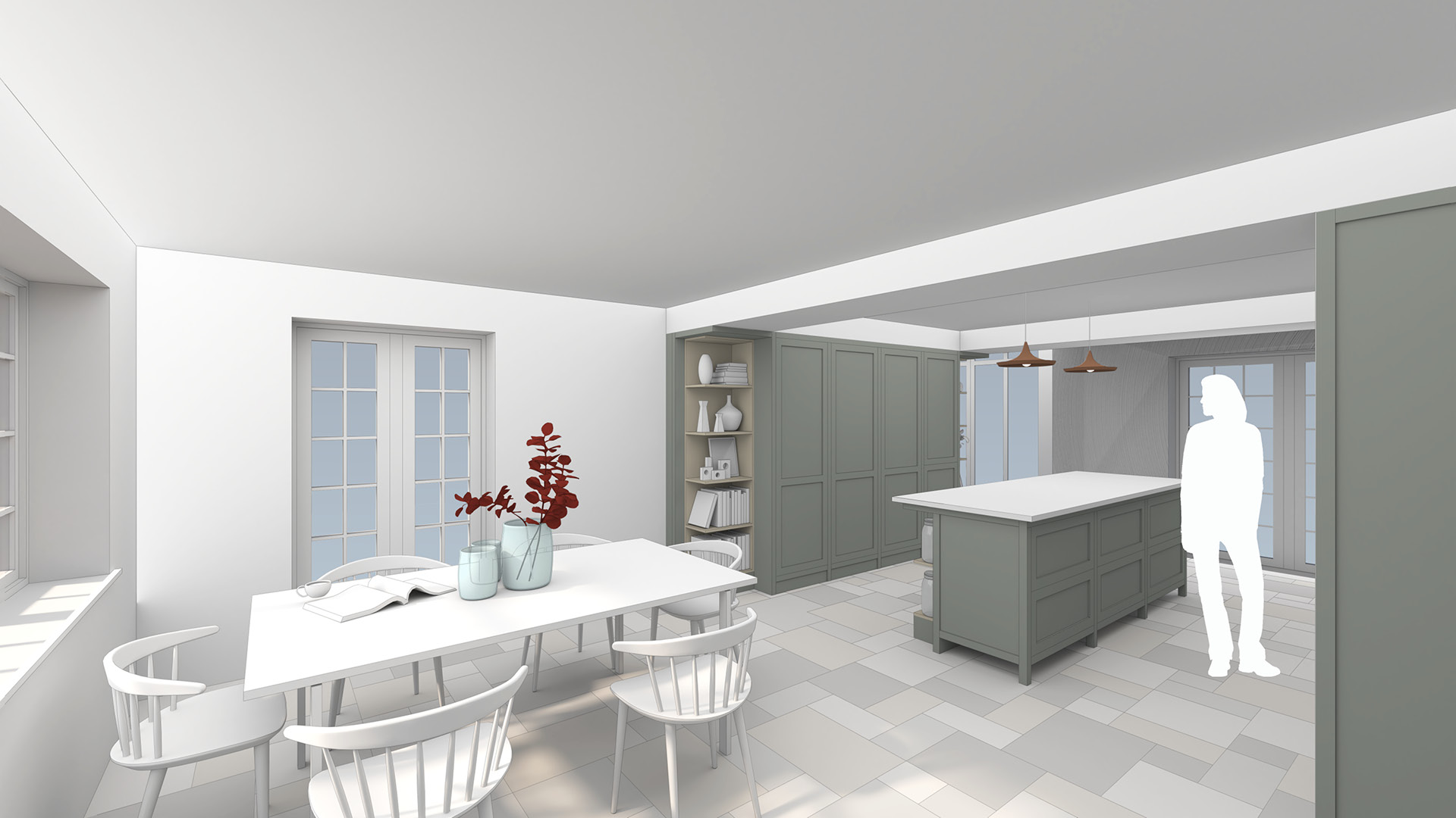Selling Court is a detached private home in Selling, near Faversham. Our client had recently moved in and wished to create an open plan kitchen and dining space for entertaining friends and family. Through a programme of workshops with the client, we carried out a series of spatial studies, using drawings and visualisations, to test options and refine the design to create a space that is both functional and uplifting. Physical material samples were used throughout the process to help inform the selection of internal finishes and bring the spatial concept to life. Our proposal removed a load bearing wall to connect the existing living room and dining room to create a generous open plan space, which benefits from multiple aspect windows that bring daylight and sunlight into the space throughout the day. An existing kitchen window was enlarged to form a new door creating a direct physical and visual connection between the kitchen and garden. At the heart of the space, the kitchen was carefully reconfigured to optimise the layout of appliances and make best use of the available space. Arranged around a central kitchen island, bespoke kitchen cabinetry and joinery elements were used to knit the kitchen, dining and seating zones together and bring a warmth and unifying character to the space.