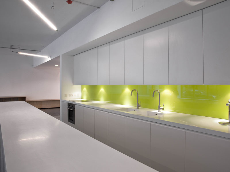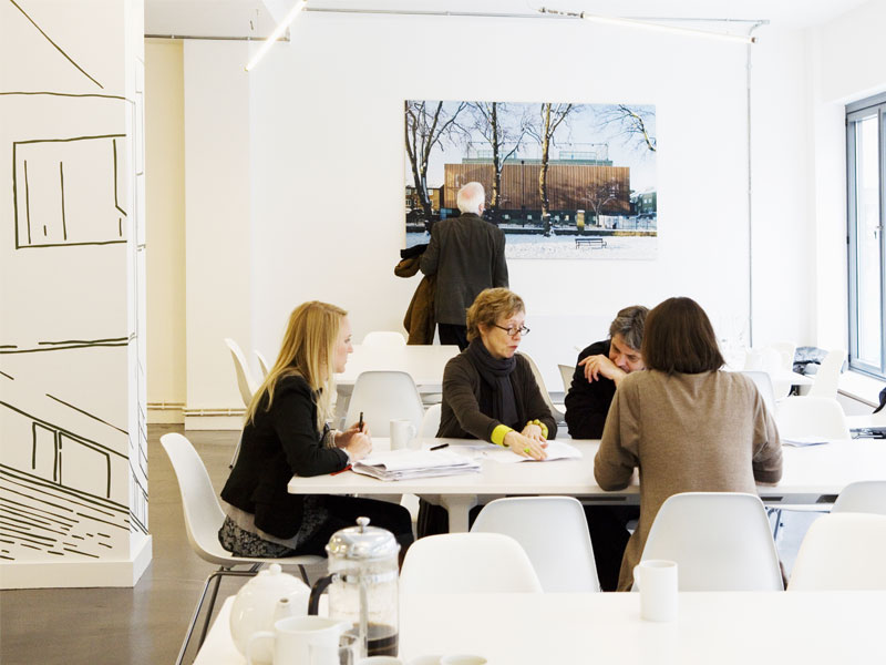 Feilden Clegg Bradley Studios moved their London office into Twenty Tottenham Street to give themselves a ground floor presence and a shop window onto the street. Their studio covers the ground and first floors of this building and is next to the Derwent London showroom. A new bespoke plywood stair tower inside a larch covered timber box connects the two floors and allows natural light into the deeper parts of the plan. FCBS were keen to provide a public vantage point for their work and to offer a series of events throughout the year that engage the wider community. The ground floor provides for this by housing a large flexible cafe space with a simple white kitchen along one wall. Lunch for the staff is catered for in house and the space is used at other times for conferences, lectures, presentations and exhibitions.