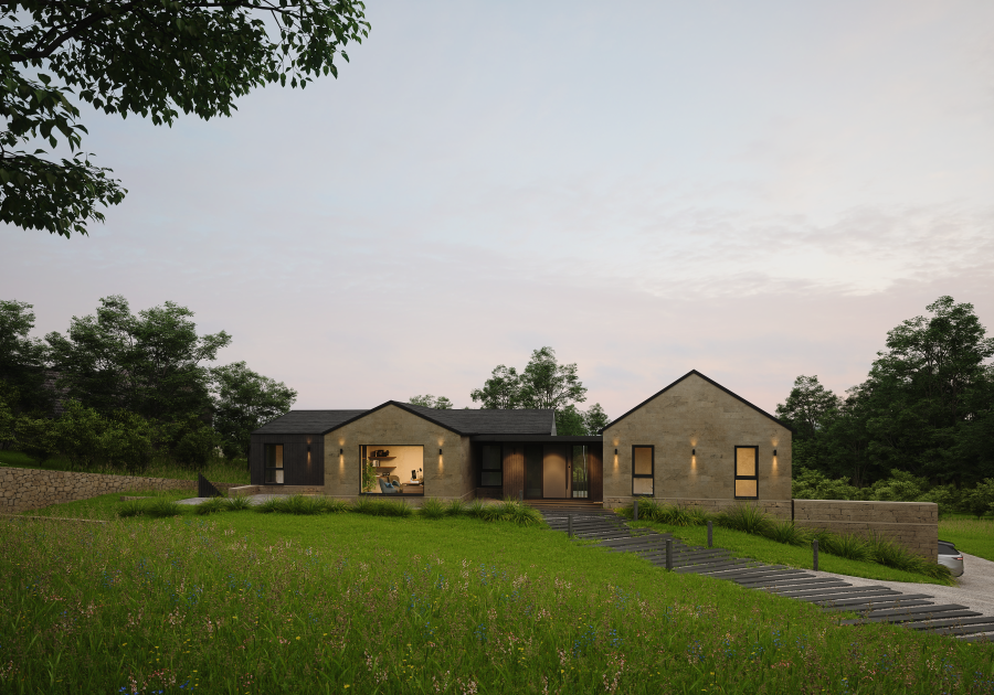 Lodgehill House is a 5 bedroom new build dwelling replacing an existing run down house on the site. The site is located between Great Brickhill and Little Brickhill and is surrounded by mature trees on a sloping site that is very secluded and provides amazing countryside views. We have designed the house as not to appear overbearing and to respond to the countryside setting of the site. The house therefore appears as a collection of smaller buildings with a rural / agricultural feel which are externally clad in stonework and timer cladding reminiscent of the rural vernacular. We have utilised the slope of the site to nestle the house into the landscape with the front of the house appearing as a single storey whilst at the rear it appears as two storeys. The design reinforces the single storey feel by featuring a stone plinth storey to the rear onto which the single storey entrance level sits creating a house that respects and compliments the character of the site.