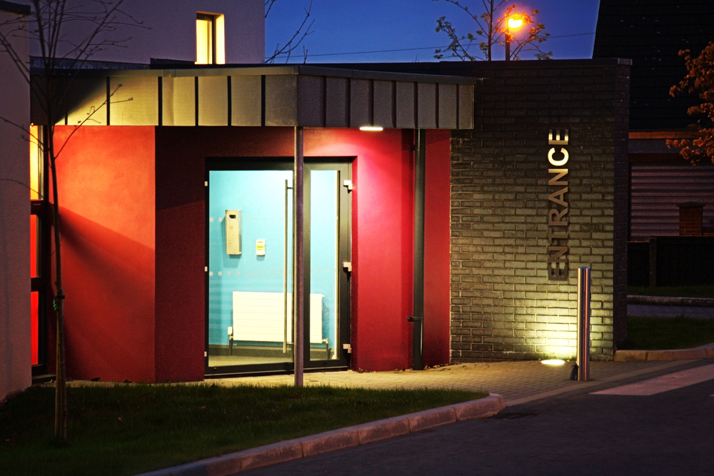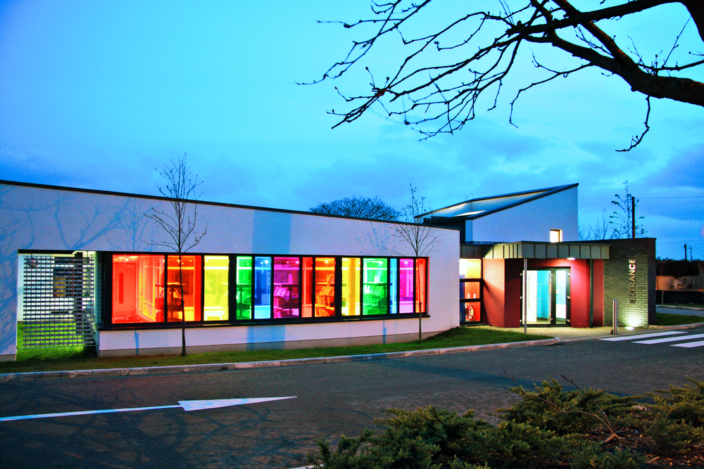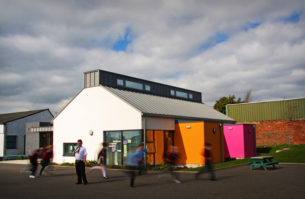 The SEELB appointed BGA Architects to produce feasibility options for development at this Lisburn Primary School, following serious fire damage, as the result of an arson attack in April 2006. The ‘National School’ building on the site dated from 1906 with two subsequent extensions, the most recent of which, a block of six classrooms to the rear of the school, suffered the fire damage. The Board took this opportunity to rationalise the accommodation, from sixteen classrooms before the fire to eight, to meet the current and anticipated future intake, as well as addressing other issues with the existing complex. The main entrance to the school was uninviting, hidden & remote from the car park, concealed behind the 1906 building, which was of little architectural interest and dominated the public face of the school to the main Hillhall Rd. It suffered from damp, was in a poor state of repair and on a significantly higher level than the main school making accessibility difficult. The buildings didn’t present a very positive or welcoming image to the public. The approved scheme involved the demolition of both the fire damaged block and the ‘National School’ building, the construction of a new 2 classroom block to the rear and the re-organisation of the main entrance. The aim was to create a bright, welcoming and contemporary centre of learning. The demolition to the Hillhall Road changed the orientation of the school, opening the entrance to the public, engaging not only with the school family but creating dialogue with the neighbours and wider community, creating a positive focal point for local regeneration. The treatment of this long single storey front elevation was considered in detail to ensure the legibility of the new focal point entrance. A skin of monotone fibre cement panels was applied to the existing kitchen block, facing the main vehicular entrance. This simple block contrasts with the dynamic crisp white rendered parapet walls and large area of rainbow coloured glass, leading to the overhanging zinc canopy of the entrance lobby. The external hard and soft landscape design retained the existing mature trees and provides a new one way traffic system and additional staff parking. The new reception area and entrance lobby design involved only 20m2 of new floor space, making maximum use of the original construction. The aim was to provide an accessible, bright, welcoming and stimulating entrance area. Double height spaces with frameless glass rooflights, rainbow coloured glass panels and a focal point reception desk and were designed to create a sense of interest in the space. The new Primary 1 and 2 extension to the rear is visible from Largymore Link, a busy connection between the Hillhall road and the M1 motorway. The classrooms were designed with ‘lantern’ roof profiles with high level operable glazing, facilitating natural stack effect ventilation. The shared resource area benefits from frameless glass rooflights as well as a glazed south-facing wall with a sliding door opening to a paved play area with the playground beyond, an over hanging canopy provides a degree of solar shading. The pitched roof and flashing details to the flat roof are finished in standing seam zinc. The use of crisp white render integrates the new additions with the retained school buildings. The work was phased to ensure minimum disruption to the functioning of the school. Teamwork was key throughout the process involving the SEELB, headmaster, pupils, consultants and a good main contractor giving the entire school community a renewed sense of pride and identity.