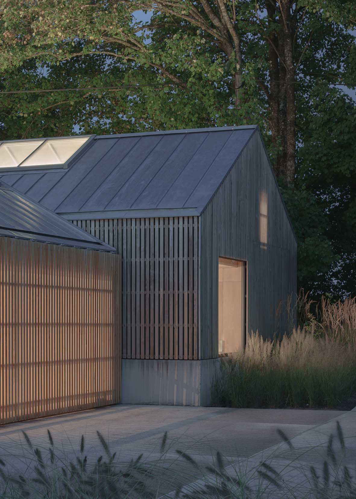The Autobarn is the realisation of our client’s long-term dream to house his collection of classic German cars. The project is composed of two volumes: a clean, five-bay garage for everyday use and a taller workshop for repairs and future restoration projects. Beyond satisfying this initial use, the project ambition was to create a flexible, ‘long-life, loose-fit’ building that could be used for a range of different uses. Currently it doubles up as event space, however the ambition is that the Autobarn could one day become a low-energy house. Located on the outskirts of a small Somerset village, the project is set within the grounds of an eighteenth-century Grade 2 listed house. It replaces several haphazard outbuildings and consolidates their amenity into an elegant architectural proposal, nestled within a glade of mature trees. The project’s design references the language of neighbouring agricultural barns. As a practice we are interested in reassessing the rural vernacular, both for its contextual appropriateness and its lessons in low-cost, pragmatic design. As such, the Autobarn re-interprets simple forms and methods of construction, adapting more temporary, rudimentary methods into a robust and elegant paradigm for low-cost, rural architecture. Composed of a concrete base and steel framed structure, intermittent timber cladding and zinc metal roof, the Autobarn adapts barn typologies with varying levels of refinement. Consideration was also given to its weathering, with the natural zinc roof dulling to complement the silver patination of the sweet chestnut cladding. The building’s ‘long-life/loose-fit’ ambitions have meant that the insulation and energy performance exceed residential standards. Although thermostats are currently turned down for its current use, the building includes underfloor heating powered by an Air Source Heat Pump, as well as additional first fix services hidden behind the internal wall paneling for future conversion.