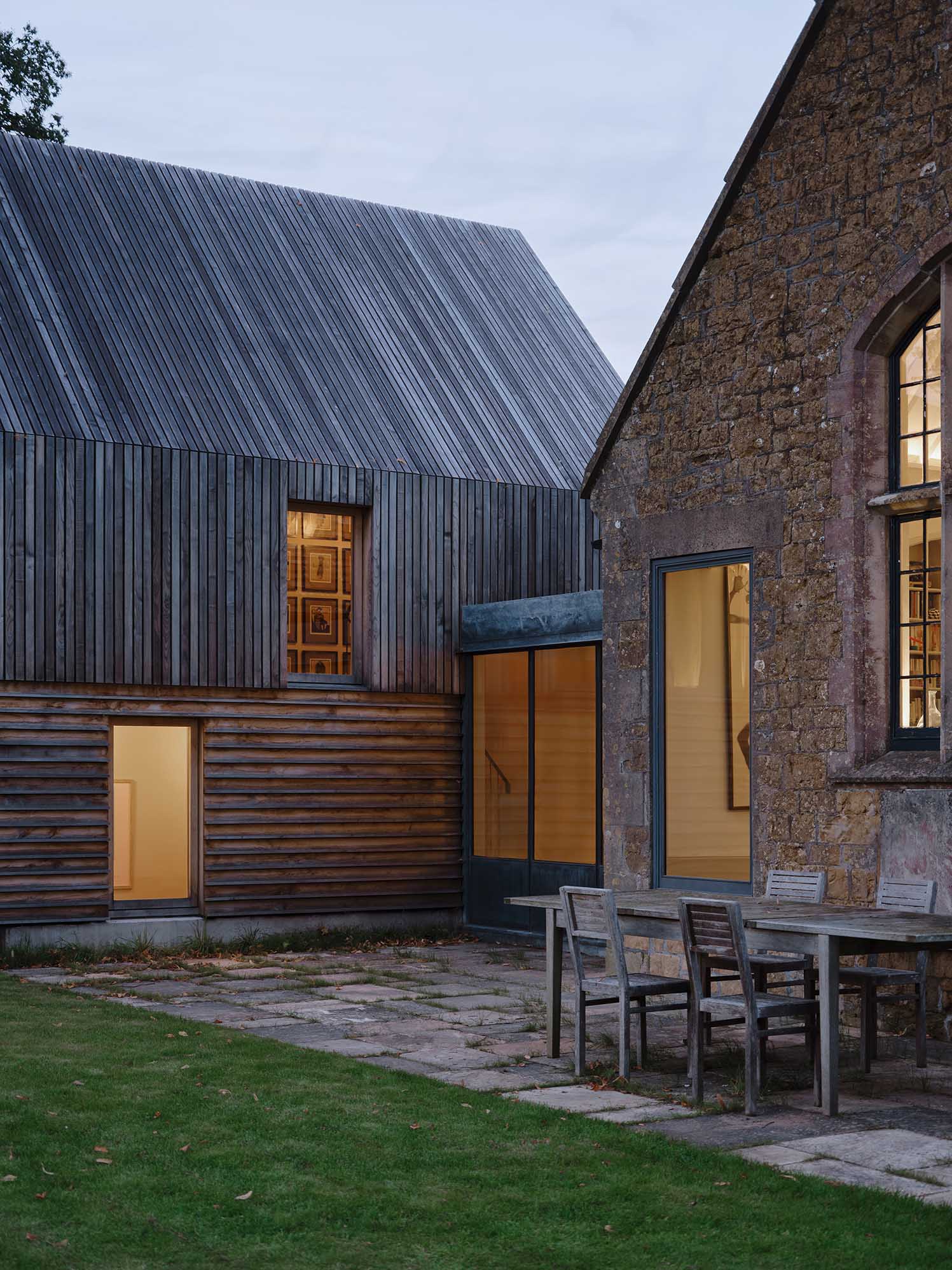 ‘Immaculate detailing and beautiful craftsmanship are evident throughout this project, showcasing a meticulous attention to detail.’ ‘A clever, elegantly executed scheme that delivers a lot, whilst showing a welcome design restraint.’ British Home Awards Judges (2024) British Home Awards Extension of the Year 2024 RIBA South West Award Winner 2024 The Wood Awards Highly Commended 2024 Old School House is a Grade-II listed home nestled within a picturesque valley in Pitcombe, Somerset. Originally built as a small local school in the mid 19th-century, it was converted into a house after WWII and subsequently extended in the 1970s. However, this later addition was poorly planned, sitting unsympathetically against the original building and providing squashed and inadequate bedroom accommodation for subsequent owners. When Bindloss Dawes were appointed in 2018 it became clear that the flawed extension needed to be replaced. Drawing inspiration from the scale and proportion of the original School House, a design was developed that was both distinct and sensitive to the existing architecture. Partly sunk in order to match the low eaves of the principal school building, it was possible to create a discrete two storey addition that simultaneously increased the floor area and sat sympathetically in its setting. Openings have been carefully placed to capture differing views across the valley, and the extension’s unimpeded position allows each room to capture light at different times of the day. The new extension is clad in locally sourced English sweet chestnut and built from a highly insulated and cost-effective timber frame structure. Chestnut was chosen for its sustainability, stability, and elegant grain, but also because of how it weathers, meaning that over the years the whole extension will mellow into a light silvery grey, complementing the weathered, locally-quarried Hadspen stone of the main house. Different designs for the timber cladding were explored, testing vertical and horizontal compositions in models and maquettes. The result was an open arrangement at roof and first floor levels, allowing rainwater to pass through the cladding and drain via hidden gutters, with a broader, closed board at ground level, breaking up the mass of the overall building. Bespoke chestnut pivot-windows were made to match the cladding, avoiding surface treatment to allow the whole building to weather evenly. A smaller link building connects the old and new, revealing some of the original stonework previously covered by earlier extensions. Composed of patinated galvanised steel doors, the room faces up the valley towards the setting sun and connects to a concrete and chestnut staircase, illuminated by a high-level east facing window that captures the morning light. The project was completed in 2023 and was recently awarded an RIBA award for the South West of England.