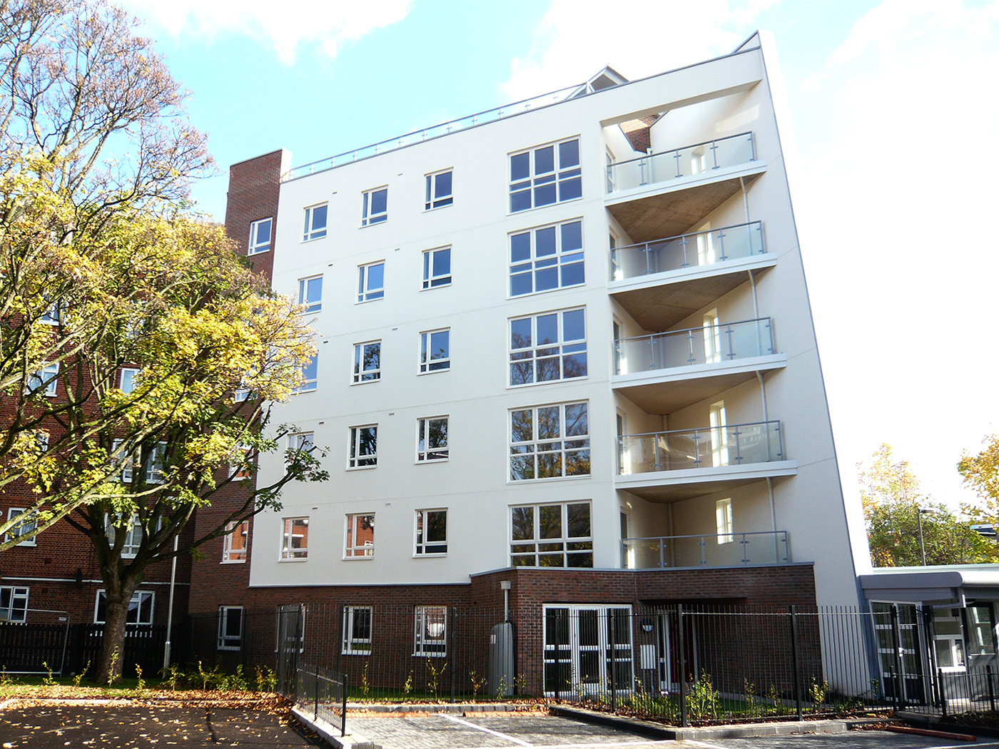This scheme comprised of 38 dwellings for social rent in four separate blocks: 3 four bed flats, 25 three bed flats and 10 two bed flats. The four blocks are free-standing at the ends of existing 5-6 storey blocks, next to the main railway routes into Waterloo and Victoria. BPG was appointed by Wandsworth Council to prepare a feasibility study for the site which contained a single-storey derelict Old People’s Day Centre. The site was blighted by antisocial behaviour so a key target for the scheme was to reclaim safe public use of the space. Our design developed from a careful analysis of the site which was designed to create a building form which did not impinge on the existing residents and avoided any loss of light. The design of each block included an acoustic buffer wall to protect the new dwellings from railway noise. A number of public exhibitions and presentations were made to the local residents, and their views were incorporated into the evolving scheme. BPG’s service included management of Consultants, ensuring compliance with the Councils’ requirements, with Lifetime Homes standards, Secured by Design accreditation, and Code 4 of the Code for Sustainable Homes. Many stakeholder meetings were held including Network Rail to obtain their agreement to the construction methods and working practices beside the railway. Planning consent was granted in 2009 following a number of public exhibitions and consultations to local residents (the planning application received more letters of support than objection).