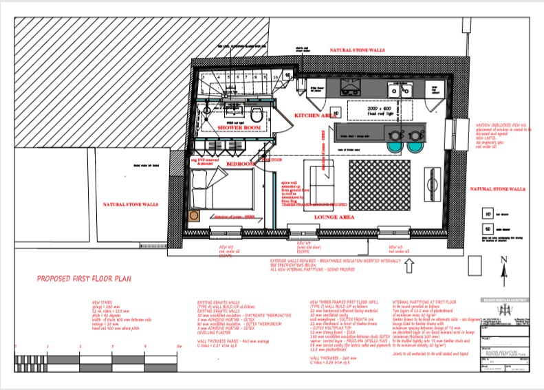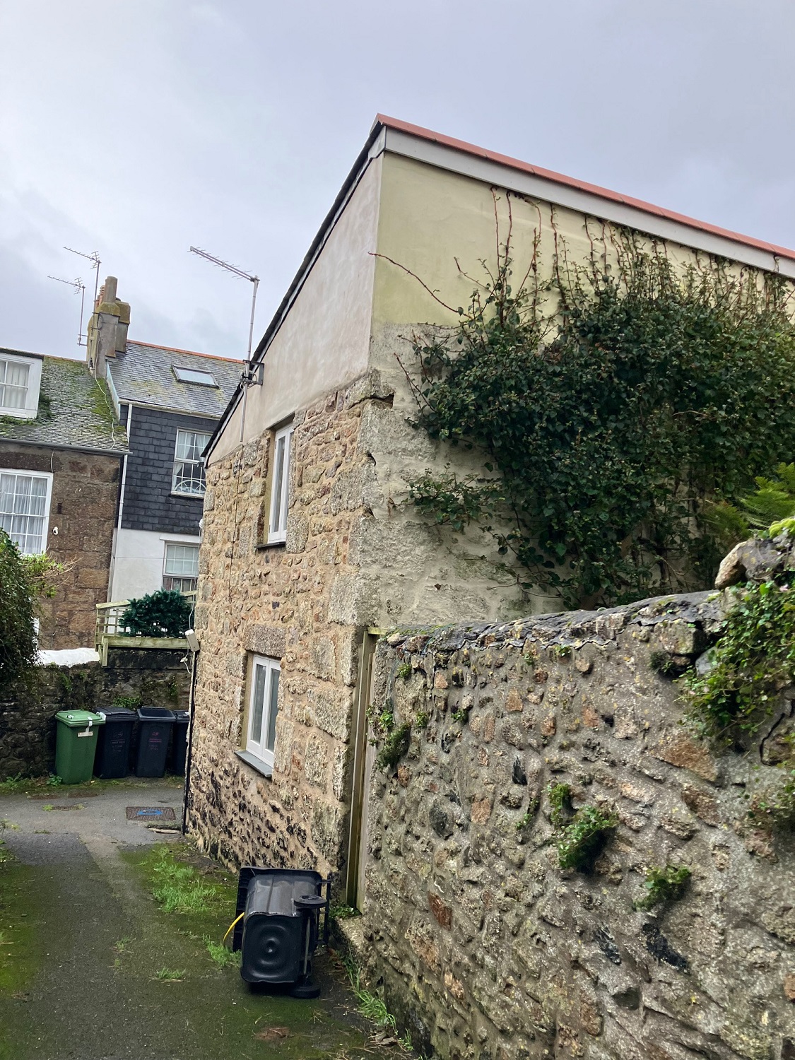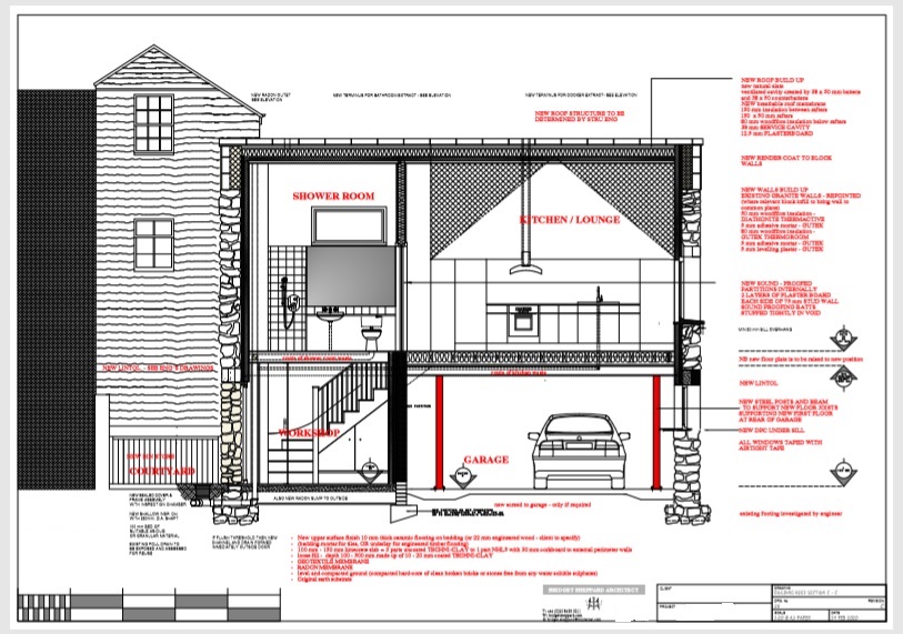 The clients required a retreat for when they visited mainland UK. They had purchased a derelict garage that had been vandalised and set on fire. Despite its poor condition it is a curtilage listed building to the rear of an elegant Regency square. It had once been a coach house. The project included sensitive reuse of surviving granite walls by removal of cemetitious render and repointing in lime, the insertion of breathable internal insulation (woodfibre) and the replacement of a temporary roof with natural slate. The first floor became an open-plan 1 bed apartment with new structure where a new bathroom, lounge kitchen and bedroom are located. The ground floor is a workshop and garage. The external appearance has simple joinery fitting for its non-domestic origins. and location in a conservation area.