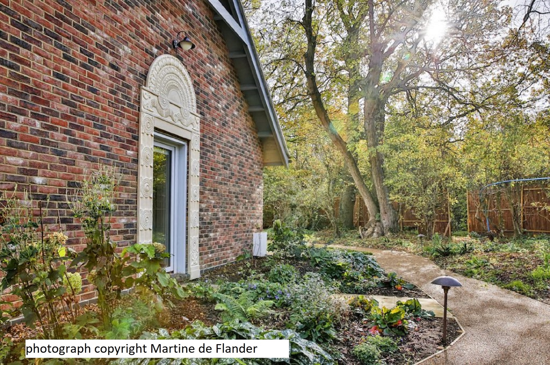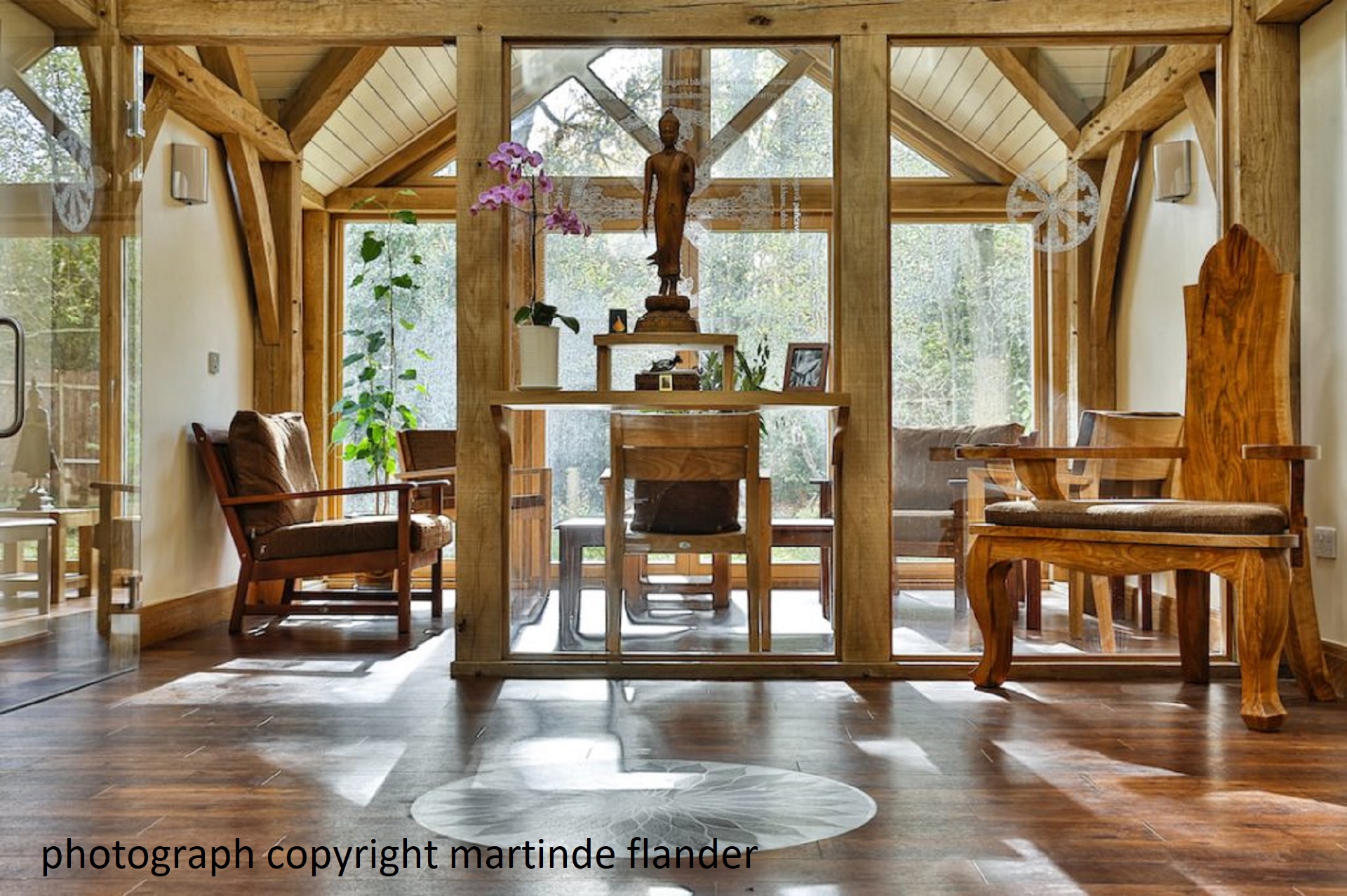 The project was for a new "Nursing Kuti* or sheltered house for an elderly Buddhist Abbott providing assisted-living within the grounds of a monastery. [*a Pali term]" This sect were Theravaden or Forest Tradition. The specification required an energy efficient house with close to PassivHaus standards. The site was set within a belt of mature trees at the edge of the monastery in an Area of Outstanding Beauty. The design was to complement and existing temple nearby which was built of brick and clay tiles and which had an attractive colonnaded cloister, the low-rise style of which became the blueprint for the new building. The plan form allowed for connection between all parts of the building and to outside with special thresholds. A reception room where the monk received visitors was placed in a garden room with views to the new garden. Super-insulated walls with heat recovery and an internal oak frame created a warm and welcoming home.