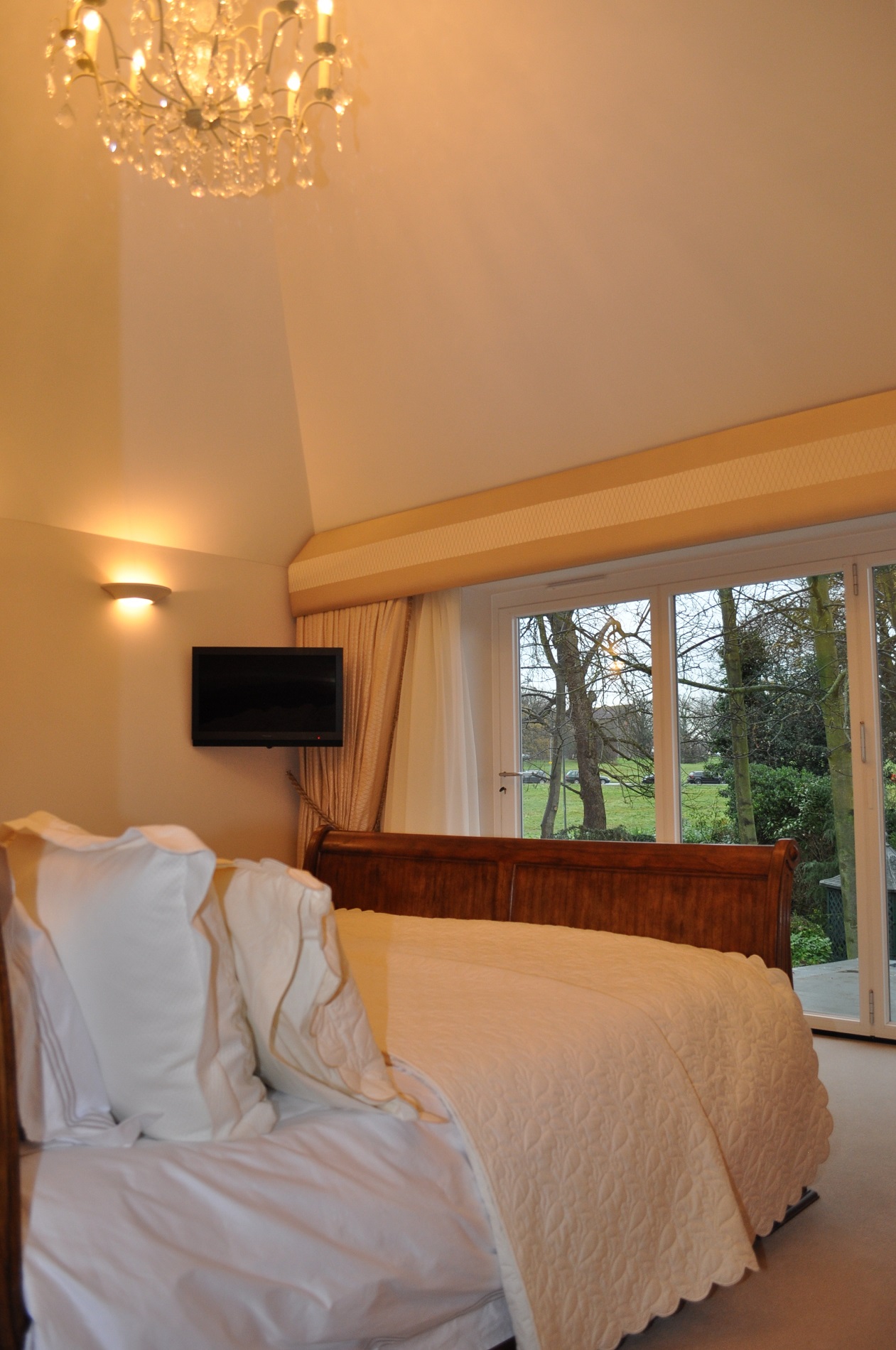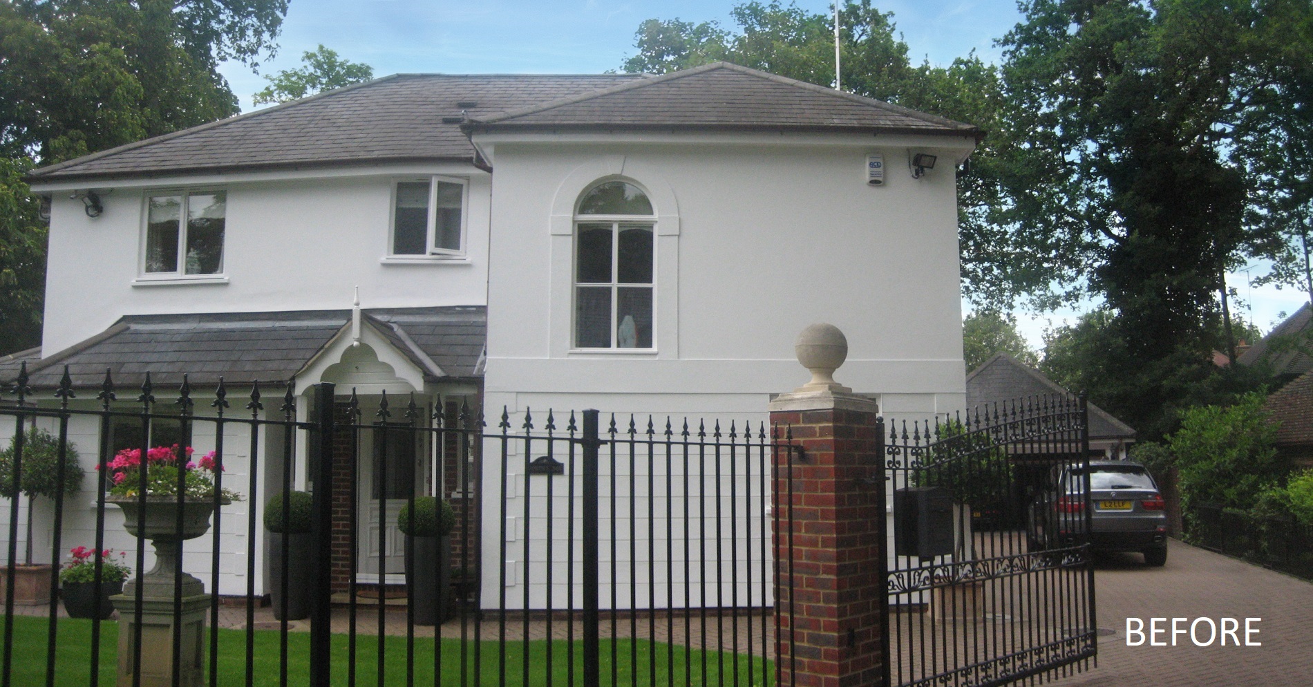 North Lodge is located in a Conservation Area and lies immediately adjacent to a Green. Mature trees and cul de sac location gave the house a secluded feel. The clients loved their house and had already commissioned a large amount of interior refurbishment ( kitchen bathrooms and large conservatory) before this new phase was commissioned. The brief was to create a two-storey side extension. The clients wanted a large garage and a new master bedroom and en suite all to be located on one side of the house. An existing drive led to a small garage that was inadequate in size for their vehicles. My impression of the house was that it was stunning inside but that the exterior lacked the same elegance. After discussion the clients were persuaded not only to build the wing but also to face-lift the rest of the house. This included replacement of entire set of windows and enliven the rather plain facade with new openings. High performance windows were installed as well as a new simple slate porch which replaced the rather quaint one. To save costs the garage was reused as a gym and wine store and connected via a new corridor with super views of the garden. The main focus inside was the creation of a dramatic vaulted master bedroom, dressing room, ensuite and a private balcony where breakfasts could be enjoyed amongst the trees. An existing shower room was also upgraded. A new wet room was squeezed between the new wing and the existing garage.