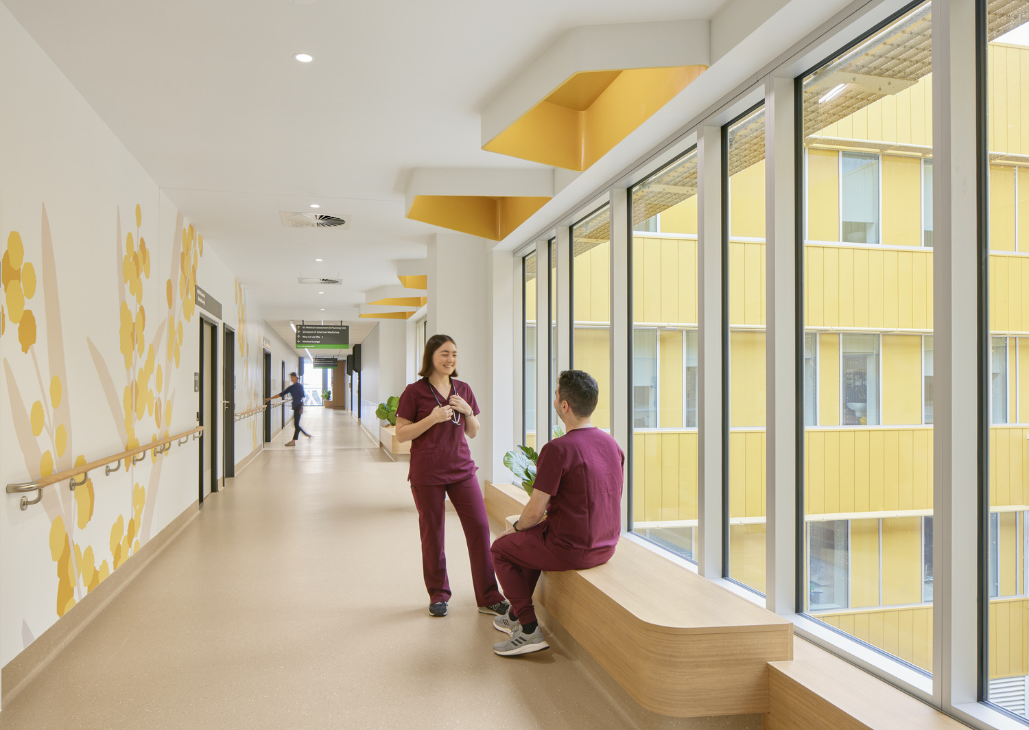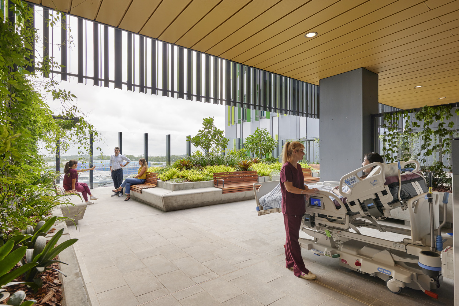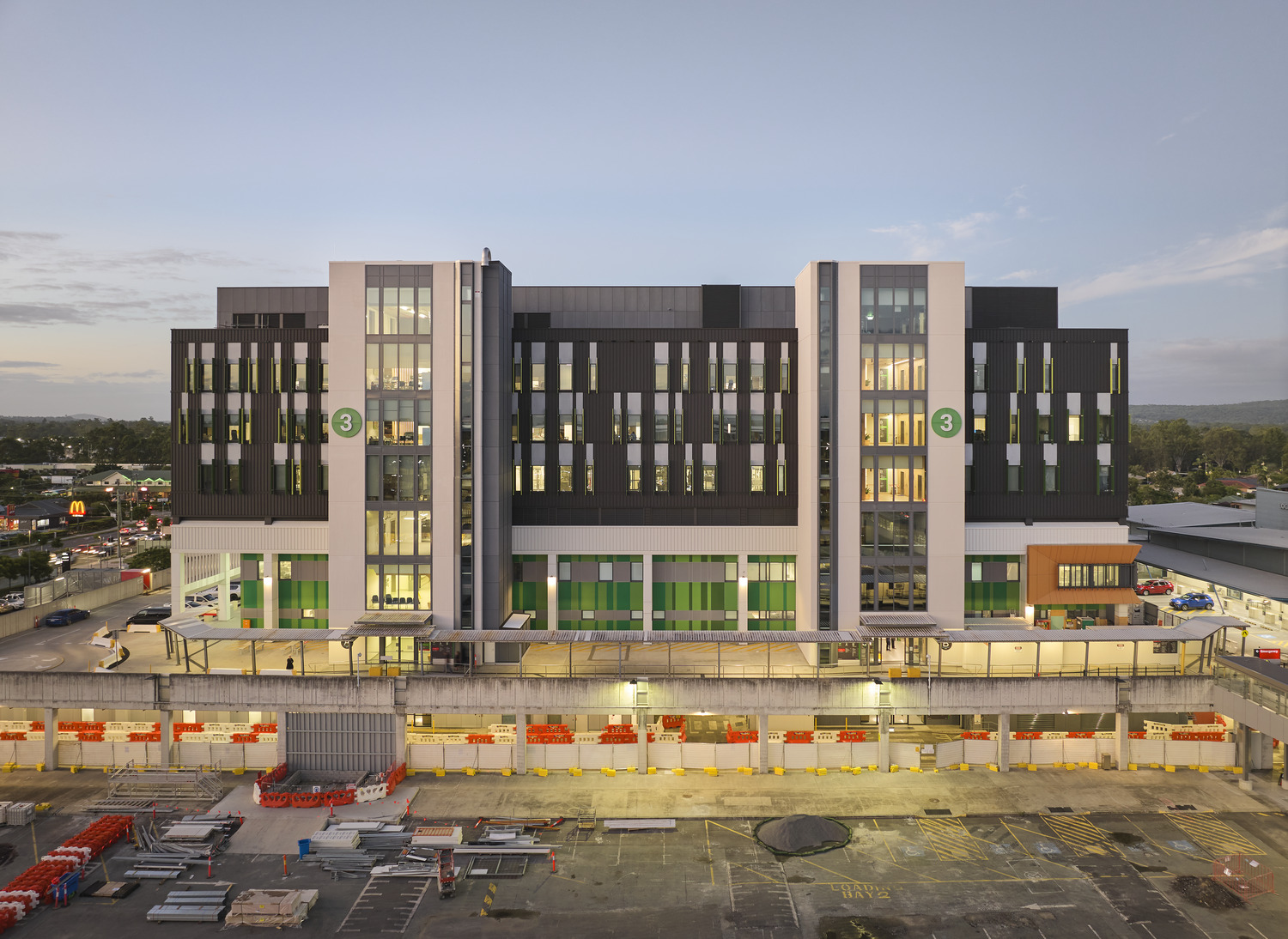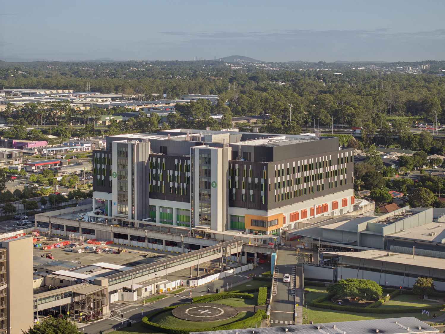 Our vital expansion for Logan Hospital increases clinical capacity and self-sufficiency while mapping out scalable future for this important health hub in South-East Queensland. Logan Hospital is the major health centre for the growth corridor between Brisbane and the Gold Coast and provides a range of specialty services for children and adults. More than 88,000 people present at the Emergency Department each year, making it one of the busiest in the State. Confronted with a rapidly growing population, an ageing community, high levels of social disadvantage and outdated infrastructure, healthcare services were severely stretched. Metro South Health needed more than an upgrade to facilities, it required a multi-stage expansion and precinct renewal strategy to increase both capacity and capability on campus. BVN was engaged in master planning of the $1 billion dollar redevelopment and delivered the architecture, health planning and interior design of Expansion Stage 1 that will bring better treatment options closer to home for residents of the region. Our master plan maps out a viable, phased strategy so Logan Hospital can scale up to meet the current and future needs of its community. The $460 million first phase involved a four-level vertical extension over the existing emergency department and refurbishment of the existing buildings. As well as adding over 200 new beds, the expansion includes a new intensive care unit, imaging, transfer unit, coronary care, older persons unit, education, training and simulation suites, pathology, maintenance workshop and other back of house facilities. Renovations to other existing buildings provide palliative care and expanded mental health care units plus upgraded kitchens and logistics departments. The design provides settings for clinical excellence, an optimised workplace and improved patient and visitor experience – including an elevated ICU terrace garden with hinterland views. Colour is used strategically throughout. On the exterior of the vertical extension, two-tone green sunshades pick up colour accents from the low-rise base building and connect visually to the distant landscape. As another example, soft gold cladding to the walls of an internal light court brightens corridors and wards with reflected light. As well as boosting mood, the colour is picked up in murals of native flora that provide memorable visual cues to assist with wayfinding. Creating welcoming environments for patient-centred care with calming and comfortable conditions – even in the busiest departments – also primes Logan Hospital’s new facilities to attract and retain top health specialists. Construction on this complex brownfield site took place concurrently with that of a large multi-deck car park. With extreme pressure for more clinical space, the project scope was increased to include development under the emergency department, sandwiching it between two active construction faces. Access was maintained to the existing general entry and loading docks, both of which passed through the construction zone. In close collaboration, builder John Holland and BVN successfully planned and managed all works to enable ongoing operations and safe passage for hospital users. By improving self-sufficiency and alleviating pressure on surrounding hospitals, Stage One in the redevelopment makes Logan Hospital the most accessible health hub for patients, visitors and staff of the Logan catchment.