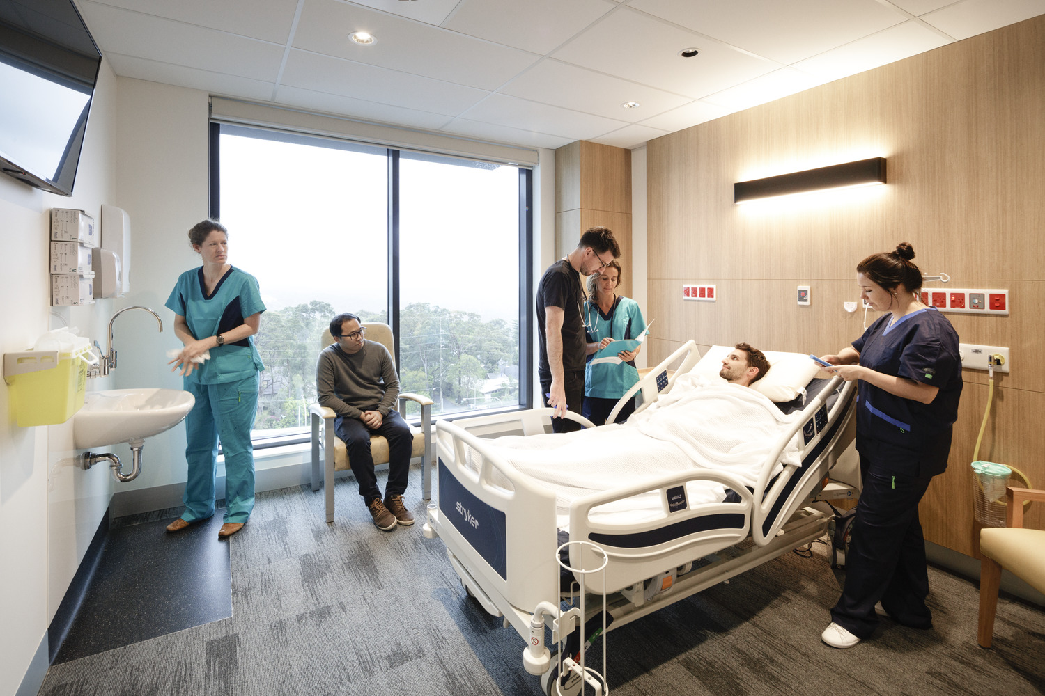 Hospitals are the epicenter of our most vulnerable experiences: from fighting a pandemic, to enduring long-term treatment, to celebrating new birth. They’re places of crisis, of emotional extremes, and where life so often begins and ends. They’re also places that can vary dramatically, between public and private care. Our design for the new Northern Beaches Hospital integrated the two giving the community a choice of care, both hosted within the one very human-centric building. Working closely with both NSW Health and Healthscope, our proposal to integrate rather than simply co-locate the two was driven by the desire to put people at the centre of the design. But it also presented opportunities to streamline costs, enabling the hospital to have the very best medical equipment and clinical environments. For a community that had waited so long for its own local hospital, this was particularly gratifying. Northern Beaches Hospital is an enormous facility and a very bold design. Working at this scale brought another challenge: how to make such a big building feel warm and welcoming. On entering the building, a low-ceilinged arrival foyer provides a moment to pause and check in. This intimate space gives way to a vast multi-storey atrium lit by large glass walls and a playful collection of skylights. It’s also home to two striking works of art celebrating the unique environment of the beaches nearby. The bark of a local scribbly gum faces one side and waves lapping along the sand face the other. It’s a welcoming space designed to both reassure patients and visitors, and to reiterate the connection to the community. From here patients leave the atrium and take corridors to their destination. These are deliberately shallow spaces so patients and visitors never have a sense of going too “deeply” into the hospital and becoming disoriented. Instead every pathway remains shallow, on the peripheries of the building, oriented by views of the outdoors, and aided by clear wayfinding. Both art and nature play a vital role at the hospital, for their emotional support and contribution to wellbeing. Images inspired by local flora and fauna line the walls - not only in the spectacular central atrium but throughout, from operating theatres through to patient corridors to waiting areas. Similarly, views across the forest and beyond are carefully framed to enhance the patient experience for public and private alike. But it’s not only the patient experience that we considered. For hundreds of medical professionals, Northern Beaches Hospital is their workplace. And with such a vast range of clinical care services, and volume of patients, hospitals of this scale are a particularly high stress work environment. Our design and the considered inclusion of art and nature, supports their wellbeing. Enabling world-class medical care, a high performing workplace, and a well supported community, Northern Beaches Hospital has already proven a design success for the people it serves. With a unique integration of public and private, and support for the emotional and mental load of every person, its truly a hospital for humans.