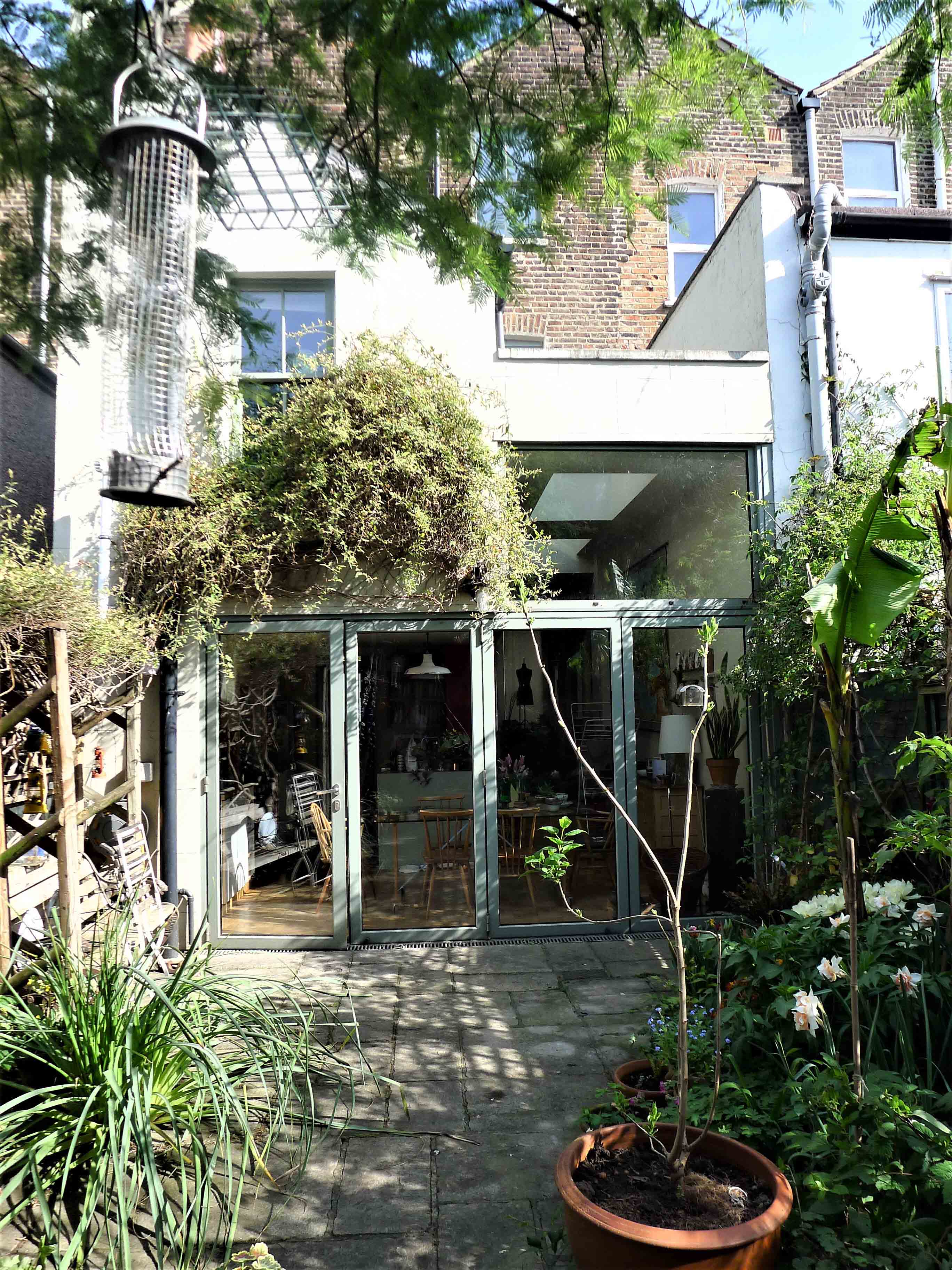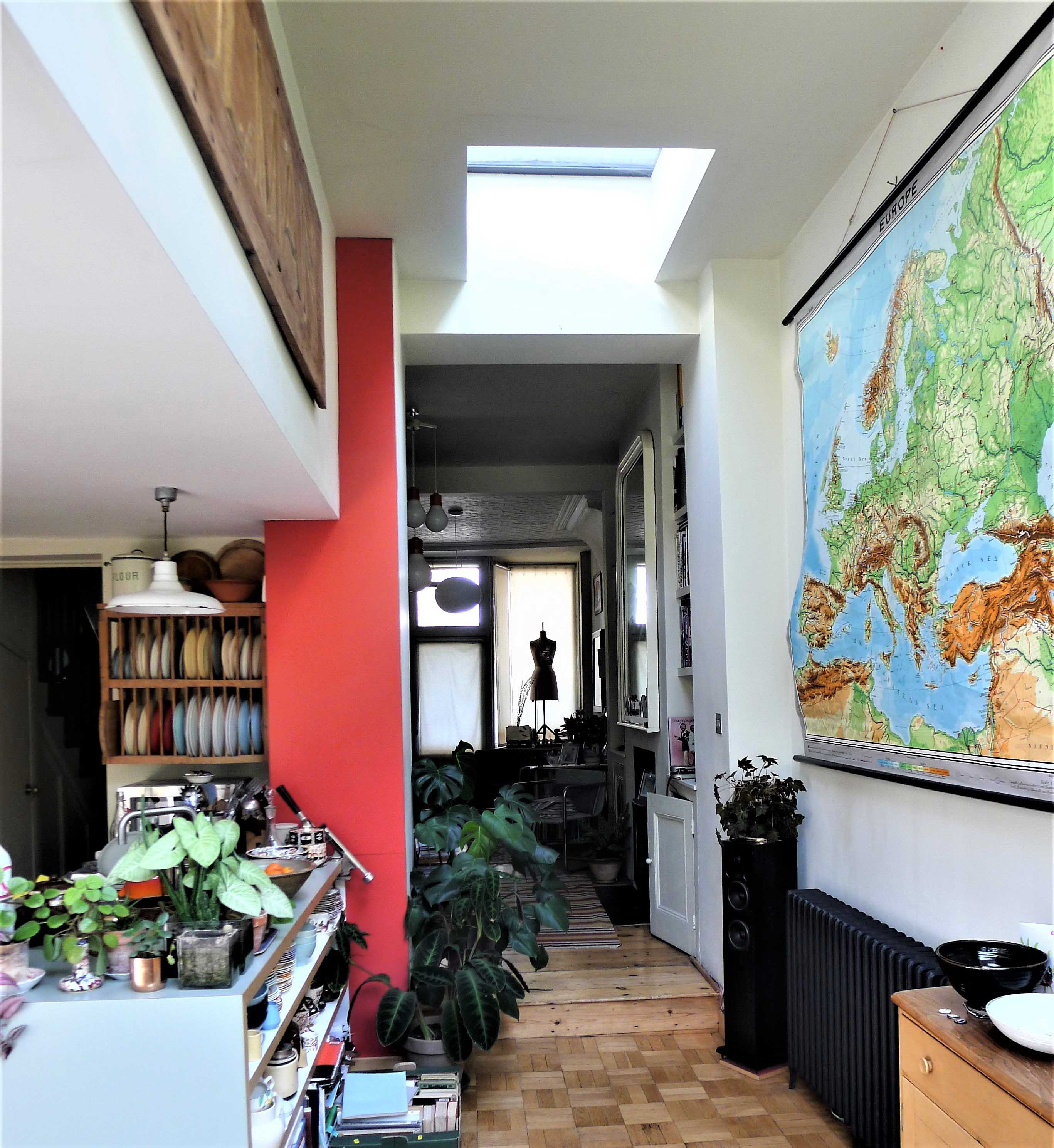 The kitchen was in the extension and felt very separate from the living area, a lovely room with high ceilings from its previous use as a shop. Extending at the side of the kitchen allowed both spaces to be linked but still function separately. The existing two storey party wall enabled the new ceiling height to be the same as in the main house