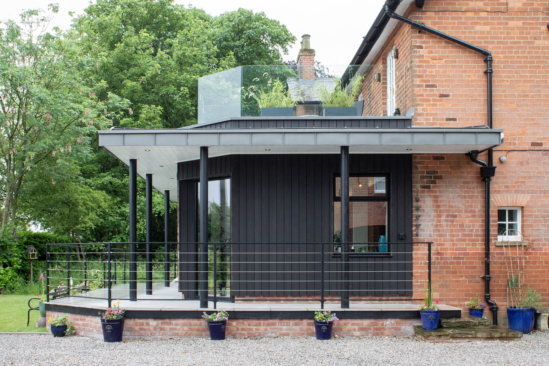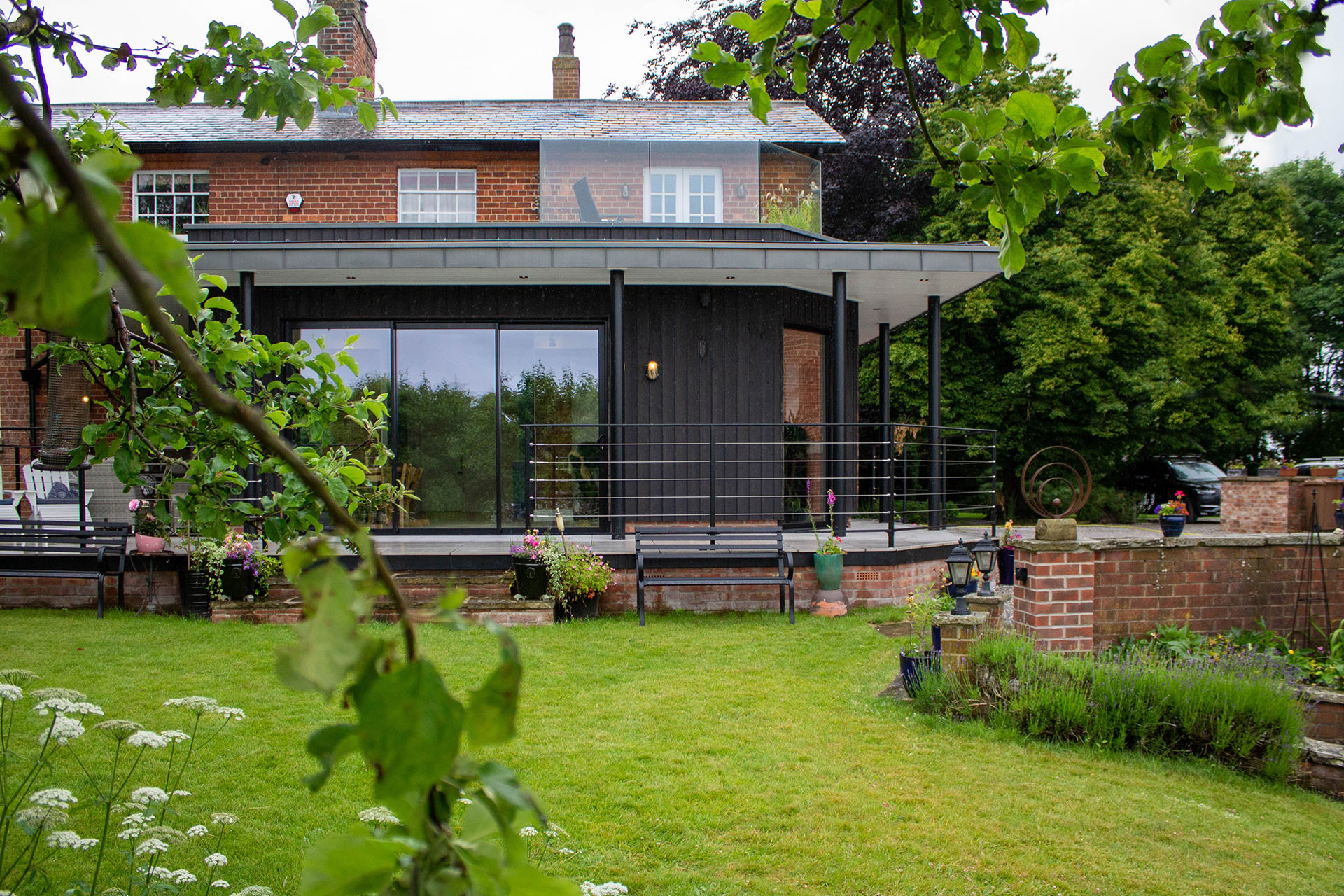 This project sought to improve the existing small, dark Kitchen attached to a large attractive house in a Conservation Area, together with adding a new family sitting and dining space. The proposals removed a large double chimney breast at ground floor level, to open the internal space up, and connected through to a new large single storey extension providing an open-plan space. Due to the setting, in a large landscaped garden, the extension takes the form of a pavillion, accentuating the horizontal lines with prominent oversailing roofs in standing seam zinc, supported on simple black steel columns. The walls of the extension are clad in a charred larch, which gives a softened, contemporary look which sits smartly alongside the darker red brick of the original house. One corner of the extension is splayed, pulling the walls away from a cantilevered corner, and also providing the opportunity for a picture window framing the view. The roof of the extension gives the opportunity for a roof terrace accessed from the first floor study, with stunning views across the gardens and Yorkshire Wolds. Regional Winner in LABC Building Excellence Awards 2021- Best Residential Extension