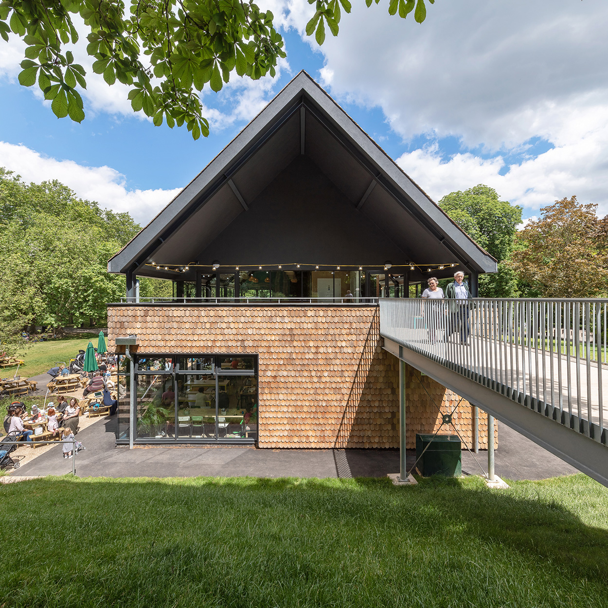 This award winning cafe is part of a package of improvement and conservation works for the wider park. The approved design is a 2 storey building that provides a park level cafe and terrace and an community event space at first floor level. The new building is situated in the same location as a former cafe but its orientation was shifted to be perpendicular to the park’s central axis. By doing this the building becomes the centre point of a new universally accessible route between the central axis and the lakeside path. The cafe is clad externally in half round cedar shingles. These were chosen to respond to the scaled skin of the dinosaur models, creating a connection between the cafe building and the models at the other end of the lake. Carefully chosen areas of glazing maximise views over the park from within the cafe at ground level and over the lake from within the events space at first floor. The new cafe business will support the ongoing conservation of the unique grade I listed dinosaur sculptures and geological illustrations.