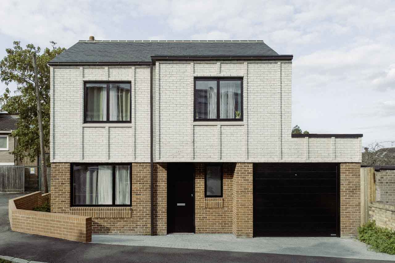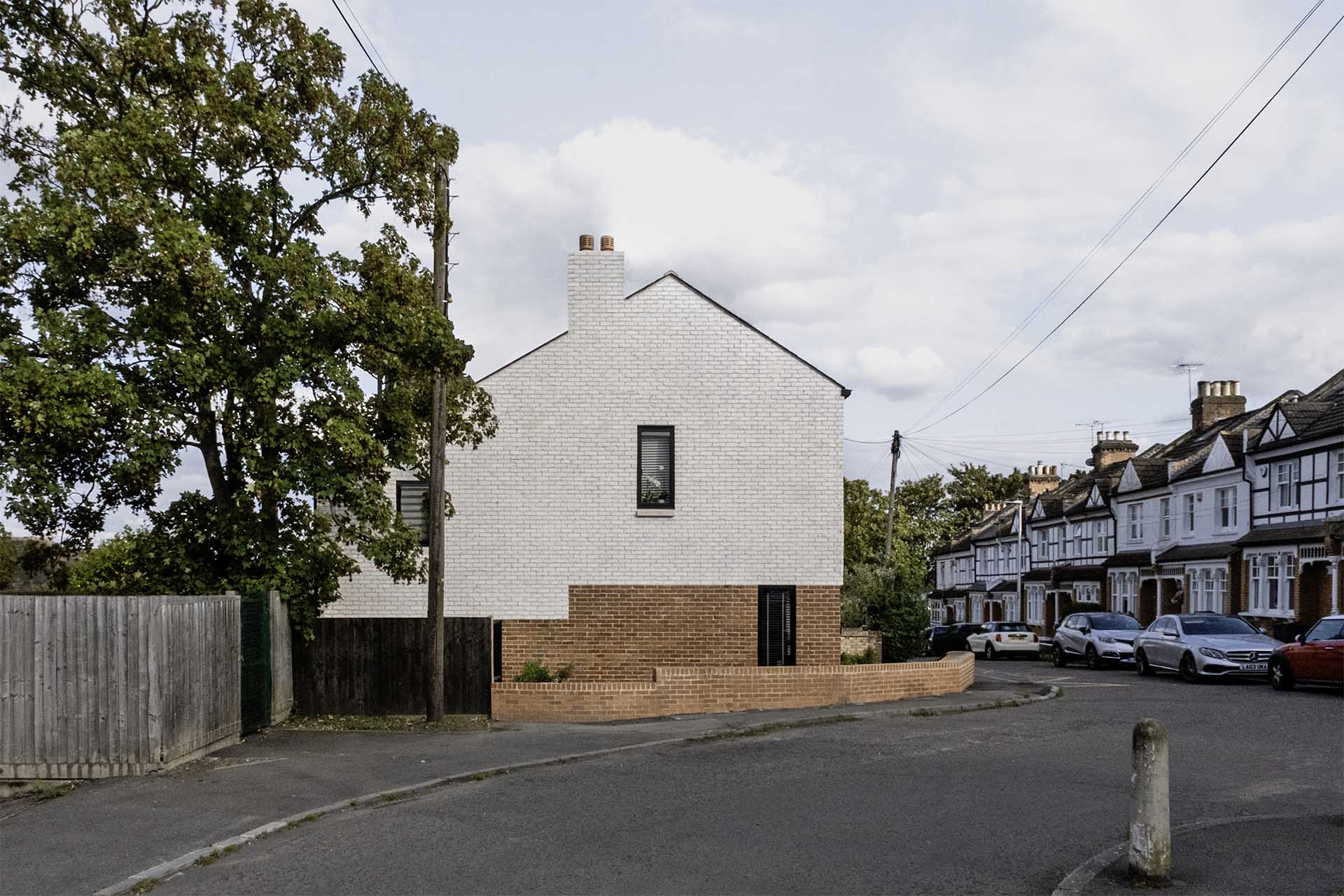 A self-build four-bedroom detached house in London Borough of Redbridge. We gained planning approval for the first new house at the end of a garden that backed onto a small cul-de-sac. The house was designed with a split-level arrangement take advantage of the natural falls of the site and minimise the impact on neighbours. The main living and entrance level WC cloakroom are located on the entrance level with a large bright open-plan kitchen/dining room and intimate private garden on the lower level. For the external appearance the contemporary design responds to the suburban and Mock Tudor character of neighbouring Conservation Areas with soft red bricks to the ground floor and a framed brick relief detail in chalky white bricks to the upper storey. The characterful gable end presents a strong silhouette to the approach road, signalling the domesticity of the area and provide playful visual interest.