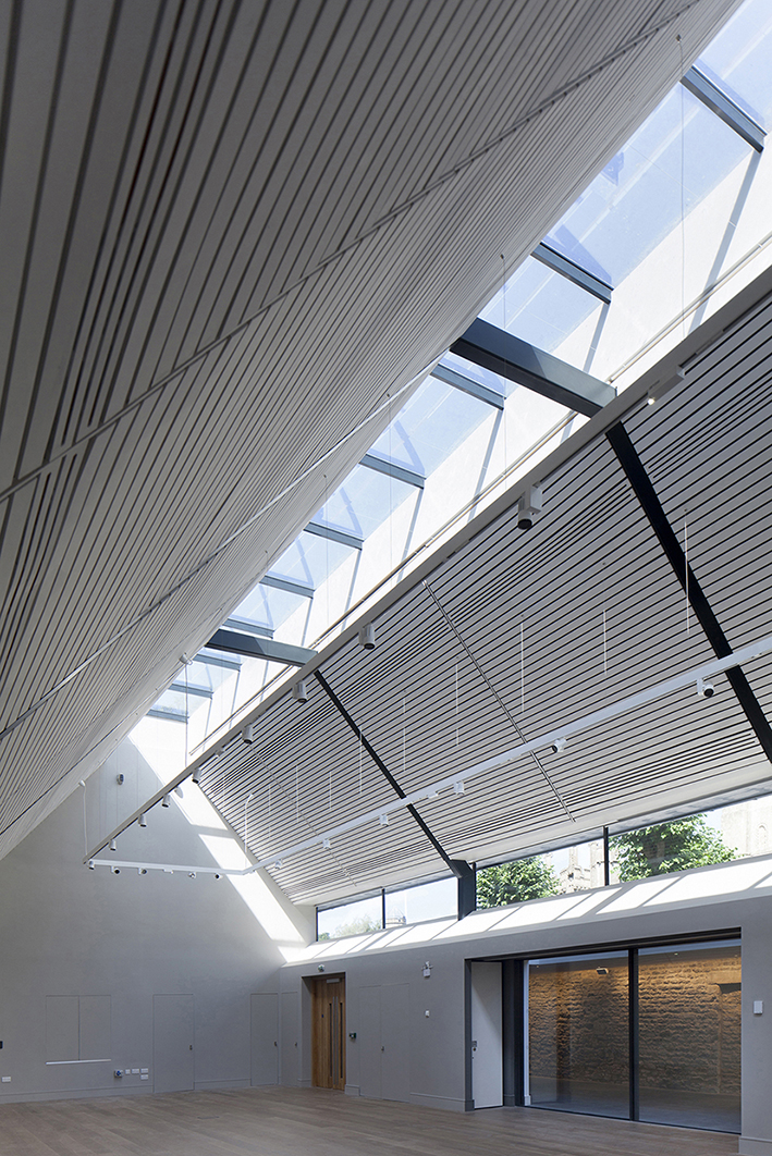 St.John the Baptist Church in Burford undertook a bold new redevelopment project at Warwick Hall to unite the church and local community through the building of a new community facility. The brief was to sensitively but substantially extend and adapt the listed building to provide a new hall flexible enough to meet the wide ranging needs of today’s end users. The challenge was to deliver a new confident community facility within one of the most historically sensitive church building settings in the Cotswolds. The design ethos was to reaffirm the significance of the original range by removing later extensions and to then rebuild in a manner that respected this unique setting. To minimise the impact of these new facilities the massing is split into a cluster of smaller structures expressed and clearly separated from the original Hall. These solid stone elements protrude sensitively from behind the churchyard wall but are set back to allow the Warwick Hall gable and churchyard wall to dominate the boundary. A clearer hierarchy of old and new is generated. Access is relocated to the heart of the building to provide level access and allows the old hall to return to its original proportions. By re-orientating the building towards the churchyard a new dialogue between the church and the Warwick Hall is created. Traditional materials are fundamental but these textures are complemented with contemporary structural glazing and zinc cladding, and detailed in a manner to ensure the building reflects its use and expresses its inclusivity. A ground source heat pump heating and cooling system for the building reduces energy consumption. Described by the Bishop of Dorchester as this communities ‘gift’ to Burford the building is unashamedly of its time but crucially sits comfortably within what must be one of the most picturesque churchyards in the country.