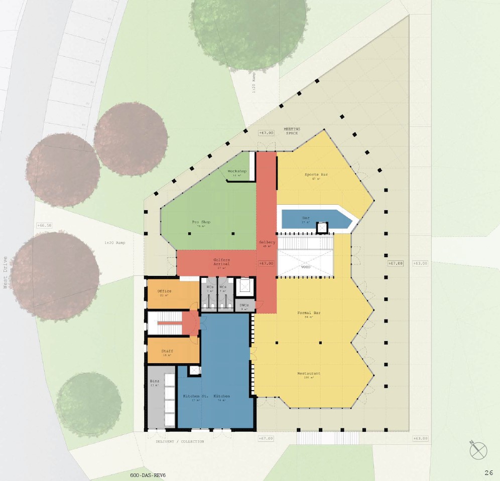 Calcot Park Golf Club need to modernise their clubhouse to deliver top-class golfing services from a state-of-the-art facilities. Year-round golfing would be offered through the provision of swing rooms with digital tracking to allow simulated play on the world's finest courses. Modern changing facilities, as well as bars and restaurants built to cater for specific user needs will make the clubhouse accessible for all and encourage greater engagement from currently under-represented demographics including women and children. The neighbouring building is Grade II* and the landscape is essential to a successful proposal. Colony designed a new clubhouse where the services are placed below ground, reducing the visual impact and providing spectacular viewing angles of all the major holes.