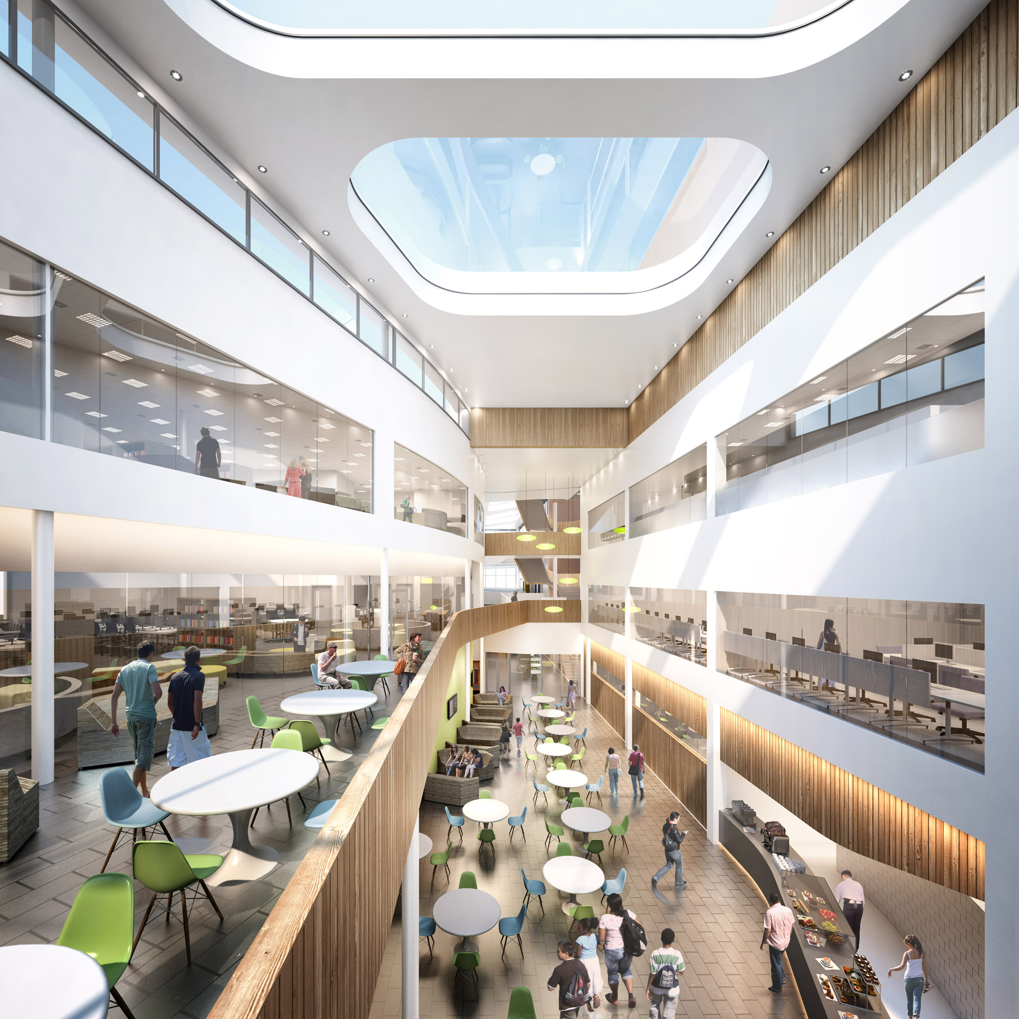 Davenport Architecture Ltd were appointed with Pearson Fraser Ltd to carry out a master plan appraisal for South Downs College, with a view to rationalising the existing campus and providing a long-term estates strategy. The first phase of the plan was the creation of a new building to house a CEDEC, which would be the home of Science, Engineering and Construction. The building was designed in two half's. The new CEDEC building was designed to work as a standalone scheme with a full height central atrium, using natural ventilation and creating a new exciting and inspiring entrance to the campus. The second half of the design would replace a large portion of the existing accommodation across the campus, allowing the estate to be rationalised. This second section would house the main Student Services, Refectory, Catering and Learning Resource Centre. The two halves are linked via the central atrium spaces, pulled together around a new student hub which would become the heart of the campus and provide a catalyst for future development.