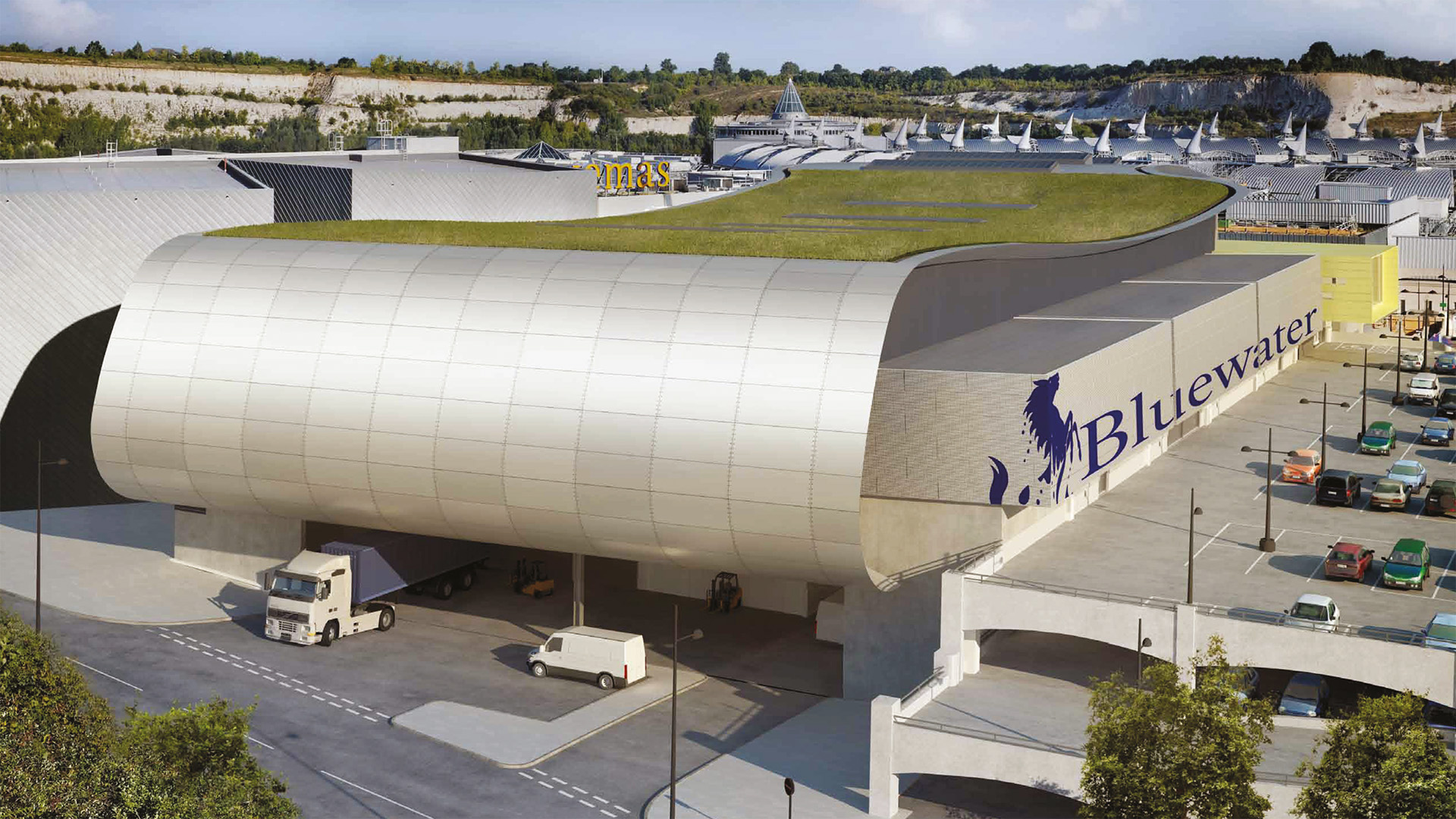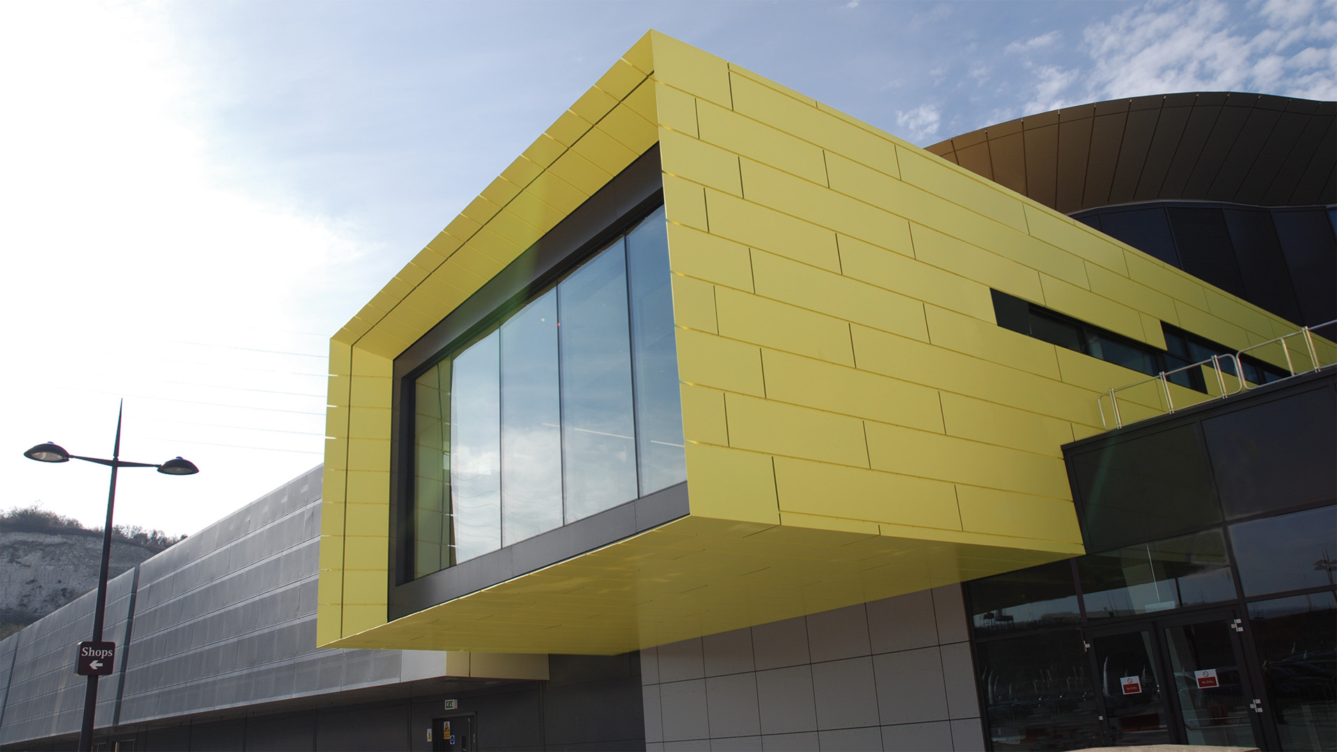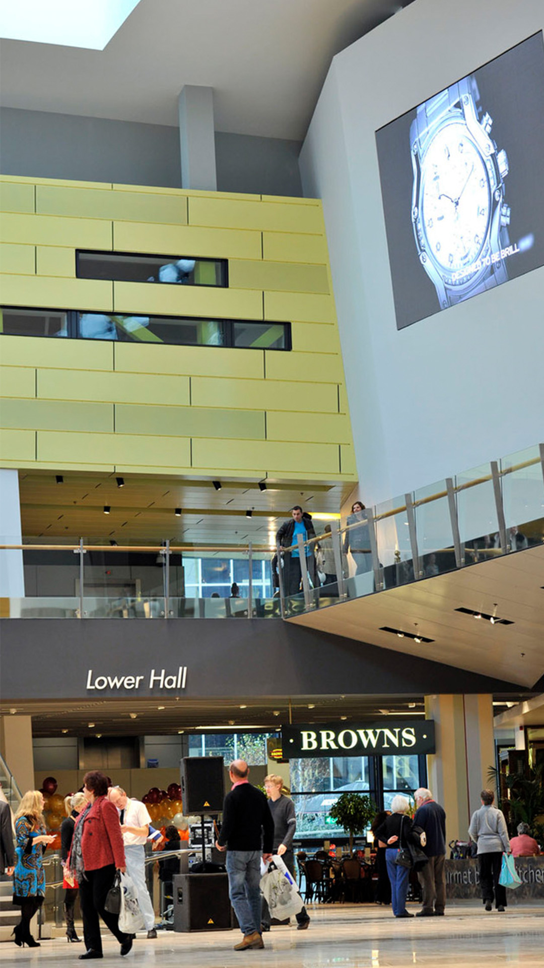 Denton Corker Marshall was selected by developer Lend Lease as Architects and Lead Designers for their 5200m2 Exhibition and Venue Building at the Bluewater Shopping Centre in Kent. This innovative building is described as a “retail event venue” and acts as an added guest attraction to the shopping centre. The Exhibition Halls are linked to the existing mall circulation by a dramatic new double height Restaurant Plaza. The exhibition areas are in two main Halls over two levels. This stacking approach was developed to generate the most usable space within the constraints of the site and maximises the amount of floor area available. The main Upper Hall is 80m long and 40m wide with a clear minimum height of 8.3m to the underside of the roof trusses. The Lower Hall is 70m long and 30m wide with a clear height of 5.2m. The Halls are linked by public stairs and lifts with most events combining both levels to create an exciting and exceptional guest experience. The Halls are also designed to be highly flexible and are technically capable of accommodating an extensive variation of events and exhibitions. The VIP lounge is a feature ‘Gallery Beam’ that is designed as an architectural ‘hinge’ between the Exhibition Halls and the Plaza space. This elongated bright yellow box pierces through the envelope and projects into the adjacent carpark acting as a beacon for the new building. It has views to both the Upper Hall and the Plaza and has become a destination venue for private functions and wedding receptions.