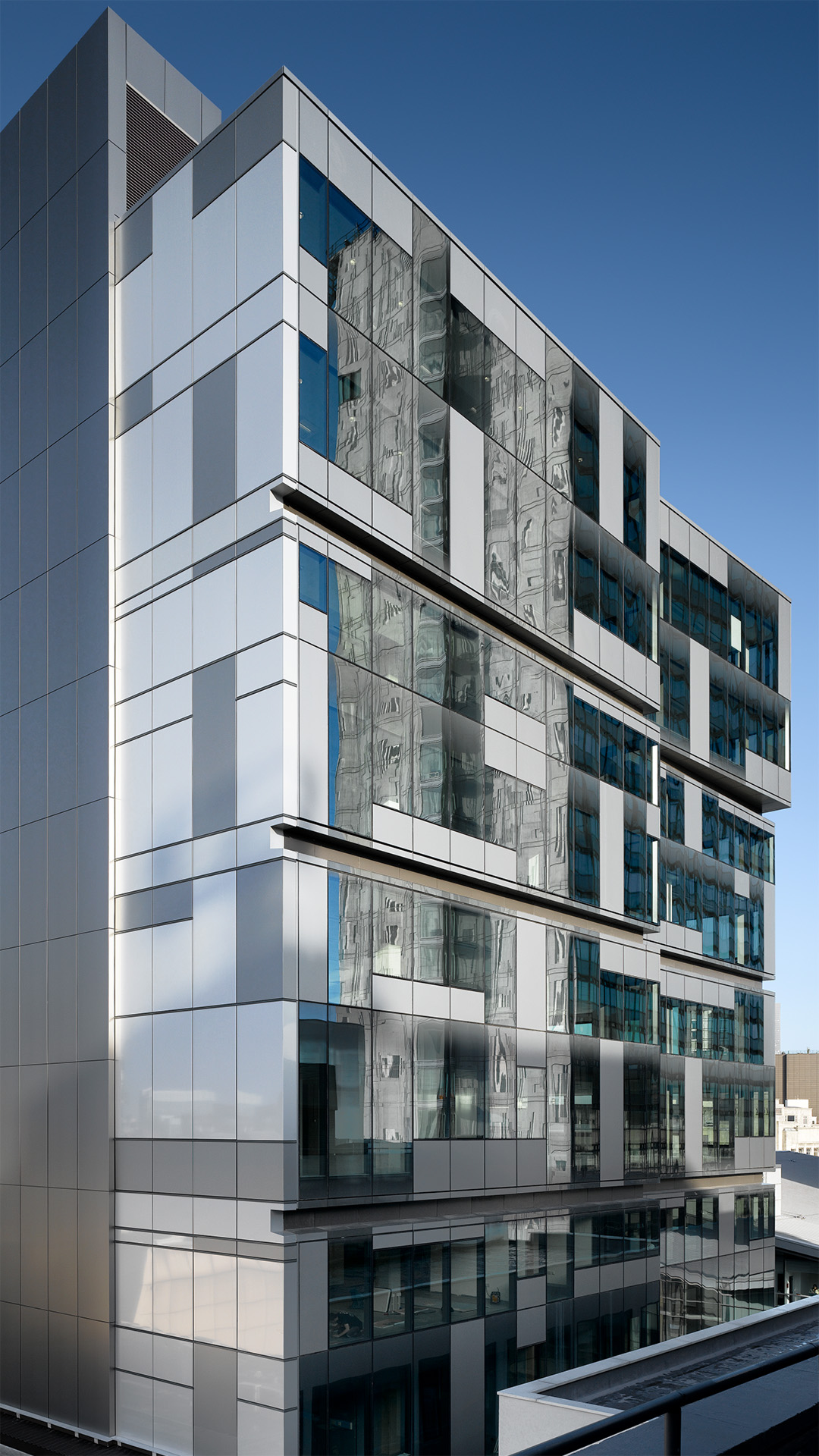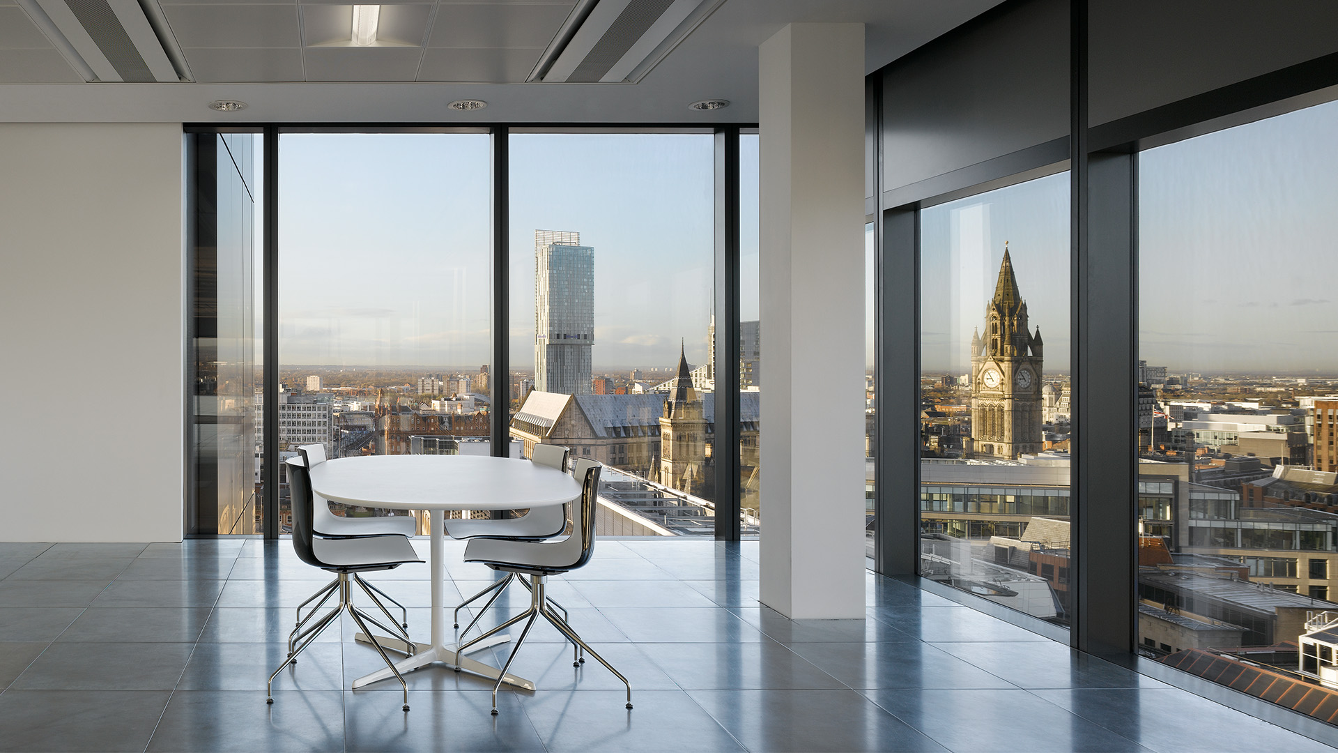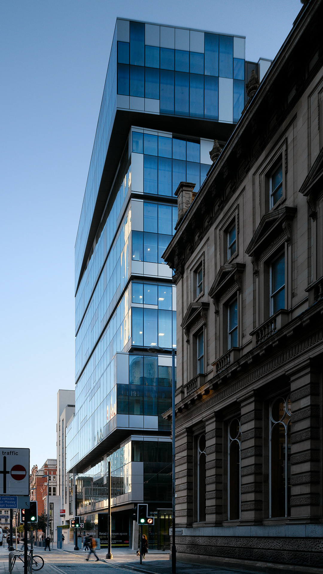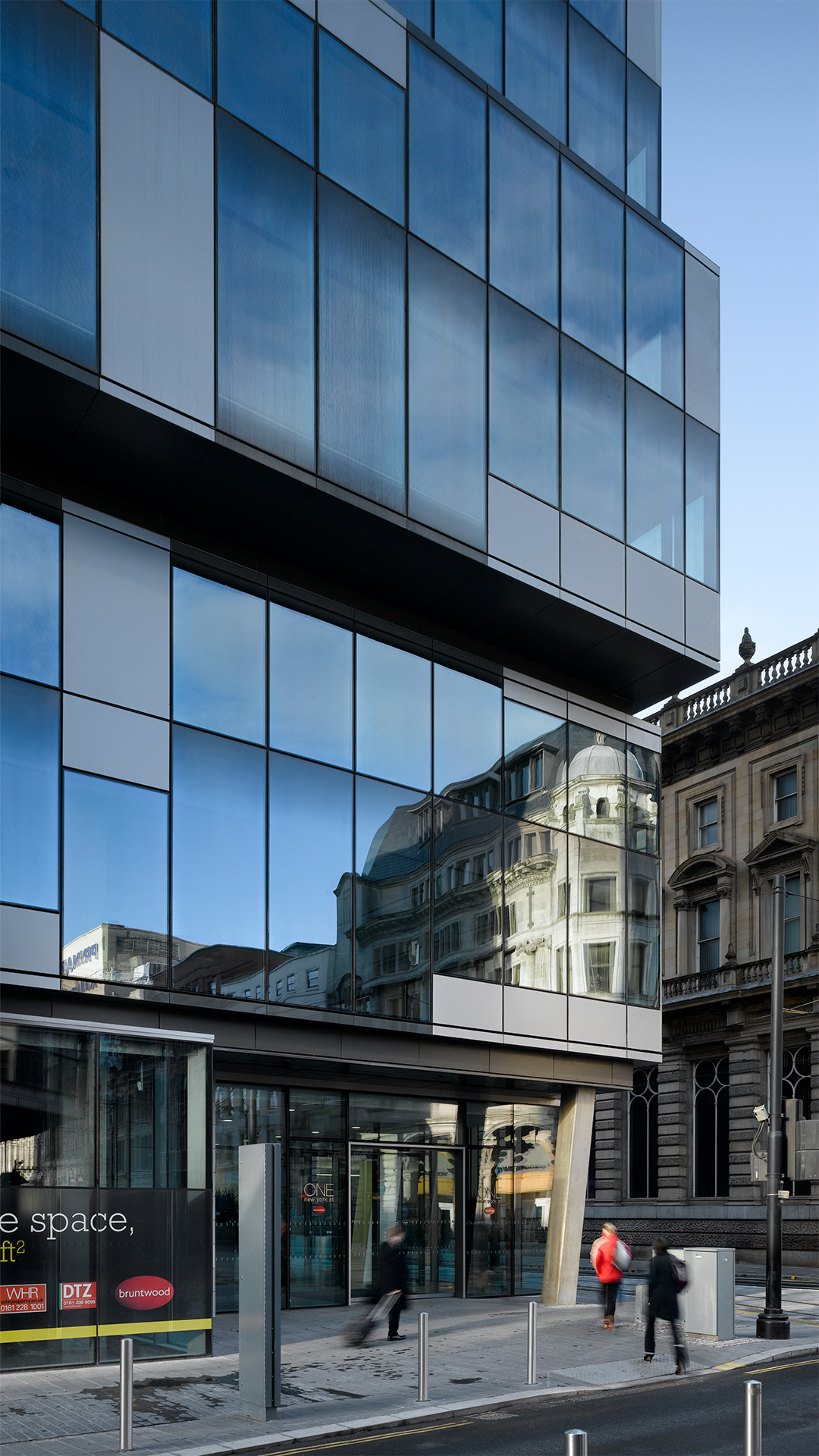 Located at the corner of Mosley Street and New York Street in Manchester city centre this 13 storey development provides over 10,000m2 of exceptionally high quality office accommodation. It was the first new build property by Bruntwood, the largest regeneration property development company in the north west. The building design sets out to create a dynamic impact at cityscape level. The architectural form consists of double storey glass and metal boxes which are visually separated and are positioned to offer the illusion of ‘sliding’ in and out of the main building envelope. These ‘sliding’ boxes are stacked up to form the massing of the building and provide an intriguing design approach to turning the corner in a city context. The two storey overscaling of horizontal elements emphasises the simplicity of the building block aesthetic and also provides a powerful focal point when viewed from Piccadilly Gardens. The building has become a landmark in the city centre and has helped to establish Bruntwood as a key player in the realm of new build commercial developments. The project achieved an Excellent BREEAM rating.