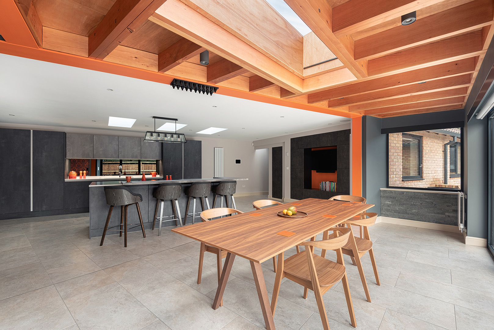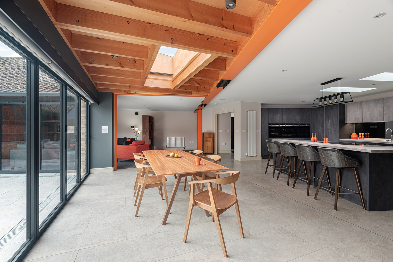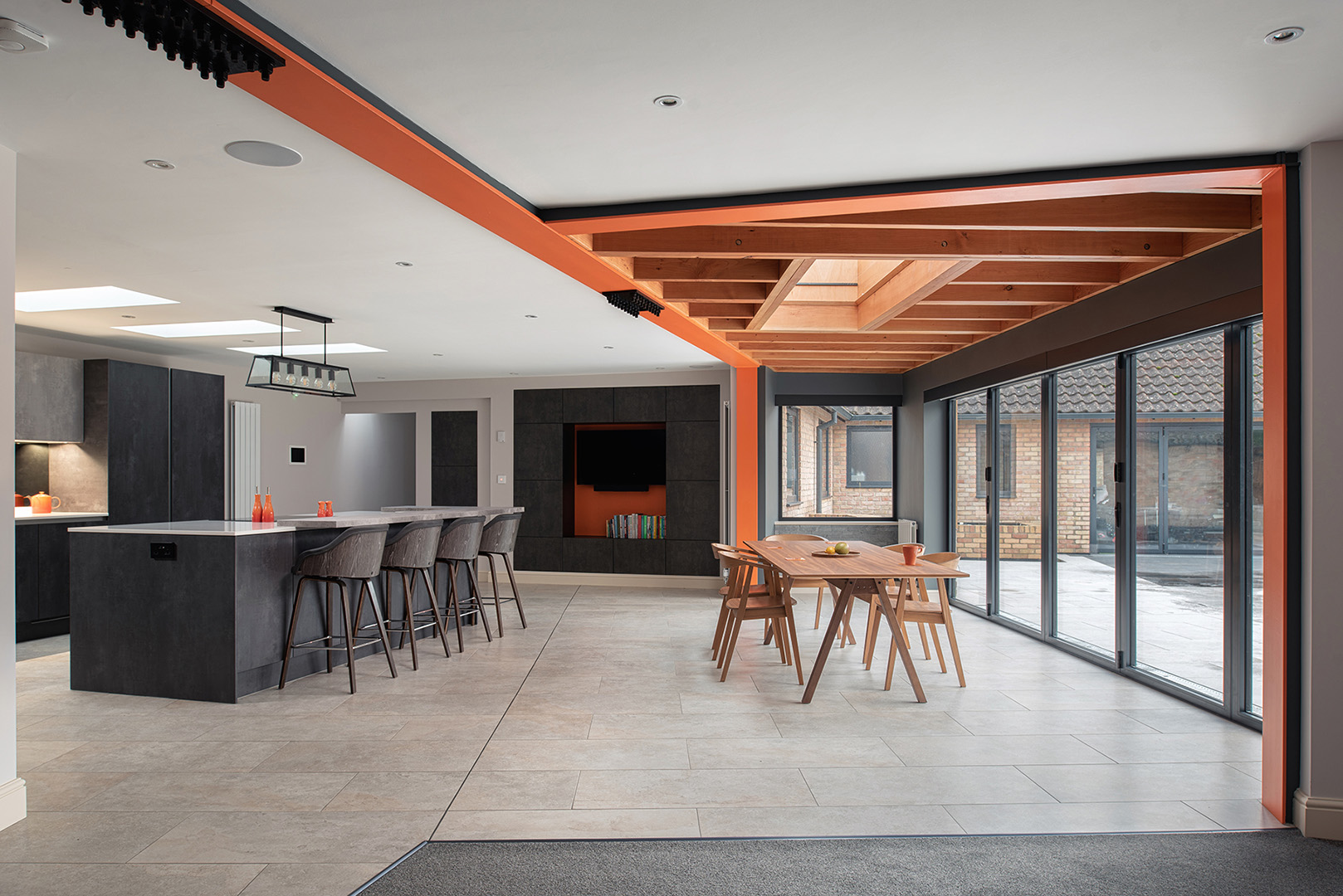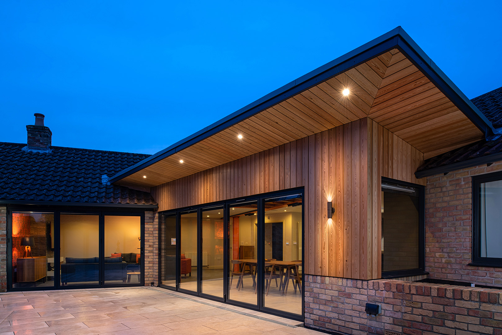We were approached by a private client to review schemes that a local ‘Architectural Design’ firm had completed, and to offer an alternative creative and imaginative approach to extending and adapting the existing bungalow. Our approach of design over simple box additions were what attracted the client to approach us. The client is restricted in movement and is wheelchair-bound so the first part of the brief was not flexible – he must be able to move freely around the property and designed to his specific requirements. Second, to this, the designs must improve the aesthetics of the interior and exterior. The designs we created pushed the brief around extending the property to gain a larger kitchen and dining space yet opening up the living room space fully. Third, the courtyard and most of the elevations face south so we needed to shelter these large openings from the summer sun and whilst dropping natural light into the interior to make it fresh and bright. We explored the position of the kitchen, how the dining area needed to give the flow through and around these spaces, and how to create pockets of areas that were for quieter times for just sitting and working. In addition, we have agreed with the client’s requirement of making all external doors flush and level to the garden so this external courtyard space could be accessed. This project has then created a unique extension and now accessible smart home for the client to fully enjoy.
