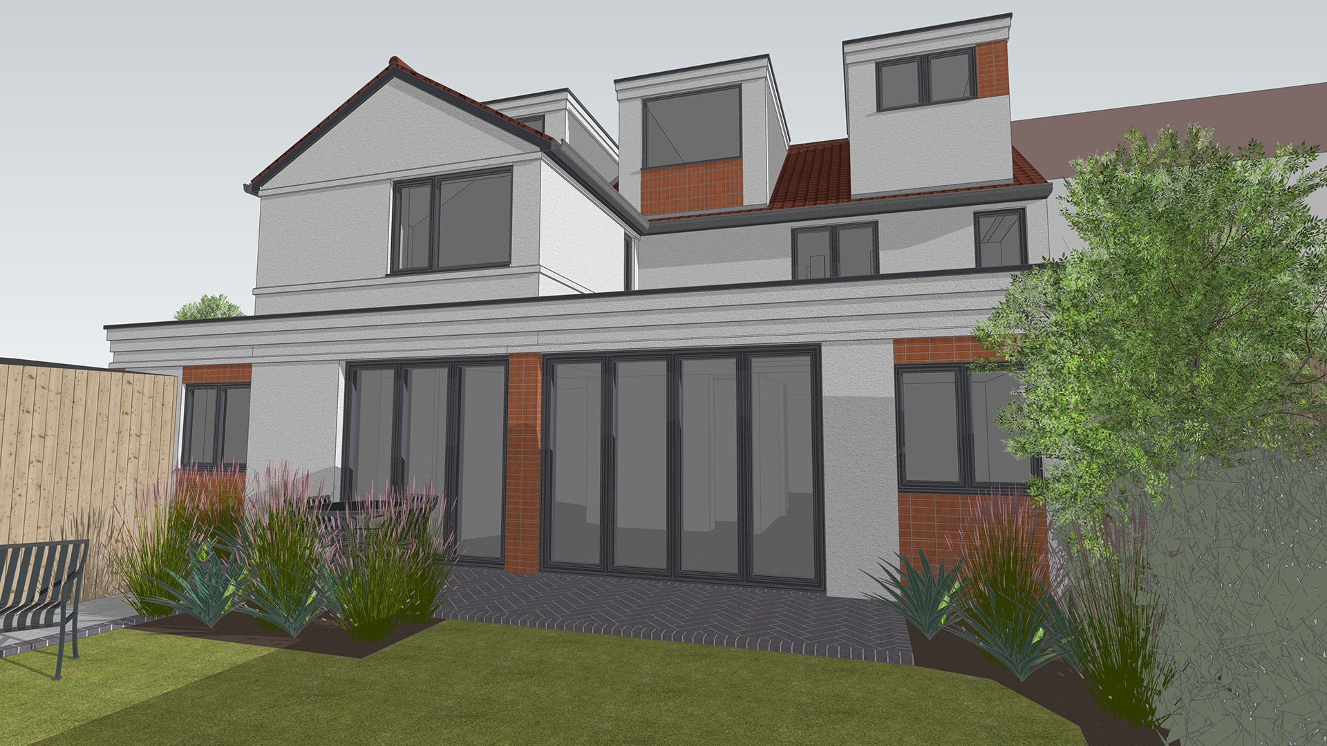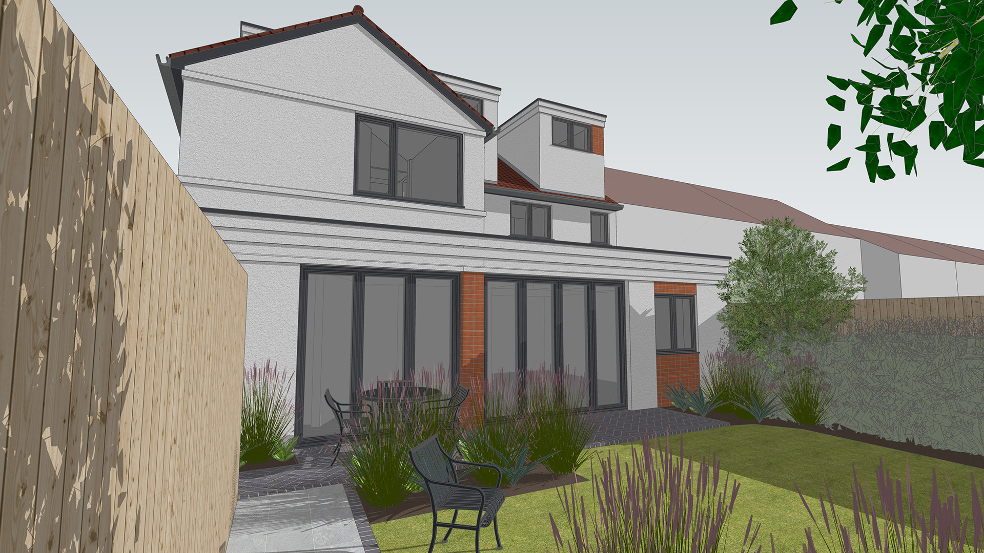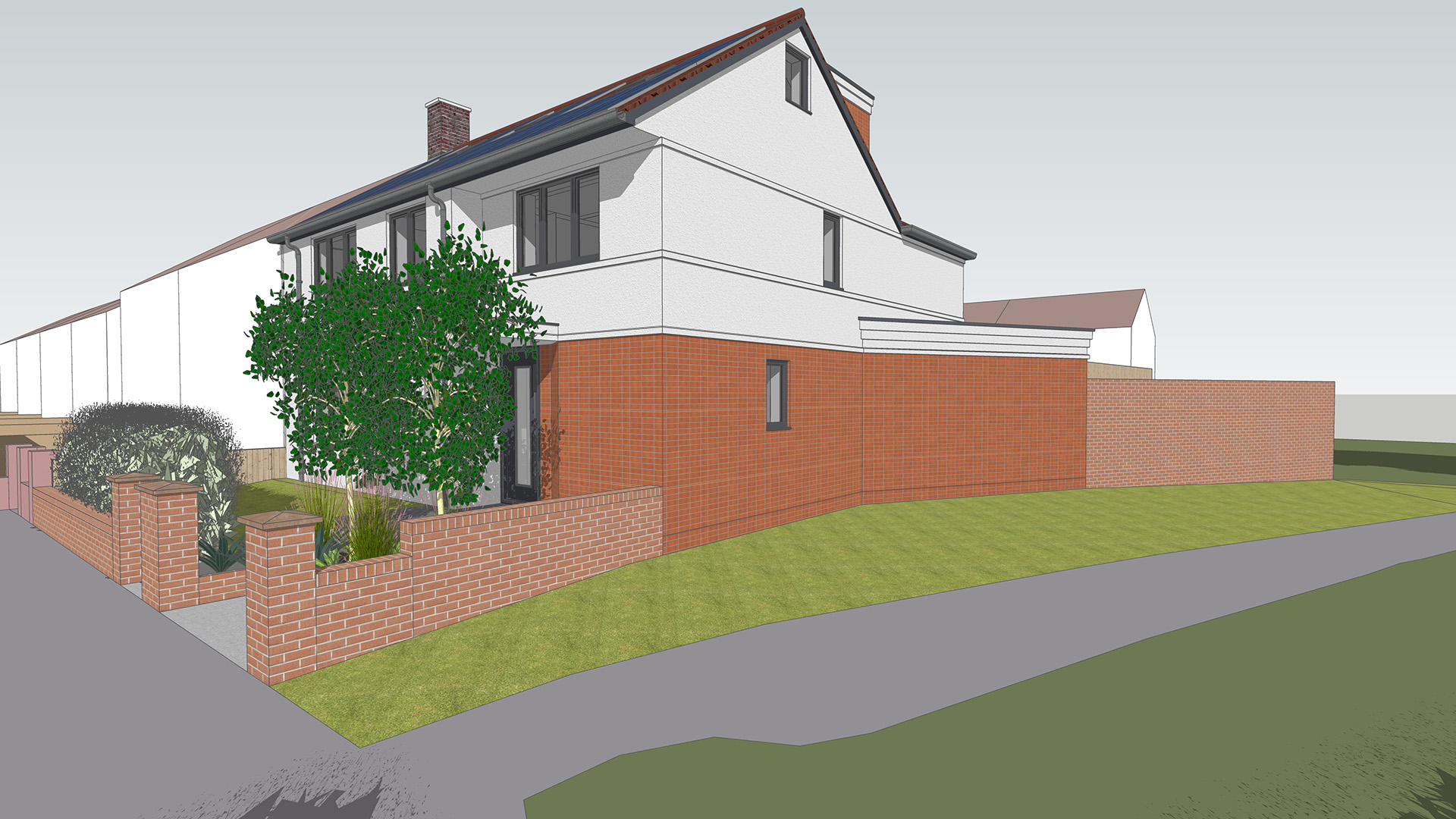 Project Location: Liverpool, Merseyside. The practice has designed a side two storey extension, single storey rear extension, and dormer loft conversion as a whole project to extend and refurbish this 1960s / 1970s Unity Type 2 house. The property is an end of terrace house that is at the end of cul-de-sac adjacent to the River Alt. The project provides two three extra bedrooms within the extended property to allow their family to fully enjoy the house. The scheme includes for the re-cladding of the existing and creating a homogenous scheme throughout the whole site in a white render, red brickwork, pitched roof, and green sedum flat roofs.