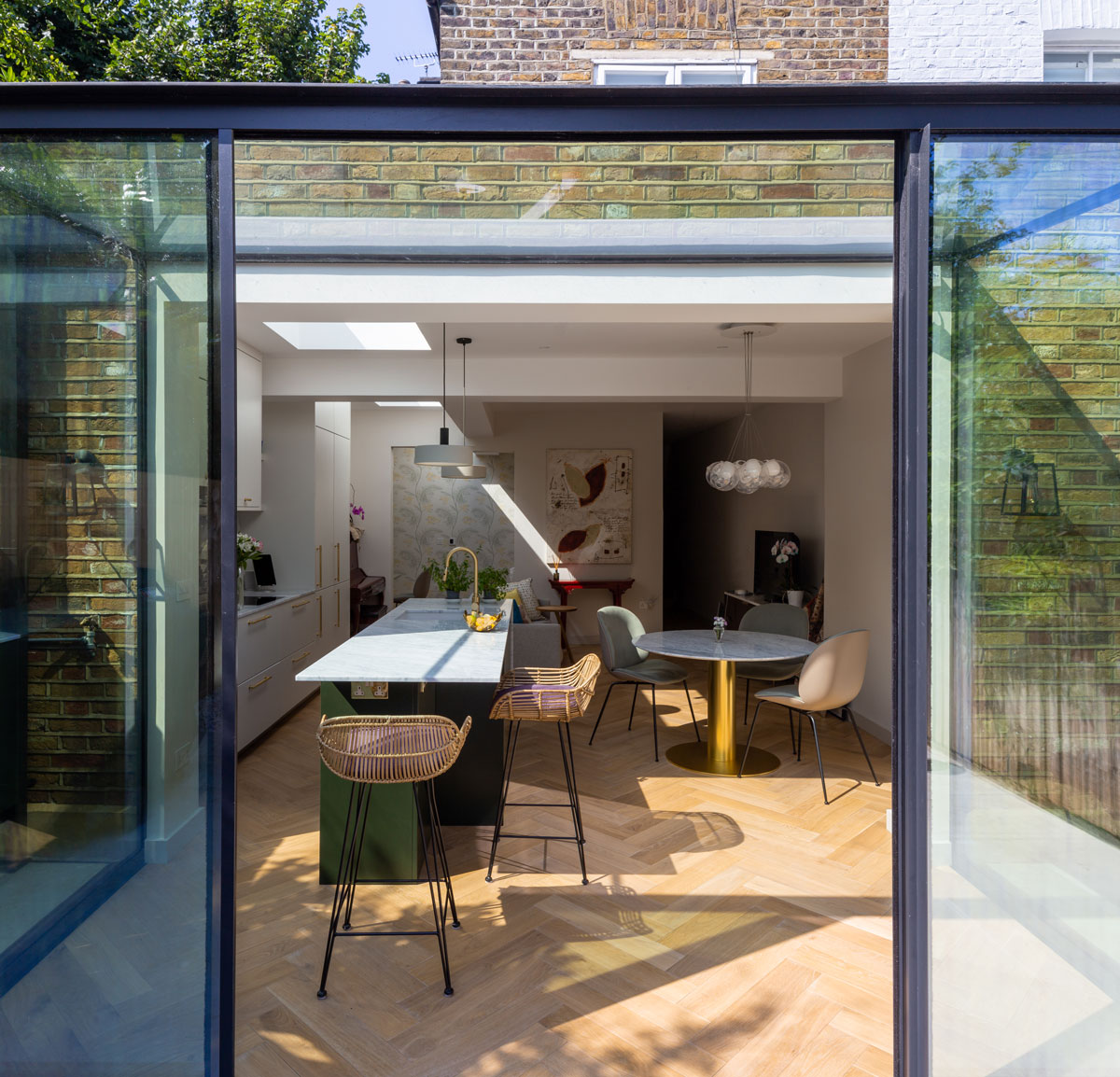 Remodelling, full-refurbishment and extension of a ground floor flat within a Victorian end-of-terrace property in North West London. The scheme creates an open-plan living space with a glass-box conservatory providing uninterrupted views into the garden. The whole flat was extensively refurbished, with lowered floors, new heating and electrics, new windows and doors, and new fixtures and finishes throughout. DMCA Architect's provided a full architectural service, from initial concept studies, through to handover, working closely with the Client occupier, other consultants and the Contractor. Design Stages: Stages 1-6 | Date: 2020-2021 | Contract Value: Approx. £250,000 | Contract: RIBA Domestic Contract Contractor: Pro Home Construction Ltd. Structural Engineer: SD Structures Party Walls: The Party Wall Collective Interior Design: Day True Garden Design: Sam Fuller Landscape Photo Credits: 1, & 2 © chromaphotography.co.uk